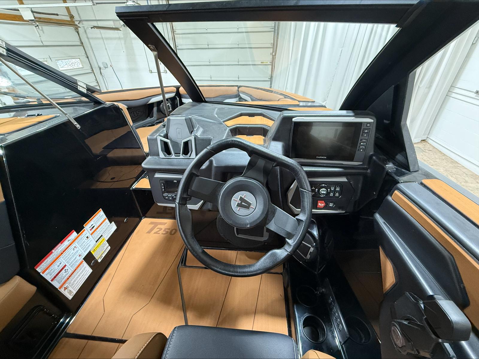 The 2025 Axis T250 comes loaded with special features designed to enhance your boating experience and maximize enjoyment. The Ebony-Speakers – Wet Sounds Rev 10 (1 set) deliver crystal-clear audio, ensuring your favorite tunes set the perfect mood for every outing. The Battery Set Up – Option 2 provides reliable power management, keeping your electronics running smoothly throughout the day. The CS Bimini Dual Coverage with surf straps and rope pockets offers versatile shade and convenient storage for your gear, while the depth finder helps you navigate safely and confidently.The driver’s seat is equipped with a flip-up bolster, allowing for optimal visibility and comfort at the helm. The Zero Off GPS Cruise and Compass system ensures precise speed control and navigation, making it easier than ever to maintain the perfect pace for skiing and wakeboarding. The AW20 Shock Package enhances ride comfort, absorbing bumps and vibrations for a smoother journey. The Edition-Core package adds a touch of luxury and style, while the soft-grip flooring provides a comfortable, non-slip surface for all passengers.