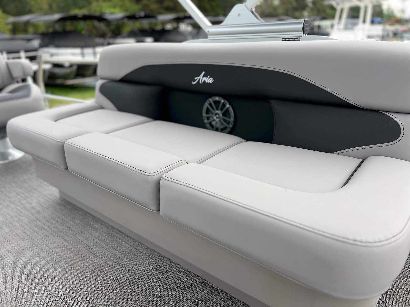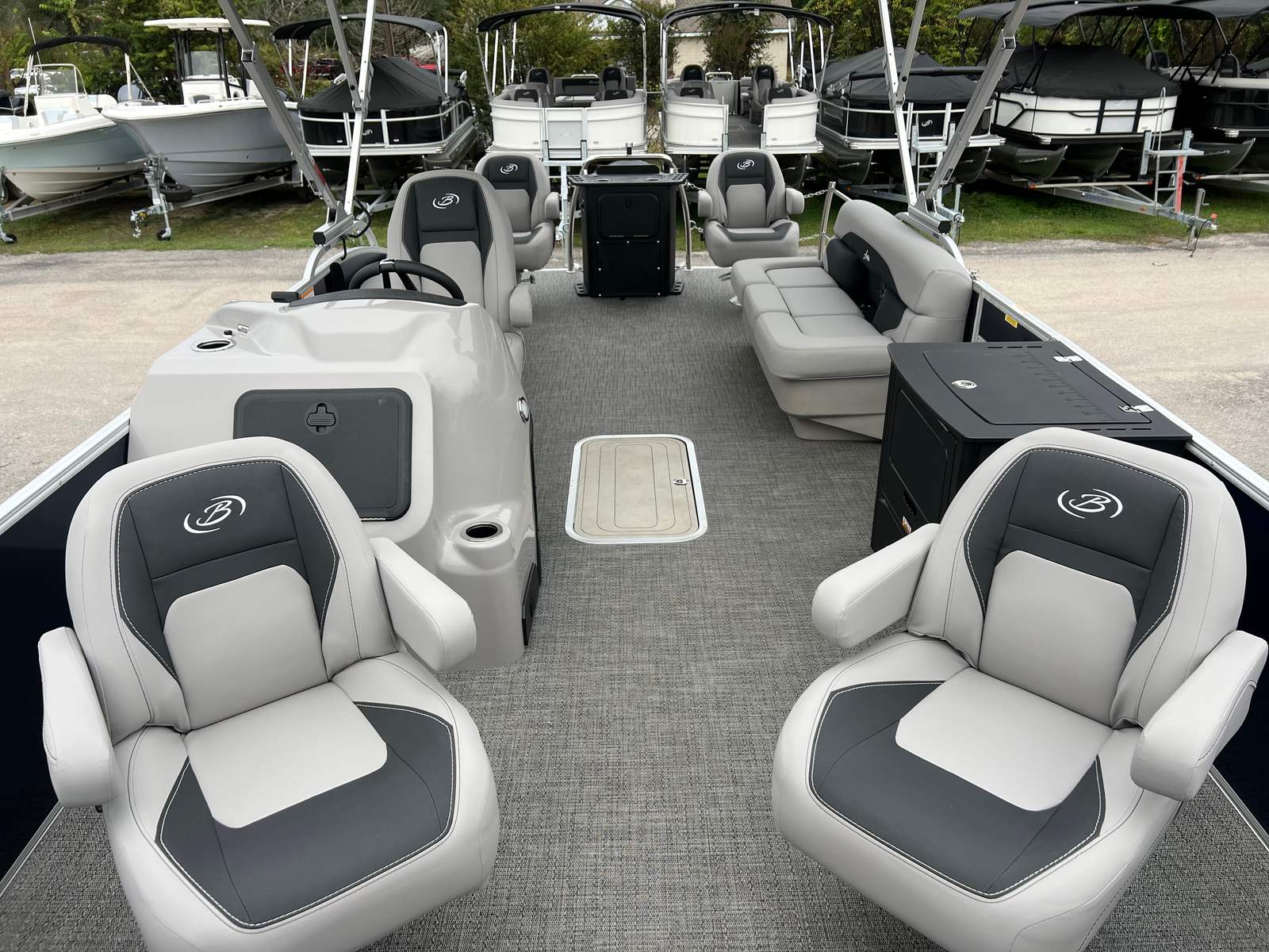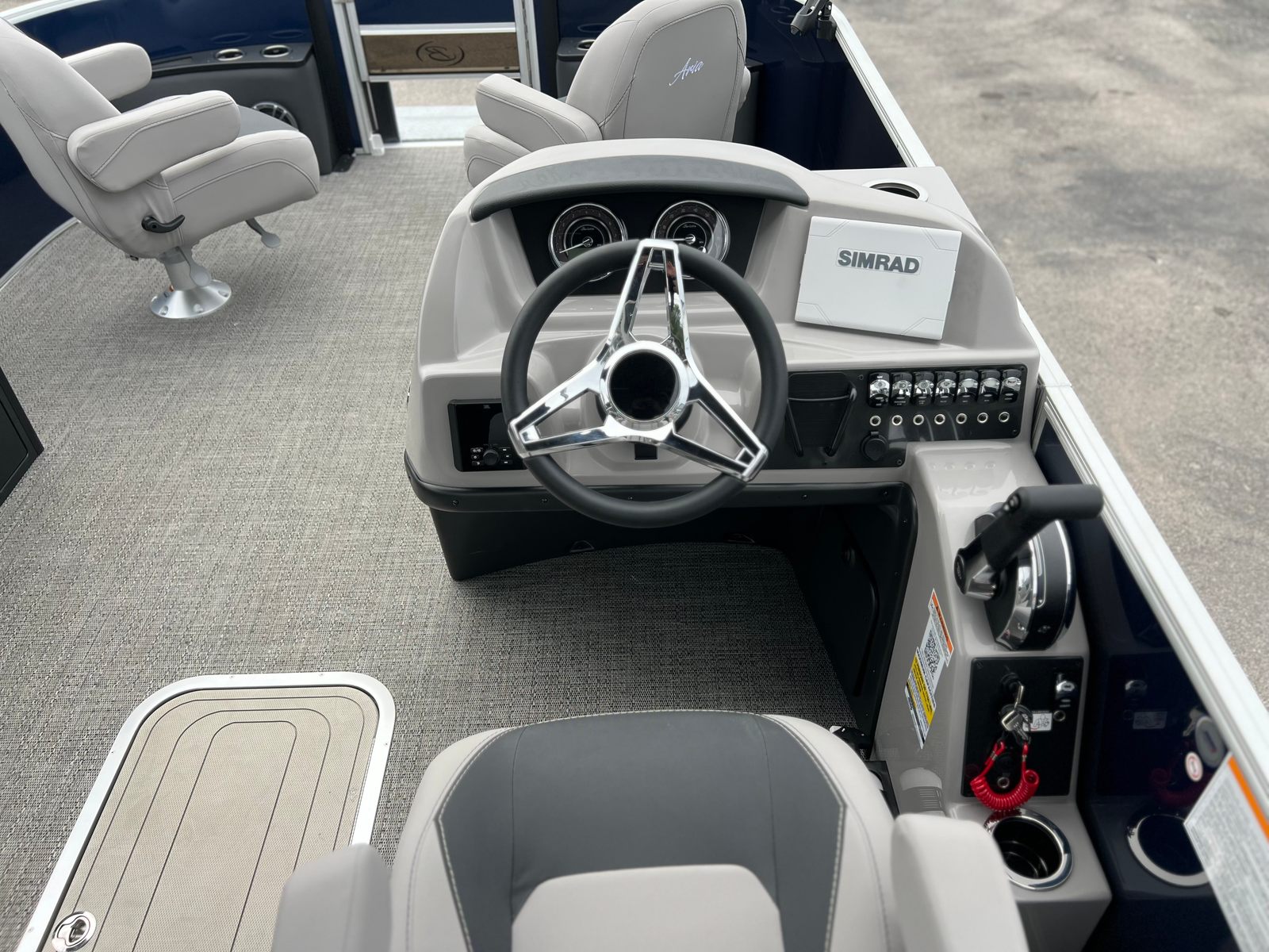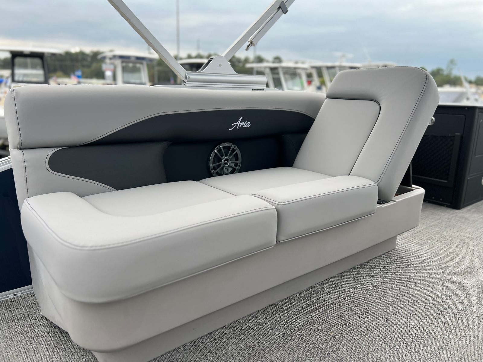 The 2025 Barletta Aria A22F is loaded with features designed to enhance your boating experience. The Triple Toon Package Aria provides added stability and buoyancy, ensuring a smooth and comfortable ride even in choppier waters. The Amore Gray flooring is not only stylish but also easy to maintain, offering a sophisticated look that complements the Tempest Gray furniture. The helm is equipped with a Simrad 7 G07 XSE, providing advanced navigation and control at your fingertips. The Blue Sapphire Railskin adds a touch of elegance and modern flair, while the Metal Jacket Protectant safeguards the exterior from the elements, preserving the boat’s beauty for years to come.