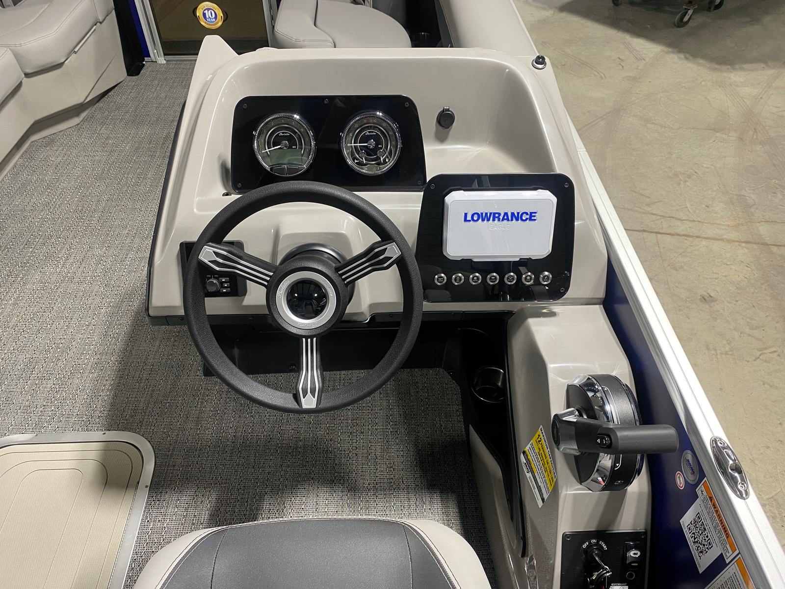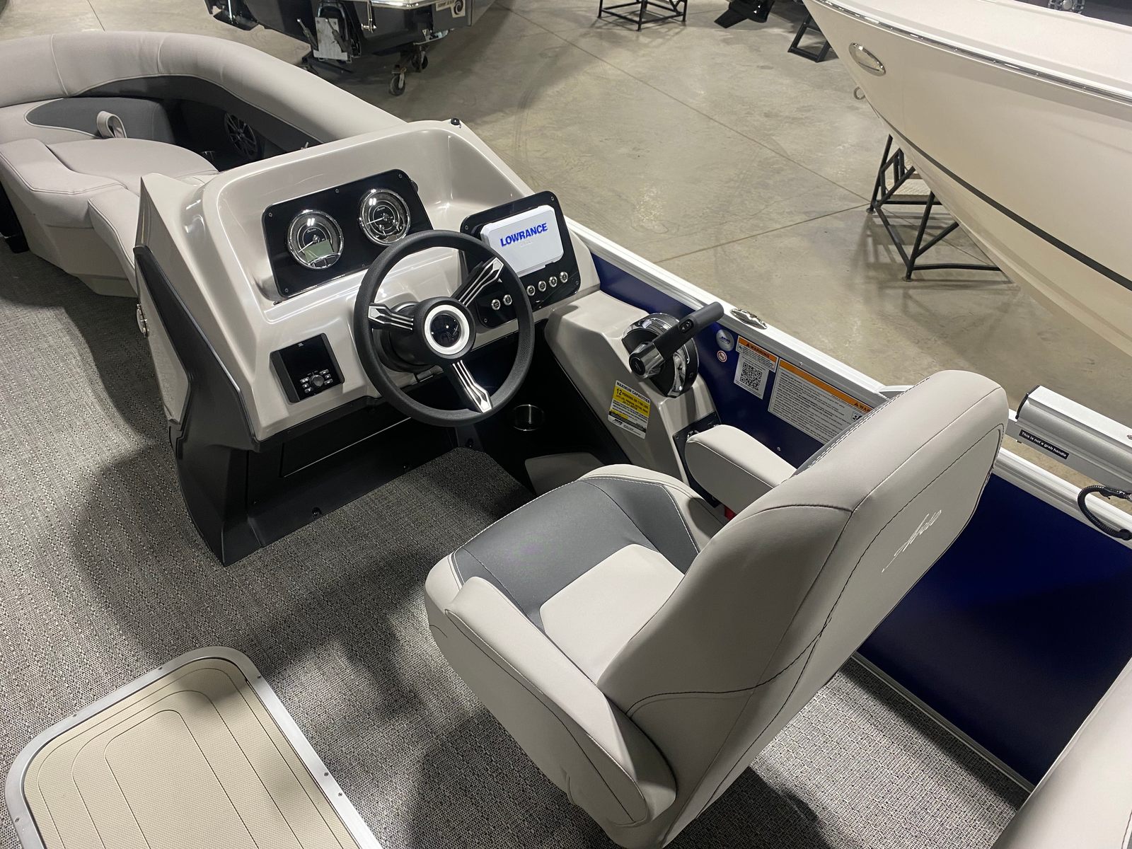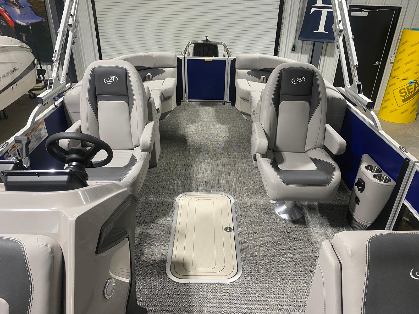 The Barletta Aria A22QC is loaded with special features designed to maximize comfort, convenience, and enjoyment. The Bohemian Blue Railskin color gives the exterior a vibrant, modern look, while the Tempest Gray furniture and Amore Gray flooring create a luxurious and relaxing interior. The Triple Toon Package Aria adds an extra layer of stability and buoyancy, making this pontoon perfect for larger groups and active outings.For those who appreciate thoughtful details, the stainless steel flag pole with an American flag adds a patriotic touch to your boating experience. The in-floor midship storage (available with the Triple Toon Package) provides ample space for gear, water toys, and personal items, keeping the deck clutter-free and organized. The helm is equipped with the Eagle 5 GPS, offering advanced navigation capabilities to help you explore new waters with confidence.
