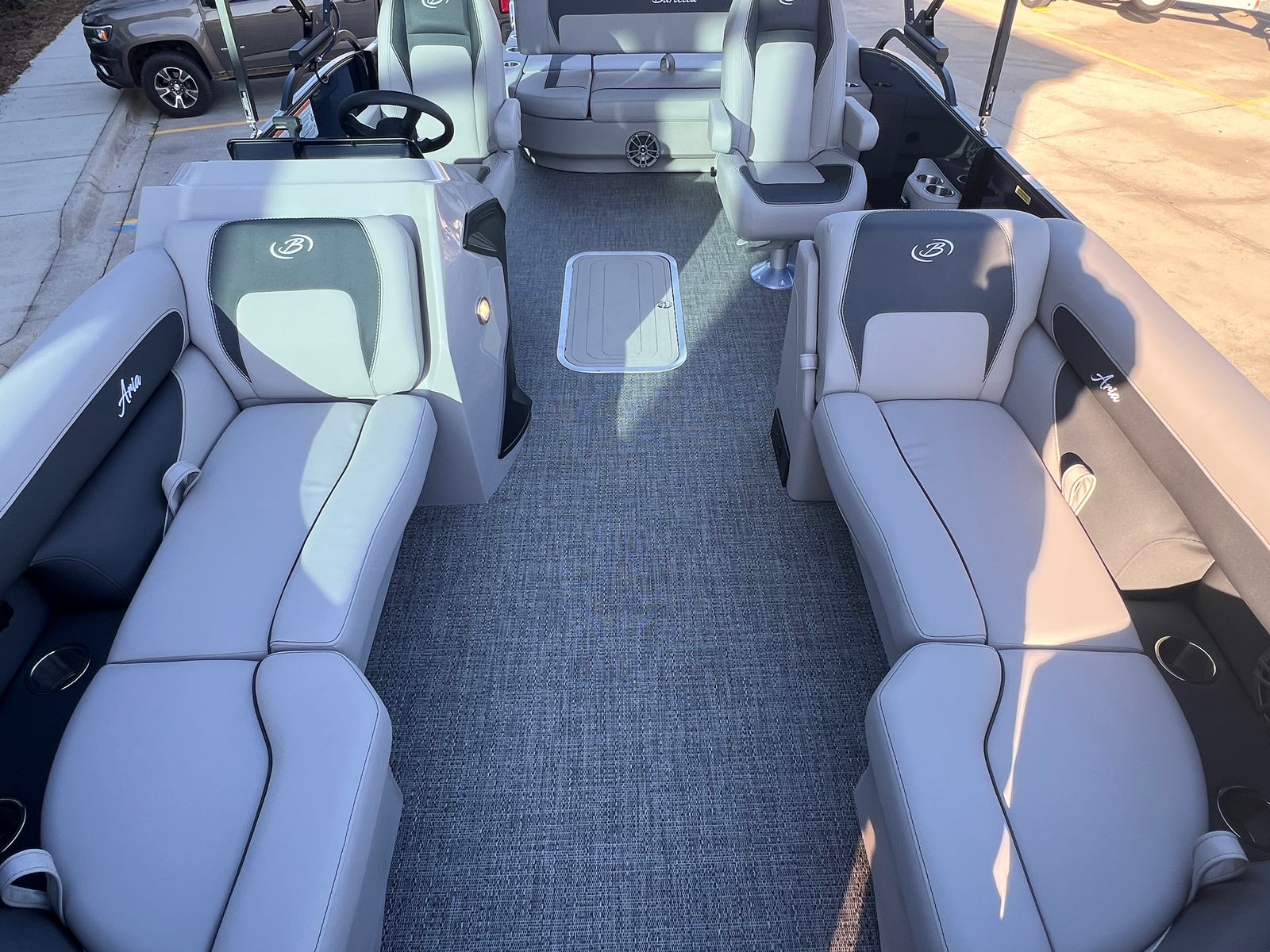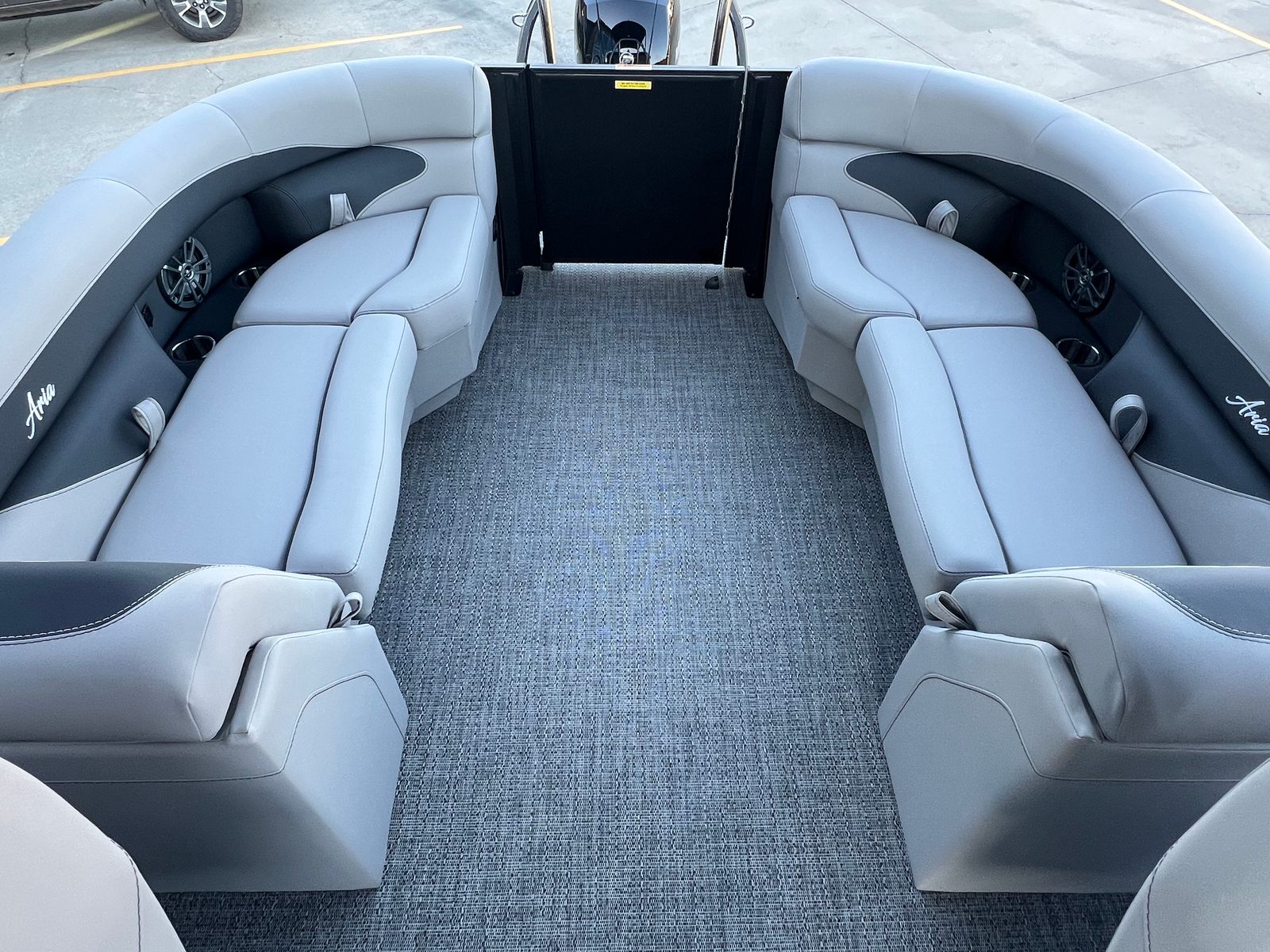 The Barletta Aria A22UC-Platinum is packed with features that elevate your time on the water. The Railskin Color Aria in Blue Sapphire, complemented by the Railskin Accent Aria in Winter White, creates a striking visual appeal that is both modern and timeless. The Blackout Package Aria adds a touch of sophistication, giving the pontoon a bold and distinctive look.Step aboard and you are greeted by Tempest Gray furniture, designed for both comfort and style. The plush seating invites you to relax and unwind, while the Amore Gray flooring provides a soft, slip-resistant surface that is easy to maintain. The Triple Toon Package Aria enhances stability and buoyancy, making this pontoon ideal for a variety of water conditions.A clipped playpen cover with poles offers protection from the elements, ensuring your boat stays in pristine condition when not in use. Every detail, from the railskin accents to the flooring, is thoughtfully chosen to create an inviting and luxurious environment.