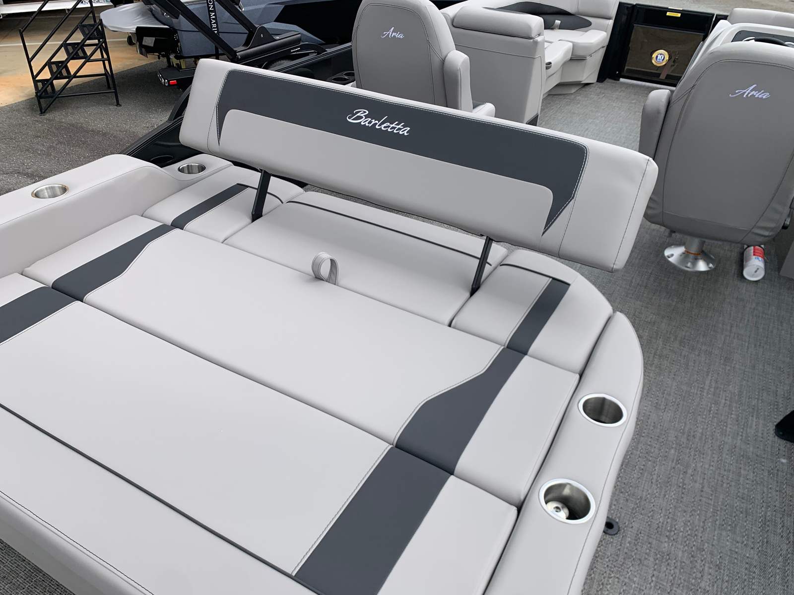 Step aboard the Barletta Aria A22UC-Platinum and discover a world of thoughtful features and high-end amenities. The flooring is finished in elegant Amore Gray, providing both durability and a contemporary look that complements the overall aesthetic. The Tempest Gray furniture offers plush seating and ergonomic support, ensuring that every passenger enjoys maximum comfort during long days on the water.The Blackout Package Aria railskin package adds a touch of sophistication and modern flair to the exterior, while the stainless steel flag pole with an American flag proudly displays your love for boating and country. The helm is equipped with a Simrad 7" G07 XSE, offering advanced navigation and control at your fingertips, so you can explore new waters with confidence.One of the standout features of this pontoon is the Triple Toon Package Aria, which enhances stability, buoyancy, and overall performance. This package also enables the inclusion of in-floor midship storage, providing ample space for all your gear, water toys, and essentials. With everything neatly stowed away, you can enjoy a clutter-free deck and make the most of your time on the water.