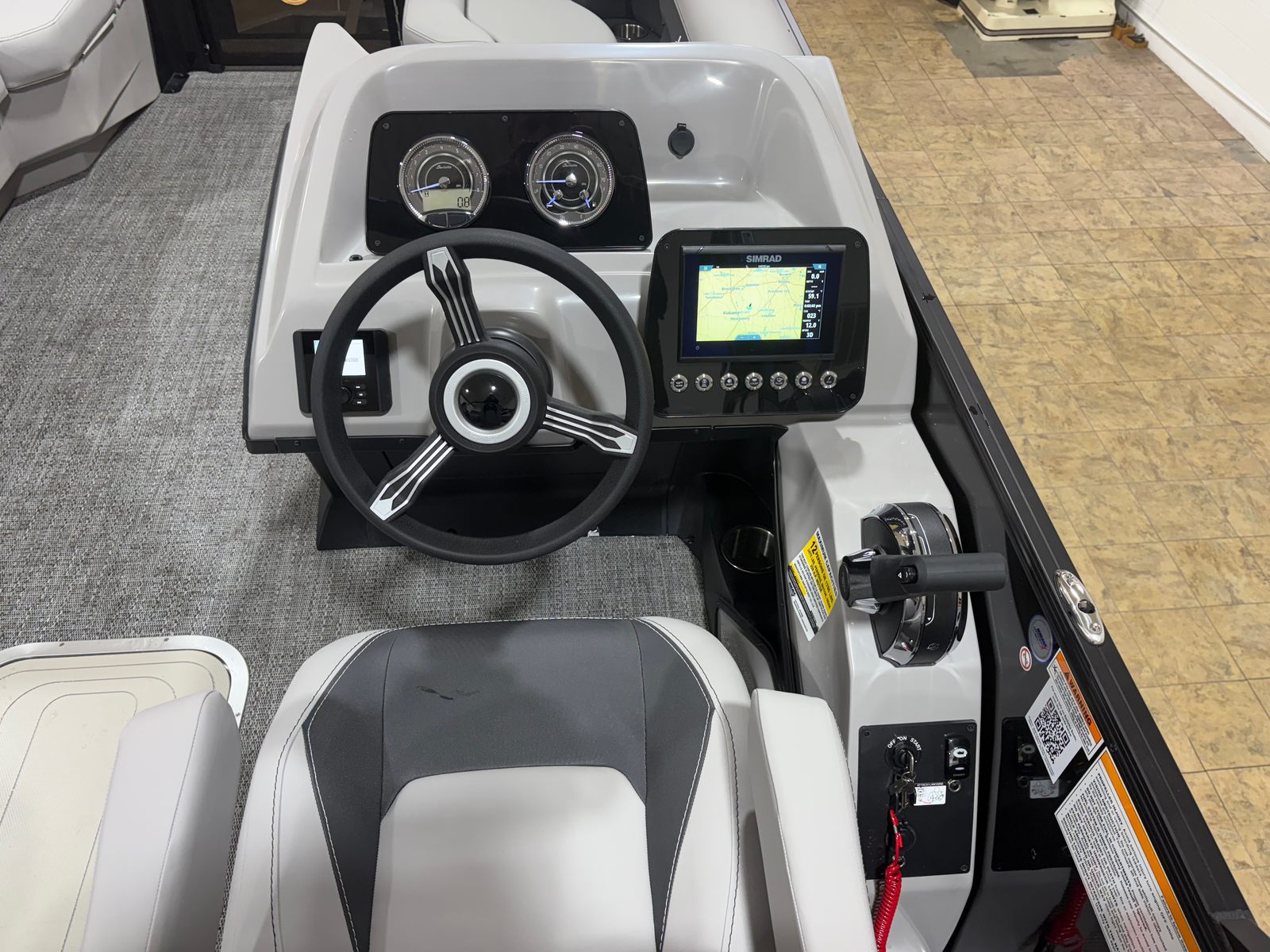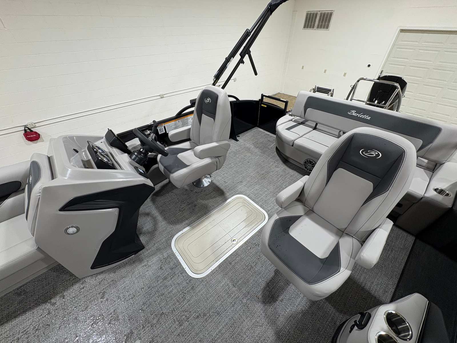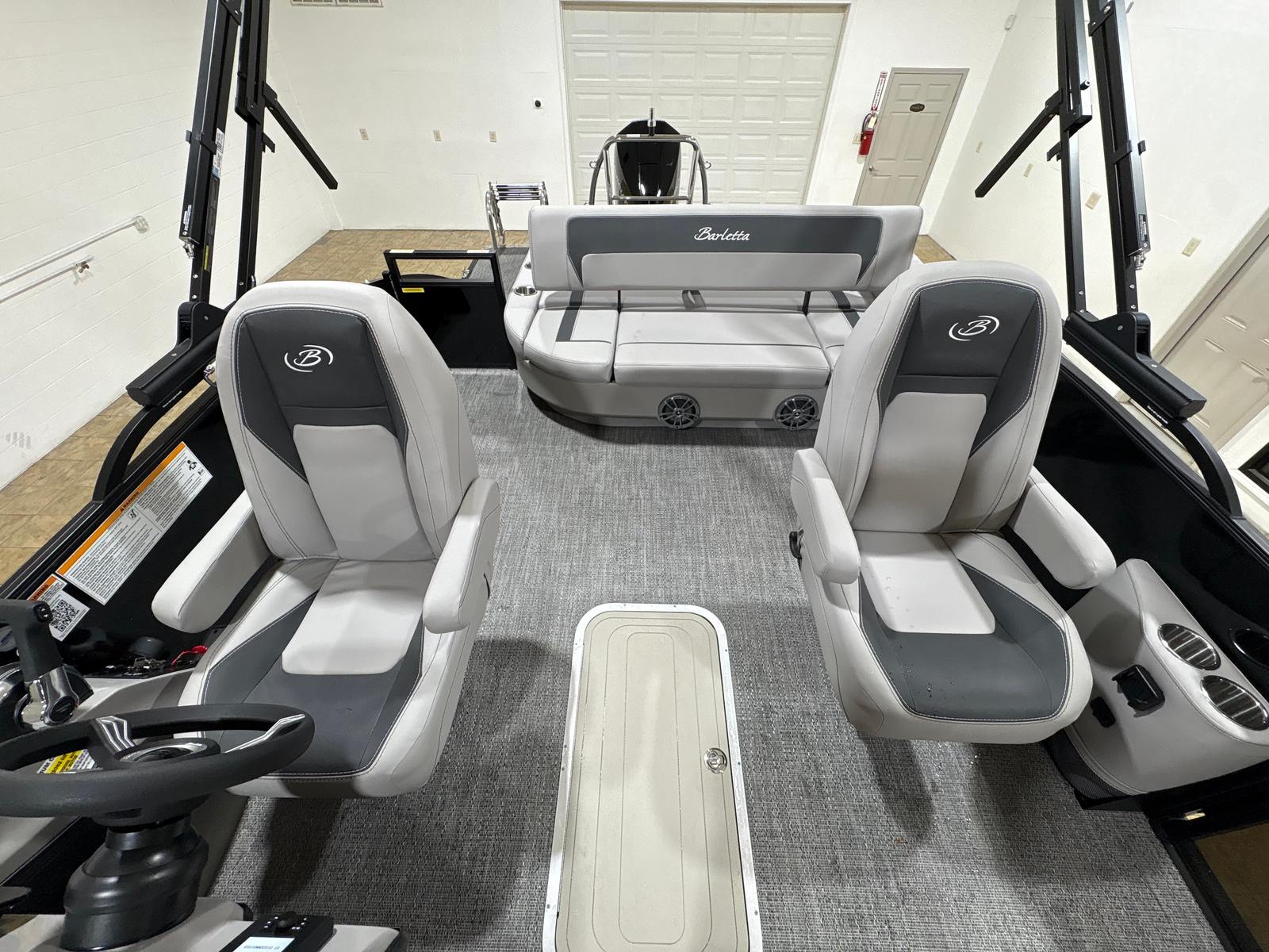 Step aboard and discover a world of comfort and style. The Tempest Gray furniture offers plush seating for family and friends, creating an inviting space to relax and socialize. The Amore Gray flooring is both elegant and practical, providing a slip-resistant surface that’s easy to clean and maintain. The Blackout Package Aria adds a bold, contemporary touch to the boat’s overall aesthetic, while the stainless steel flag pole with an American flag adds a patriotic flair to your outings. Every detail, from the Railskin accents to the triple toon configuration, is thoughtfully designed to enhance your boating experience.