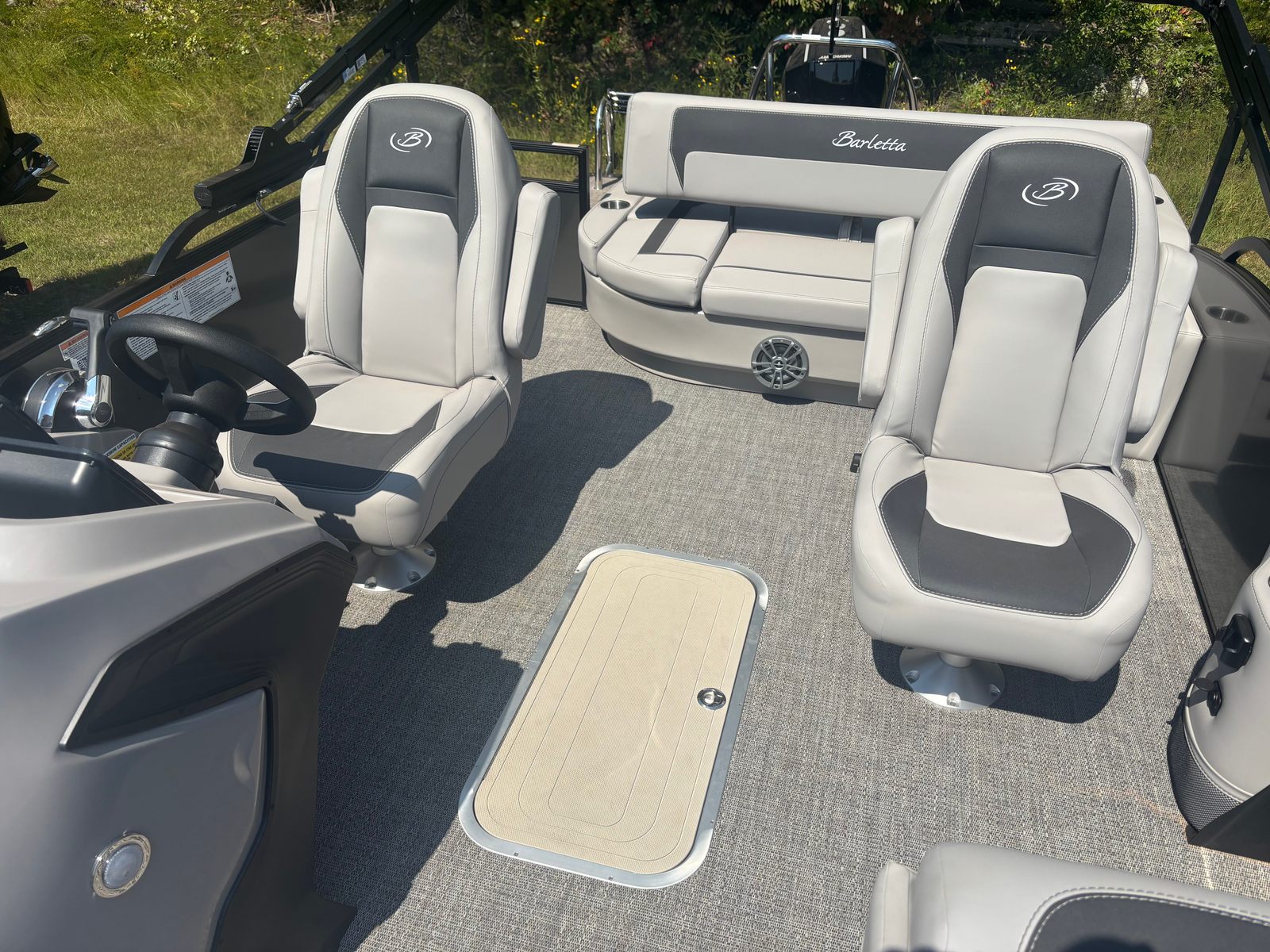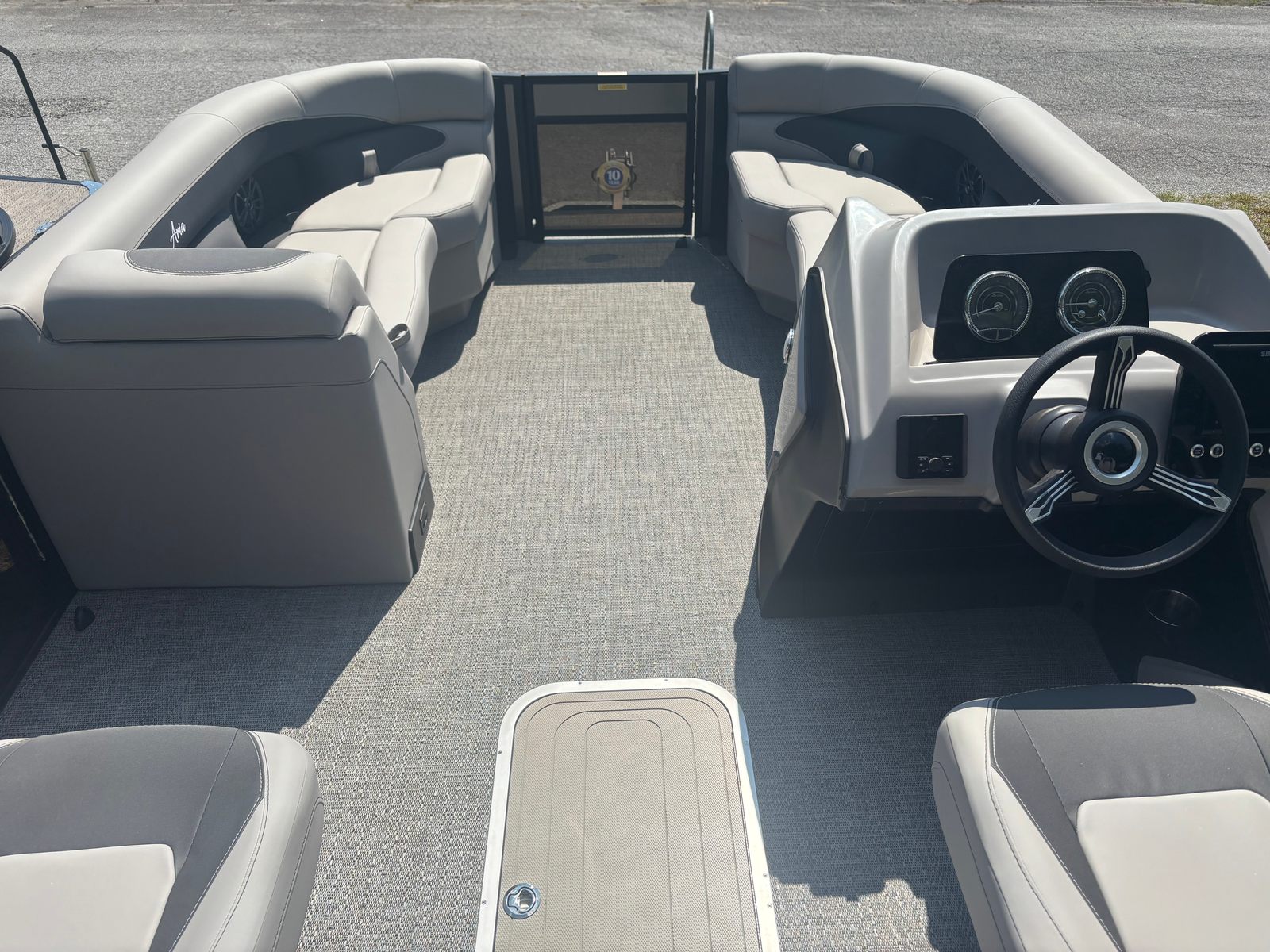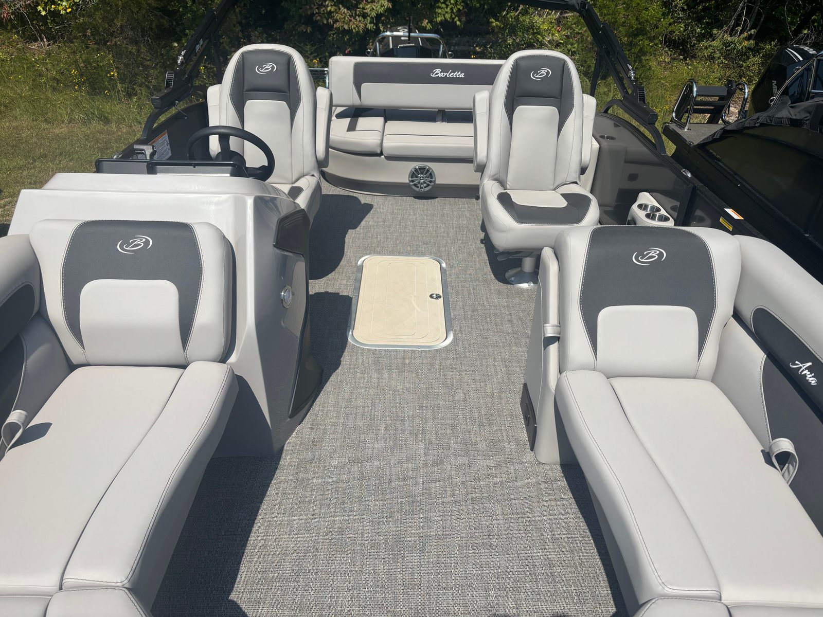 The 2026 Barletta Aria A22UC-Platinum is packed with features designed to elevate your time on the water. The Triple Toon Package Aria provides enhanced stability and performance, allowing for smoother rides and greater capacity. The in-floor midship storage (available with the triple toon configuration) offers convenient space for stowing gear, water toys, and other essentials, keeping the deck clutter-free and organized. The flooring is finished in Amore Gray, providing a stylish and comfortable surface underfoot.At the helm, you will find the advanced Simrad 7" G07 XSE display, offering intuitive navigation and control at your fingertips. The stainless steel flag pole with an American flag adds a patriotic touch, while the Tempest Gray furniture ensures that every seat is as comfortable as it is attractive. The exterior’s Gray Moonstone Railskin color not only looks stunning but also provides a durable and low-maintenance finish.