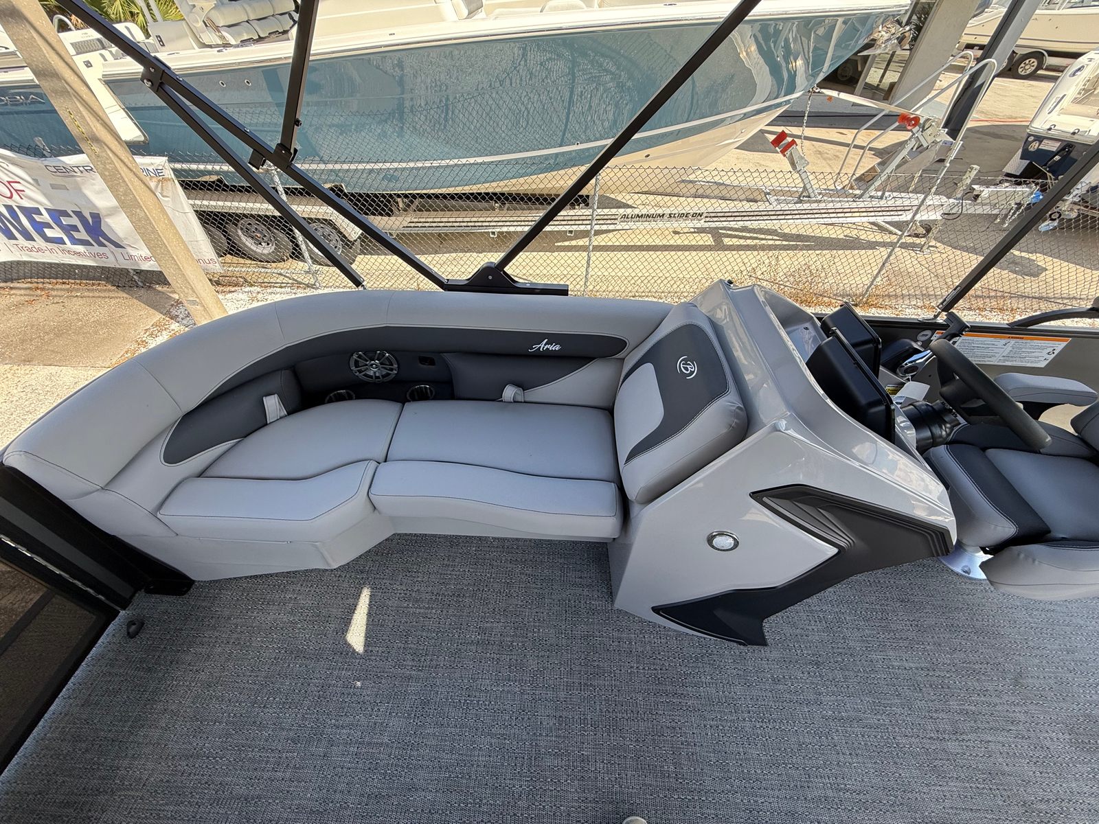 The 2026 Barletta Aria A22UC-Platinum is a brand-new pontoon boat that measures just over 21 feet in length, making it the perfect size for both intimate gatherings and lively parties on the water. Its modern profile is accentuated by the Railskin Color Aria in Gray Moonstone and the Railskin Accent Aria in Black Diamond, giving it a sophisticated and contemporary look that is sure to turn heads at any marina or lakefront. The Blackout Package Aria further enhances its visual appeal, creating a striking contrast that exudes elegance and style.