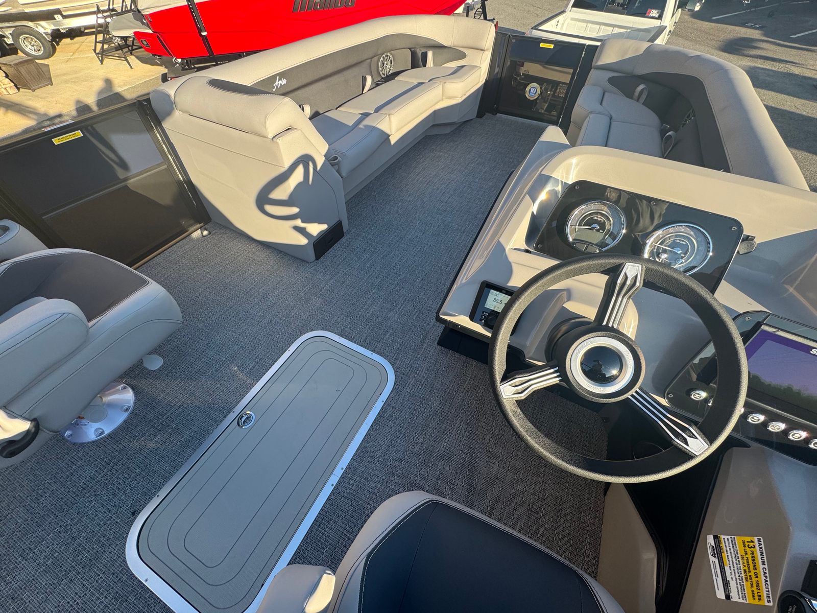 The Barletta Aria A24QC is packed with premium features that elevate your boating experience. The Blue Sapphire Railskin color and Blackout Package Aria give the exterior a modern, high-end look, while the Tempest Gray furniture offers plush, supportive seating for all your guests. The Amore Gray flooring is both stylish and practical, providing a comfortable, slip-resistant surface that is easy to maintain. The onboard battery charger ensures your single battery stays powered up and ready for every adventure. A stainless steel flag pole with an American flag adds a patriotic touch, making this pontoon boat a true standout on the water.