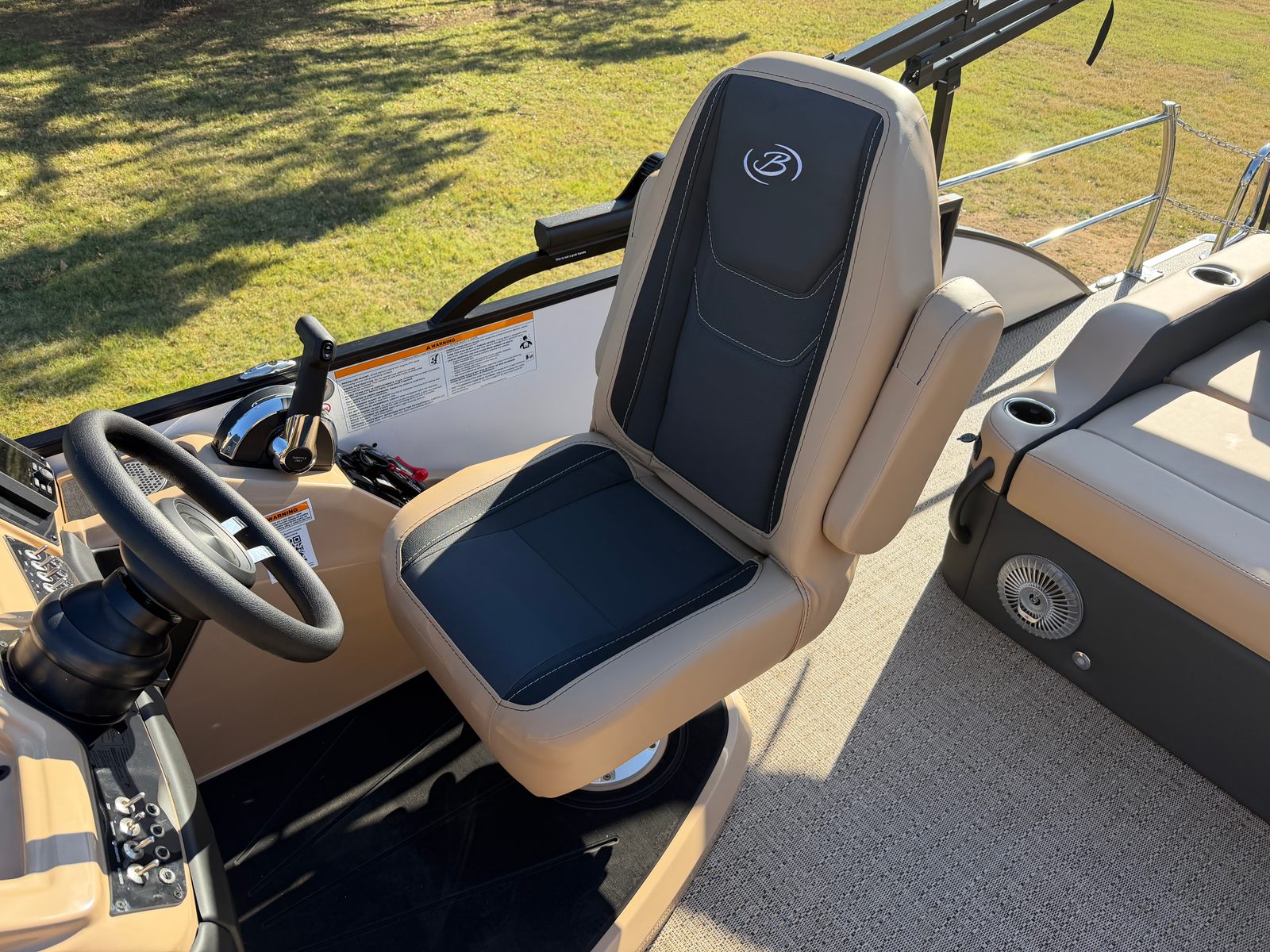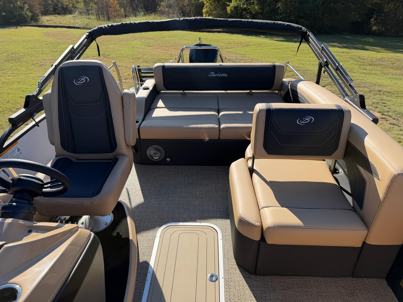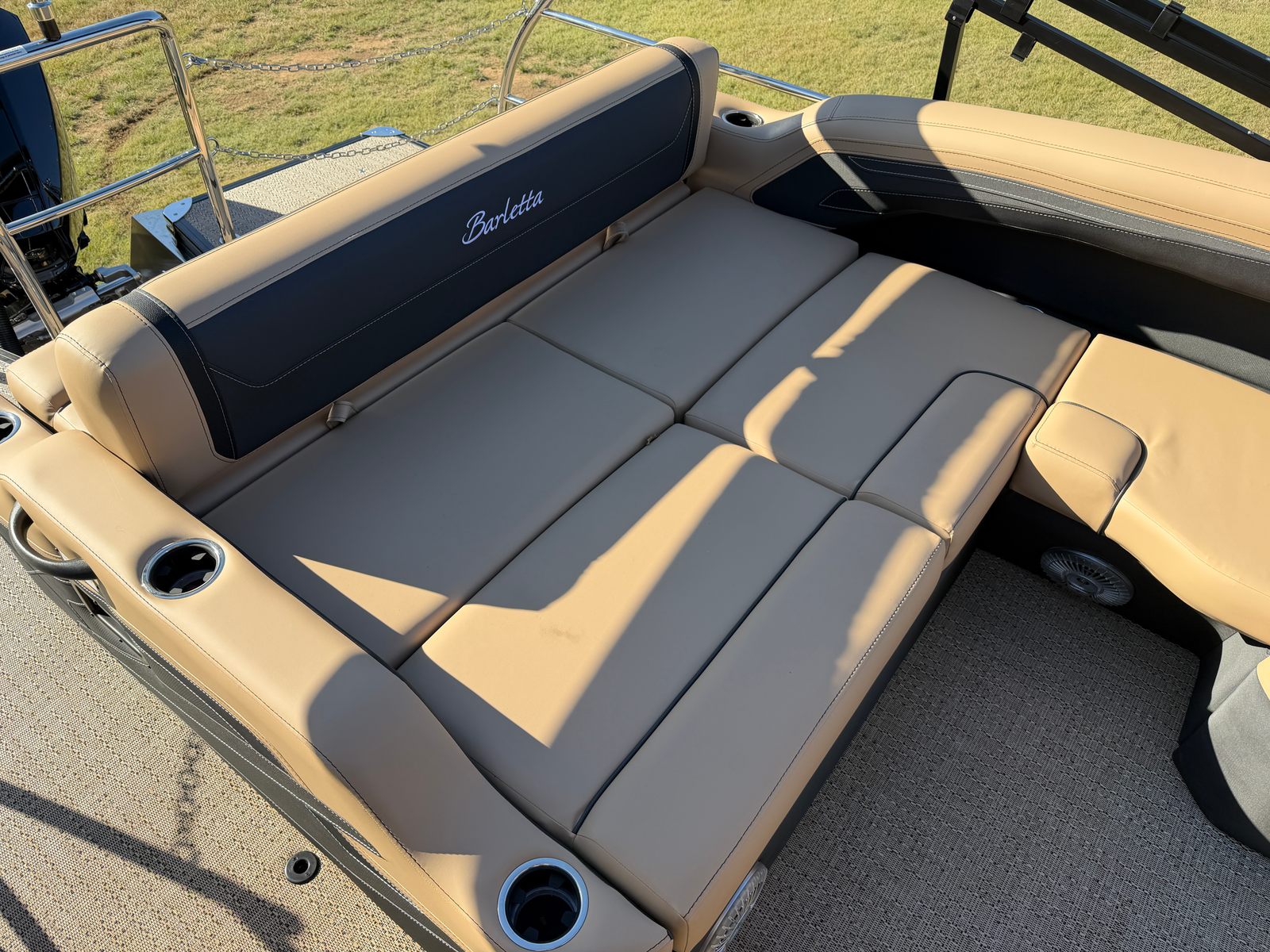 The Barletta Cabrio C22U is packed with features that set it apart from other pontoon boats for sale. Its Railskin Color in Black Diamond, accented with Winter White, creates a striking visual appeal, while the Blackout Package Cabrio adds a touch of modern sophistication. The furniture is upholstered in Carmella Tan with Onyx accents, providing both comfort and elegance. The Amore Tan flooring is not only stylish but also practical, offering durability and easy maintenance.One of the standout features is the Triple Toon Package with midship storage, which maximizes onboard space and ensures you have plenty of room for gear, water toys, and personal items. The Metal Jacket Protectant helps preserve the boat’s exterior, keeping it looking new for years to come. Every detail, from the railskin packages to the furniture and flooring, has been carefully selected to create a welcoming and luxurious environment.