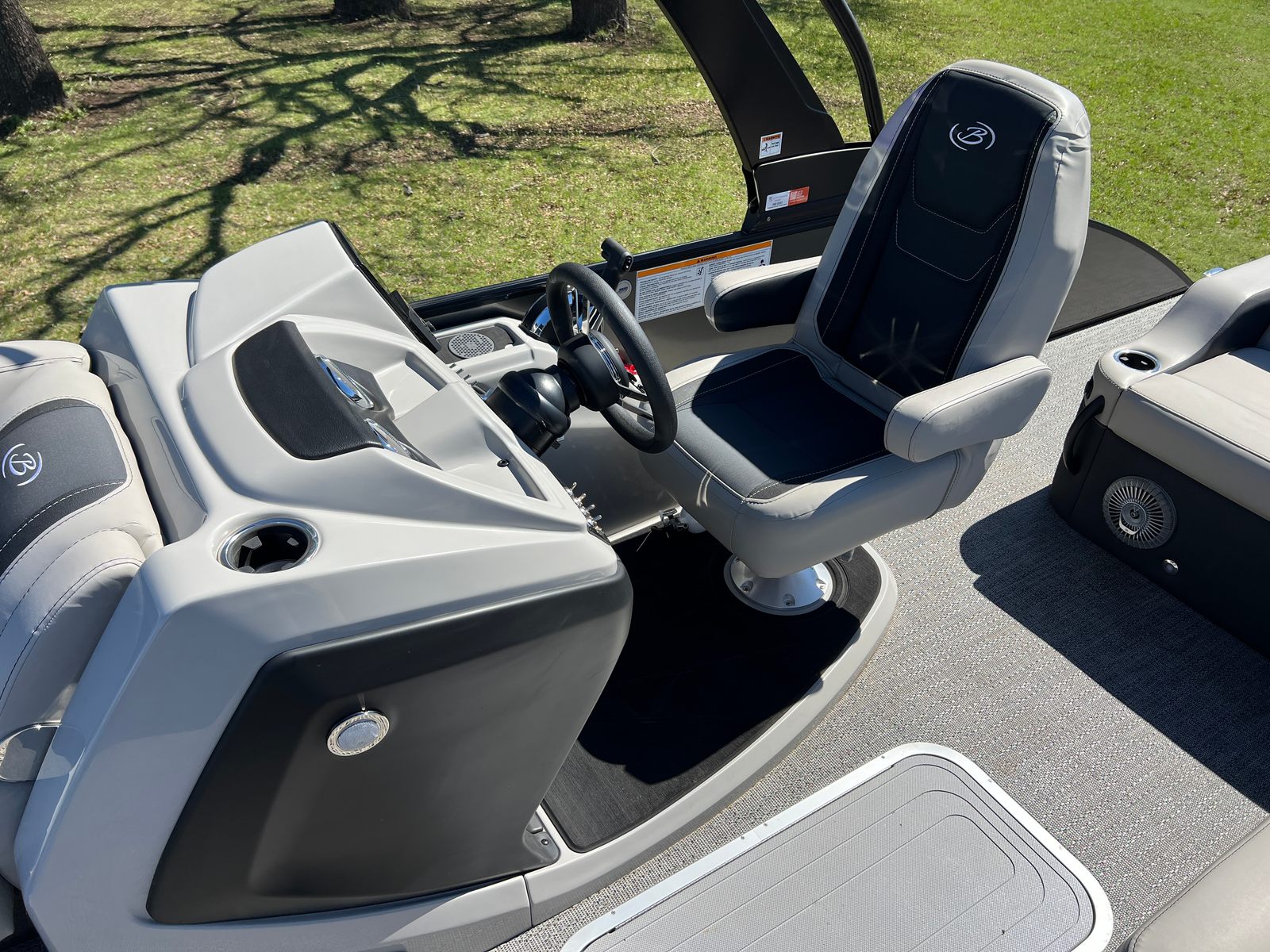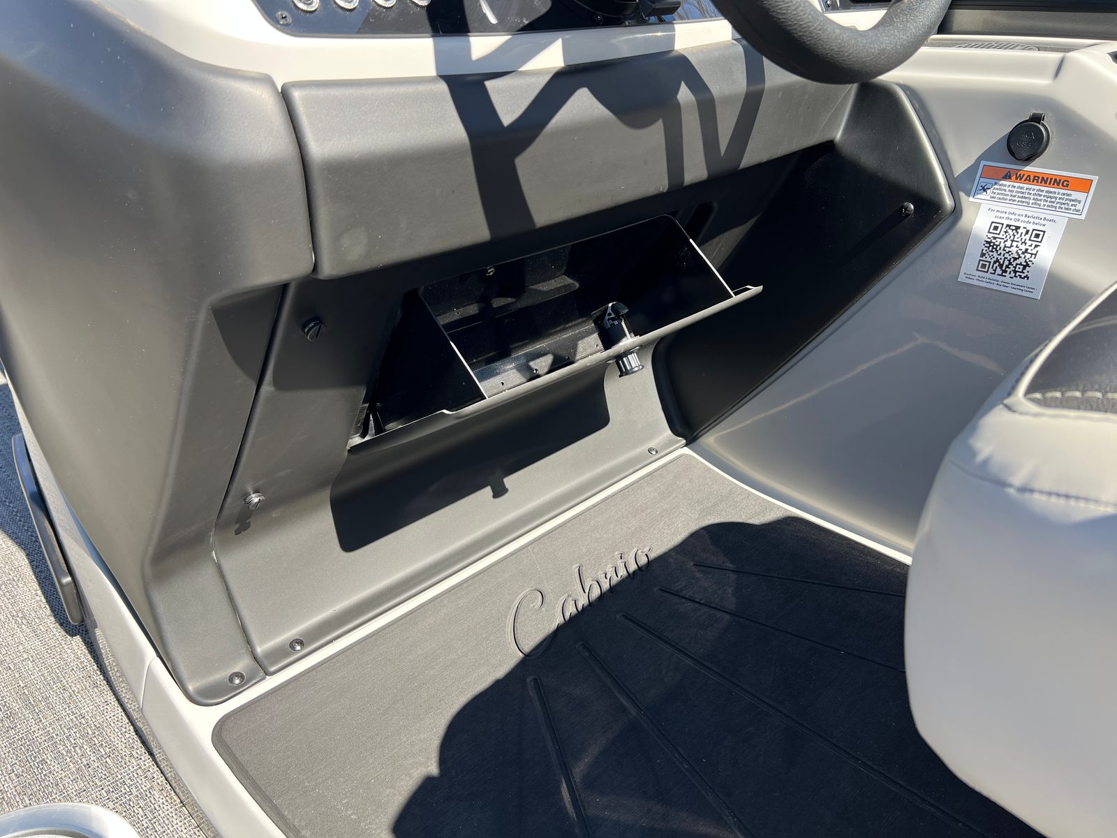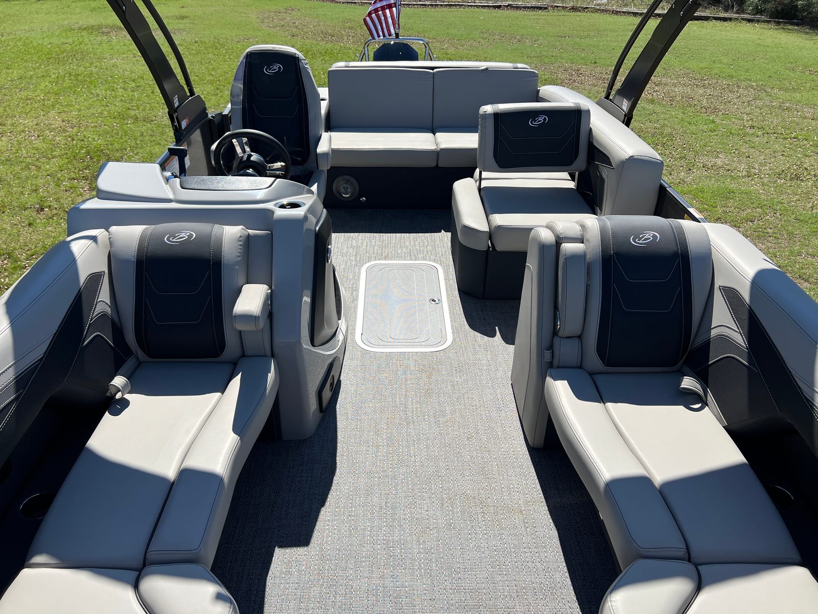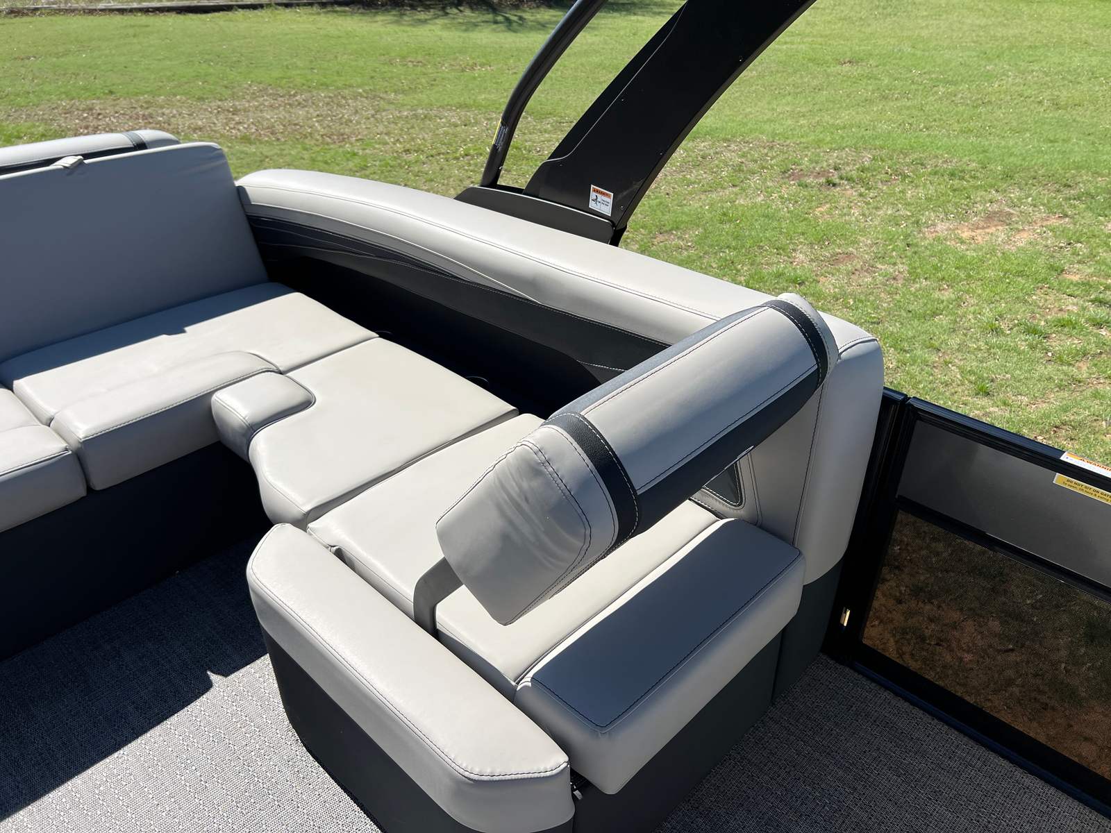 The Barletta Cabrio C22U is packed with special features that elevate its appeal and functionality. The Railskin Color in Black Diamond, complemented by the Gray Moonstone accent, gives the boat a sophisticated and contemporary look. The Blackout Package Cabrio adds a touch of exclusivity, ensuring your pontoon stands out wherever you go. Inside, the Marquesan Gray furniture with Onyx accents creates a comfortable and stylish environment, while the Amore Gray flooring is both attractive and easy to maintain.One of the standout features is the Triple Toon Package with midship storage, providing enhanced stability and extra space for gear, water toys, or personal belongings. The Sport Bimini canvas, installed in place of the standard bimini, offers superior sun protection and adds a sporty flair to the boat’s profile. Every detail, from the rigged engine with stainless steel prop to the thoughtfully designed interior, reflects Barletta’s dedication to quality and user satisfaction.