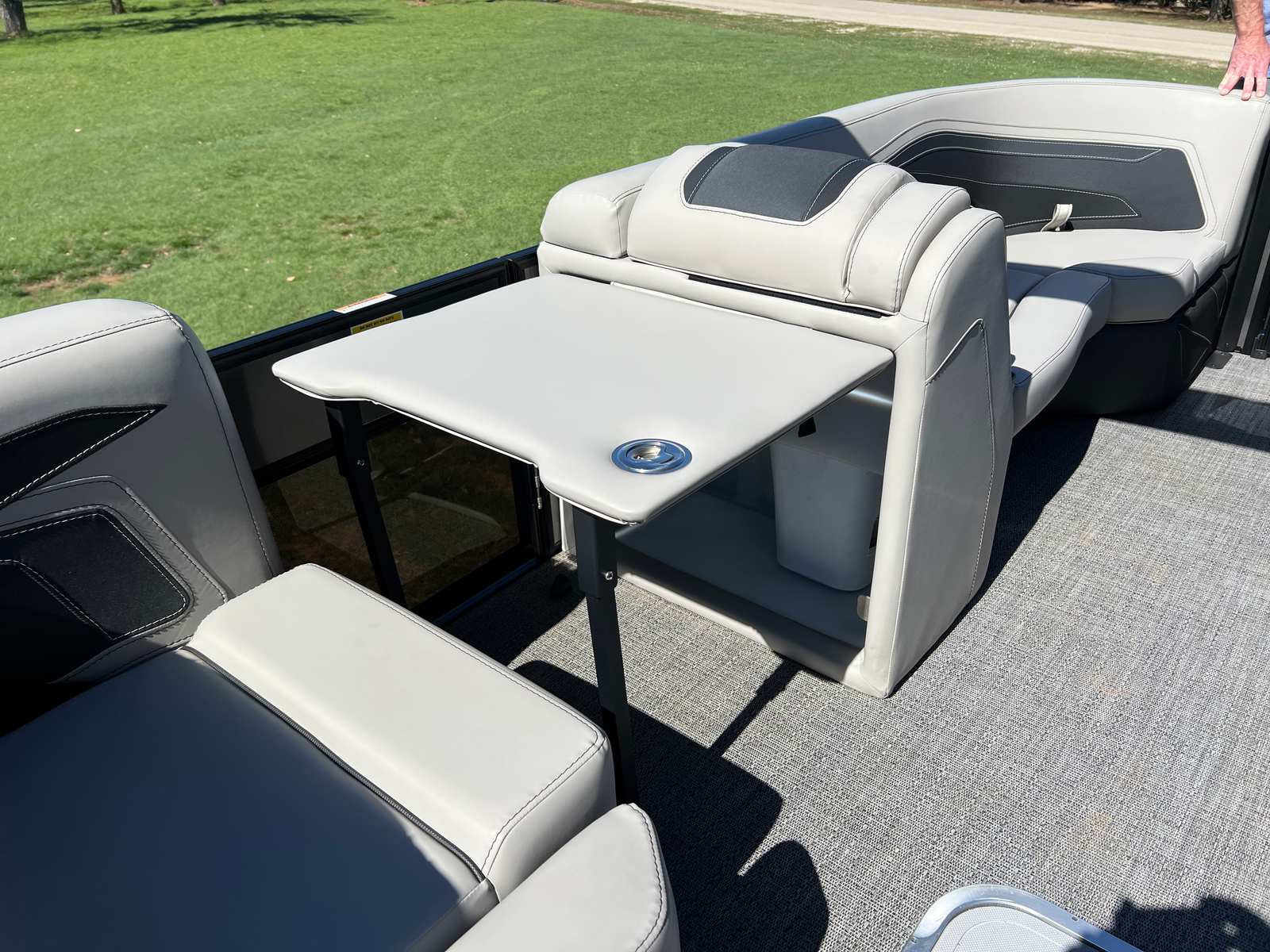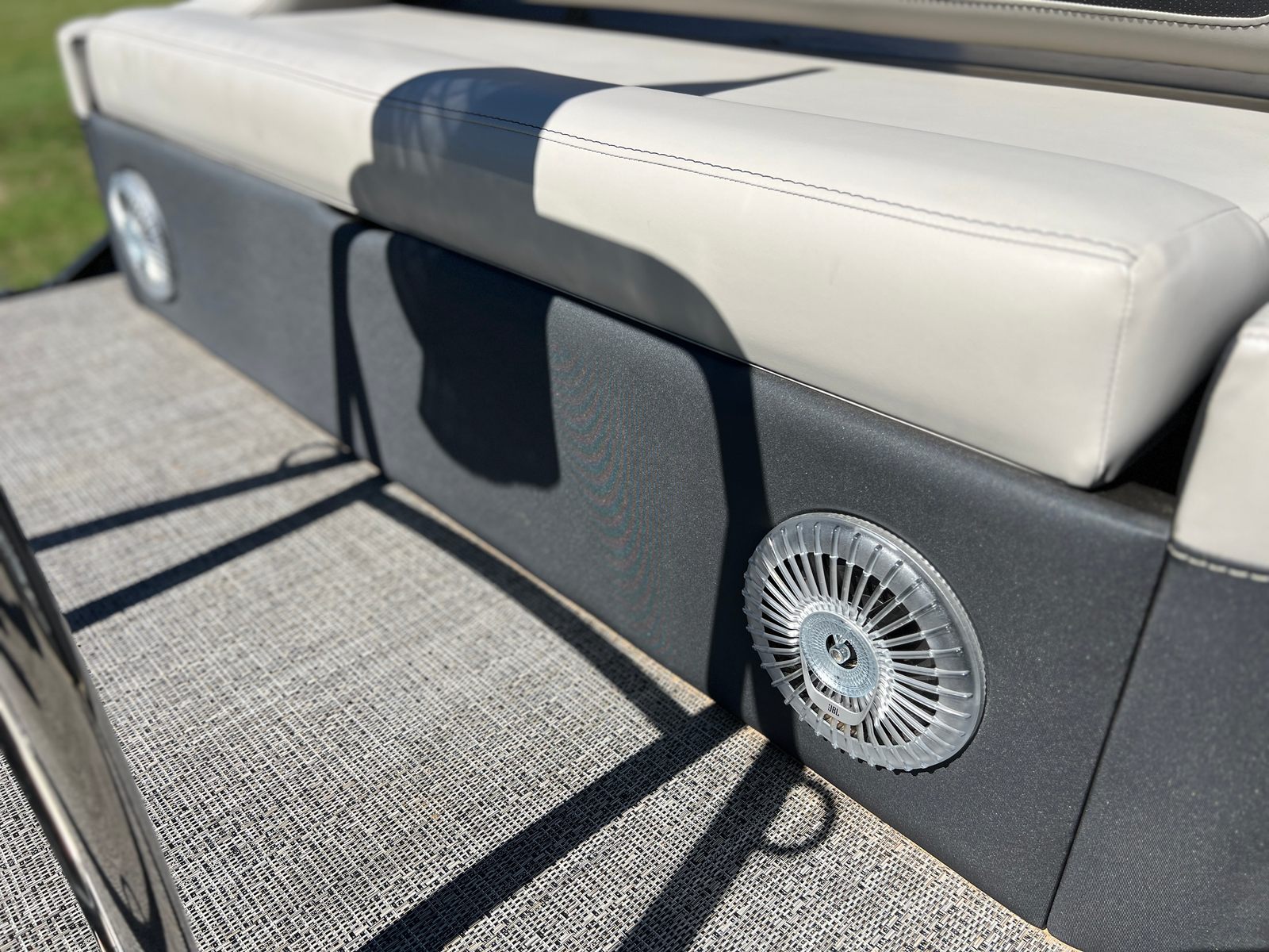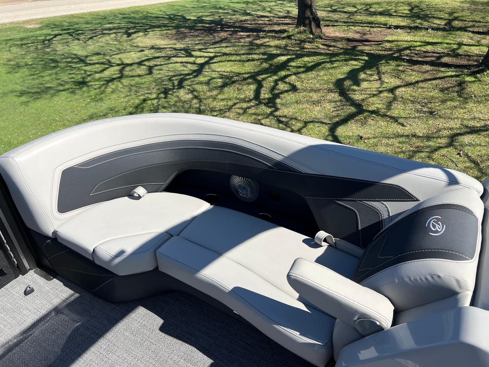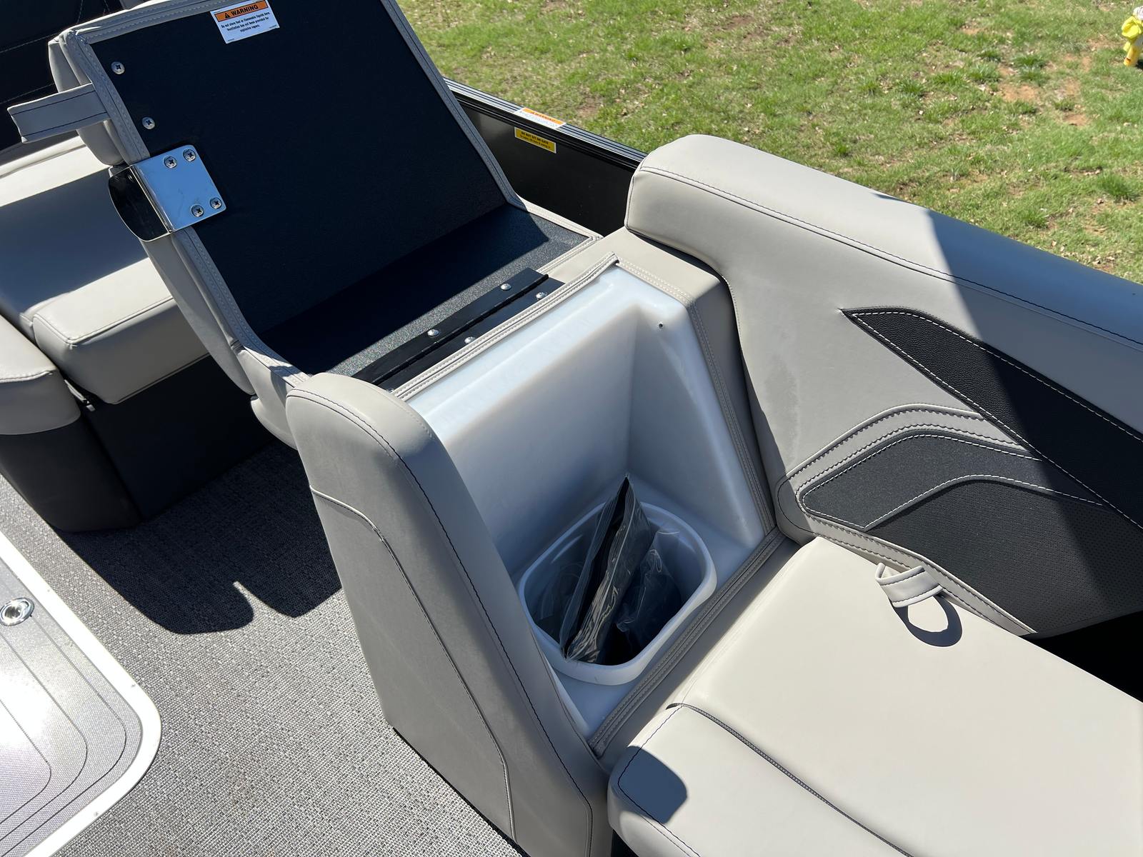 The Barletta Cabrio C22U is packed with special features that elevate its appeal and functionality. The Railskin Color in Black Diamond, complemented by the Gray Moonstone accent, gives the boat a sophisticated and contemporary look. The Blackout Package Cabrio adds a touch of exclusivity, ensuring your pontoon stands out wherever you go. Inside, the Marquesan Gray furniture with Onyx accents creates a comfortable and stylish environment, while the Amore Gray flooring is both attractive and easy to maintain.One of the standout features is the Triple Toon Package with midship storage, providing enhanced stability and extra space for gear, water toys, or personal belongings. The Sport Bimini canvas, installed in place of the standard bimini, offers superior sun protection and adds a sporty flair to the boat’s profile. Every detail, from the rigged engine with stainless steel prop to the thoughtfully designed interior, reflects Barletta’s dedication to quality and user satisfaction.