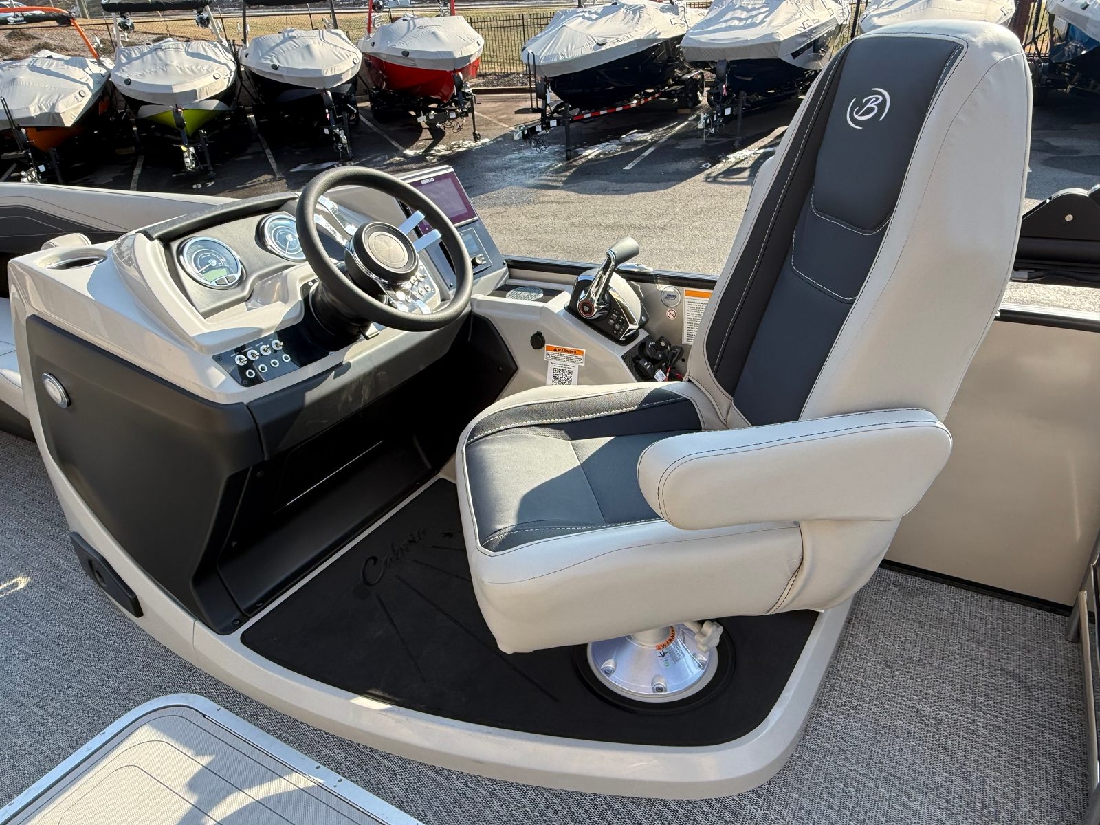 The Barletta Cabrio C24M is packed with premium features designed to enhance comfort, convenience, and fun on the water. The Marquesan Gray furniture with Onyx accents creates a luxurious and inviting atmosphere, while the Amore Gray flooring adds a touch of elegance and durability. The Triple Toon Package with Midship Storage—Cabrio provides added stability, improved handling, and convenient storage options for all your gear and essentials. The onboard battery charger with two batteries ensures you have reliable power for all your electronics and accessories, so you can focus on enjoying your time on the water.Other notable features include the Mercury Digital DTS Pre-Rig for VERADO engines with Vessel Link, hydraulic and power assist steering, digital gauges, and rigging with a stainless steel prop. These advanced components work together to deliver a smooth, safe, and enjoyable boating experience, whether you’re cruising, anchoring, or docking.