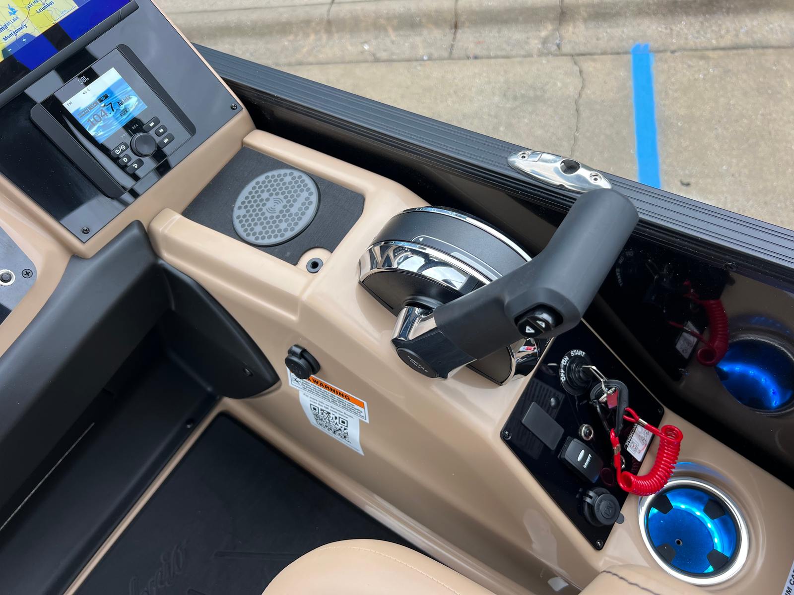 The Barletta Cabrio C24QC is loaded with features that set it apart from other pontoon boats for sale. The Black Diamond Railskin color, paired with the Blackout Package, gives this pontoon a bold, modern look that is sure to turn heads at the marina. Inside, the Carmella Tan with Onyx furniture offers plush seating and a sophisticated aesthetic, while the Amore Tan flooring provides a comfortable, slip-resistant surface underfoot.The triple toon package with midship storage not only improves performance but also adds valuable storage space for gear, water toys, and personal items. The onboard battery charger with two batteries ensures you have reliable power for all your electronics and accessories, while the metal jacket protectant helps keep your pontoon looking pristine season after season. A stainless steel flag pole with an American flag adds a patriotic touch, perfect for holiday weekends and special occasions.