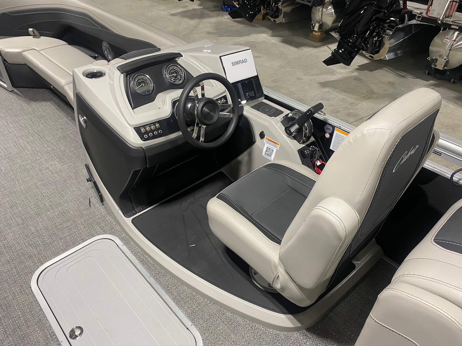 The Barletta Cabrio C24QC is loaded with special features designed to maximize comfort, convenience, and enjoyment. The Triple Toon Package with Midship Storage - Cabrio not only boosts performance but also provides additional storage space for gear, water toys, and personal items. The interior RGB Lighting Package creates a vibrant, customizable ambiance for evening cruises or festive gatherings, while the stainless steel flag pole with an American flag adds a touch of patriotic flair to your boat’s exterior. At the helm, the Simrad 7" G07 XSR Chartplotter/Multifunction Display offers advanced navigation and system monitoring, helping you stay informed and in control throughout your journey. The Marquesan Gray furniture with Onyx detailing and Amore Gray flooring ensure that every seat is comfortable and every step feels luxurious.