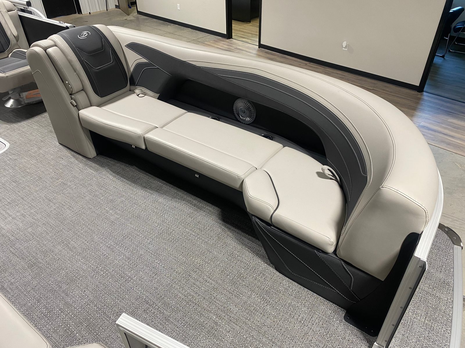 The 2026 Barletta Cabrio C24QC is a spacious pontoon boat measuring just over 25 feet in length, making it perfect for entertaining family and friends or enjoying solo adventures. With its generous deck space and thoughtfully designed layout, this Barletta boat for sale offers ample room for relaxation, socializing, and recreation. The Cabrio C24QC’s contemporary design is highlighted by its Railskin Color in Black Diamond, which gives the exterior a sophisticated and timeless look. Inside, the Marquesan Gray furniture with Onyx accents and Amore Gray flooring create a comfortable and inviting atmosphere, ensuring every outing feels like a luxury getaway.