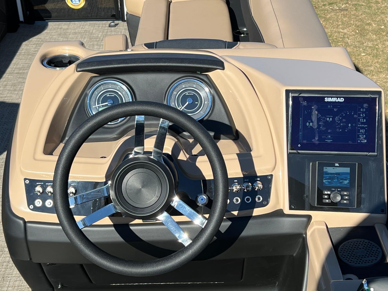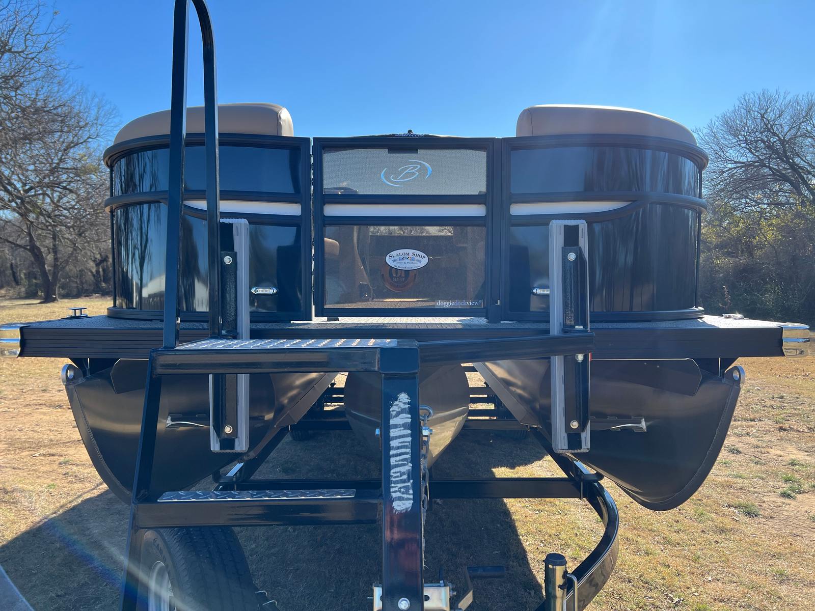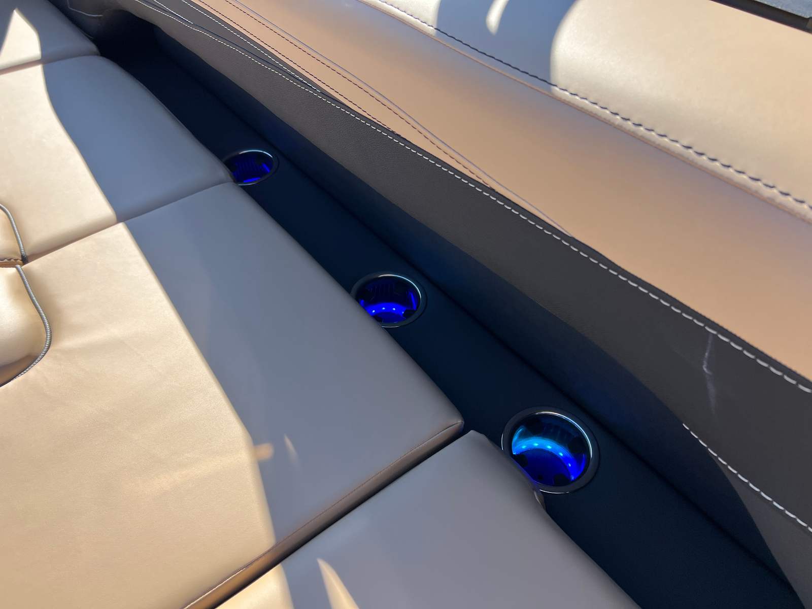 Step aboard the Barletta Cabrio C24U and you are greeted by a luxurious interior featuring Carmella Tan furniture with Onyx accents, creating an inviting and upscale atmosphere. The Amore Tan flooring not only adds to the visual appeal but also provides a comfortable and slip-resistant surface underfoot. The Blackout Package Cabrio, combined with the Black Diamond railskin and Winter White accent, gives this pontoon a distinctive and sophisticated look. The Triple Toon Package with midship storage offers ample space for stowing gear, water toys, and other essentials, keeping the deck uncluttered and organized. The boat is protected with Metal Jacket Protectant, ensuring its finish remains pristine and resistant to the elements.