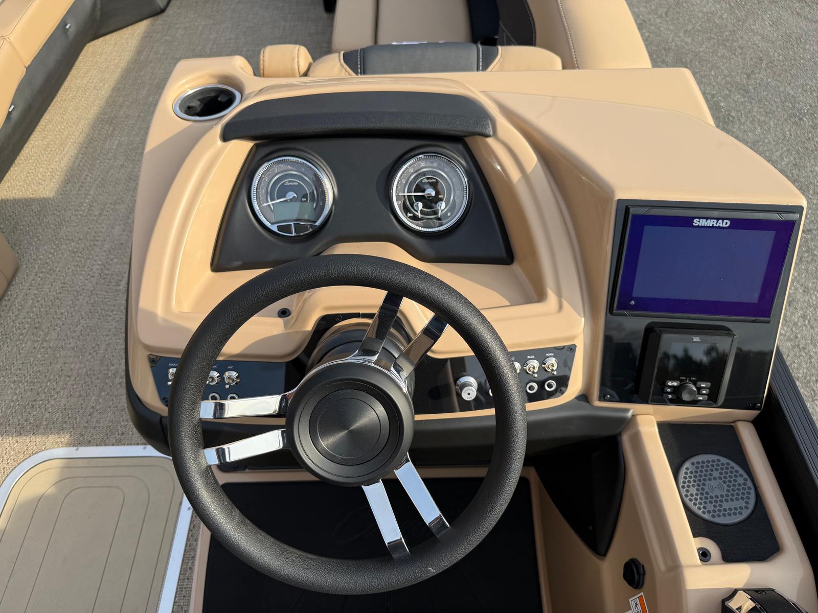 Step aboard and discover a world of premium features designed to enhance your boating experience. The Cabrio C24U boasts the striking Black Diamond railskin color, complemented by a Matte Black accent and the exclusive Blackout Package Cabrio, giving the boat a sleek, modern look that turns heads at every dock. Inside, the Carmella Tan furniture with Onyx accents creates a sophisticated and inviting atmosphere, while the Amore Tan flooring adds warmth and comfort underfoot.The Triple Toon Package with midship storage provides enhanced stability, superior ride quality, and ample space for your gear, making it easy to bring along everything you need for a day on the water. The onboard battery charger supports two batteries, ensuring reliable power for all your electronics and accessories. Every detail, from the furniture to the flooring, has been thoughtfully selected to create a harmonious and luxurious environment.