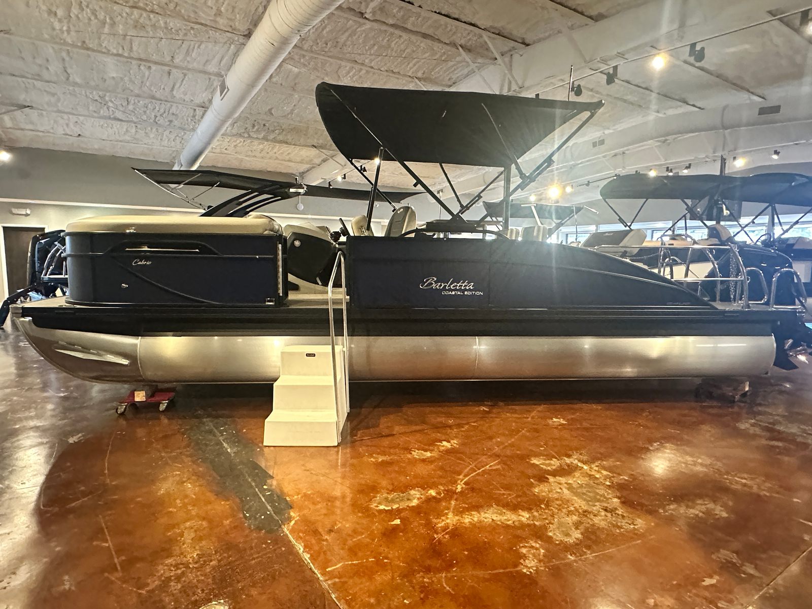 The Barletta Cabrio C24UE is packed with premium features that set it apart from other pontoon boats for sale. The striking Bohemian Blue railskin is complemented by the Blackout Package Cabrio, giving the boat a bold, contemporary look that turns heads at the marina. Inside, the Marquesan Gray with Onyx furniture offers plush seating and a sophisticated atmosphere, while the Amore Gray flooring provides both comfort and durability underfoot.This model is part of the Coastal Edition Cabrio, designed to withstand the rigors of saltwater environments and coastal cruising. The Triple Toon Package with midship storage adds stability, buoyancy, and extra storage space, making it easier to stow gear, water toys, and essentials for a day on the water. The rigging includes a stainless steel prop for optimal performance and a stainless steel flag pole with an American flag, adding a touch of patriotic flair to your boating adventures.