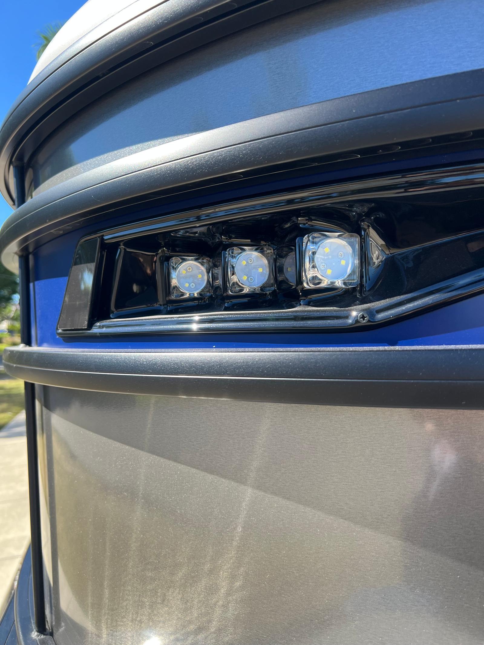 The Barletta Corsa 23MA is packed with special features that set it apart from other pontoon boats for sale. The exterior lighting includes white underdeck and underwater illumination, creating a striking visual effect during evening cruises and enhancing safety around the boat. The stainless steel flag pole with an American flag adds a touch of patriotic flair and sophistication to the vessel’s profile.Entertainment is at the forefront with the Arch Sound Bar, ensuring high-quality audio for your favorite music and enhancing the atmosphere for social gatherings. The flooring is finished in Amore Gray, providing both durability and a modern aesthetic that complements the boat’s overall design. The Blackout Package Corsa railskin package gives the exterior a sleek, contemporary look, while the Coastal Edition Corsa adds unique styling elements that make this pontoon truly distinctive.Inside, comfort is paramount. The adjustable pedestal on the captain’s chair at the helm allows for personalized seating, ensuring the captain enjoys optimal visibility and control. The furniture features Soft Touch Marquesan Gray with Blue Accent, offering plush seating and a stylish color scheme that invites relaxation. Every detail has been thoughtfully designed to maximize comfort and enjoyment for all passengers.