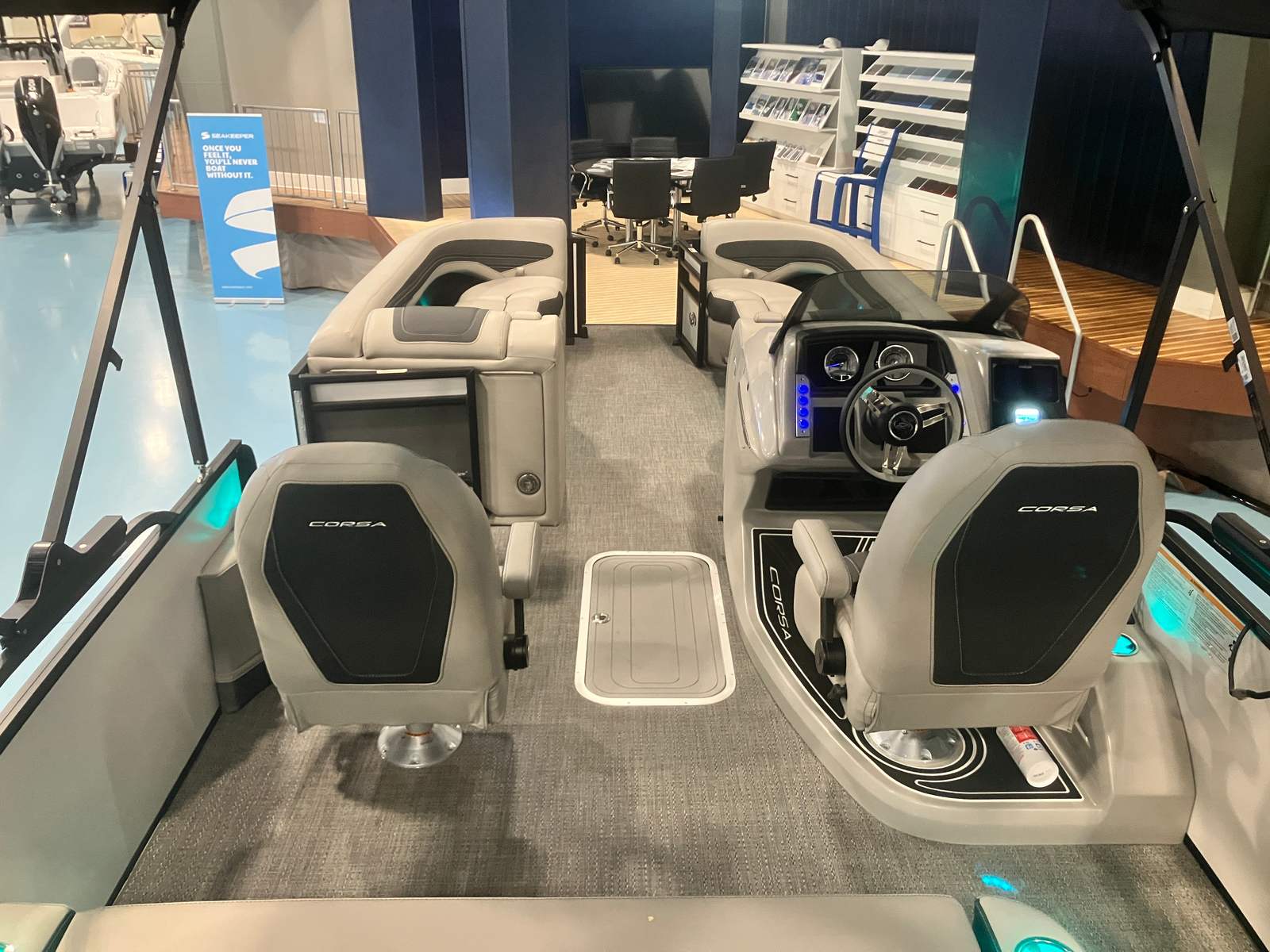 The 2026 Barletta Corsa 25UC is a 27-foot pontoon boat that exudes sophistication and innovation from bow to stern. As a brand-new model, it showcases the latest advancements in pontoon design and engineering, ensuring you enjoy a smooth, safe, and exhilarating ride every time you hit the water. The Corsa 25UC is crafted for those who appreciate the finer things in life, offering a spacious layout that invites relaxation, socializing, and endless fun. With its sleek lines, modern color palette, and attention to detail, this Barletta boat for sale is sure to turn heads at any marina or dock.