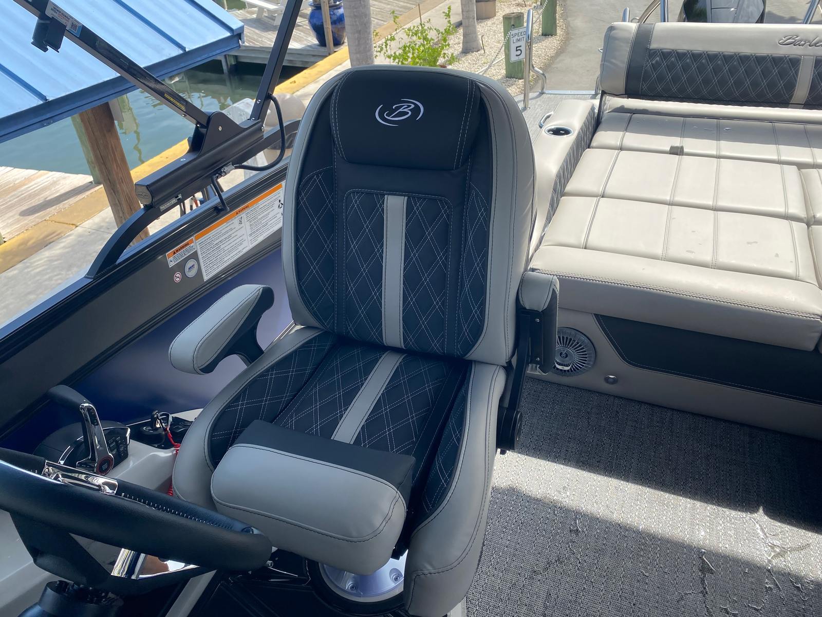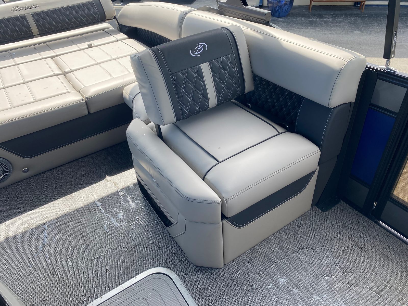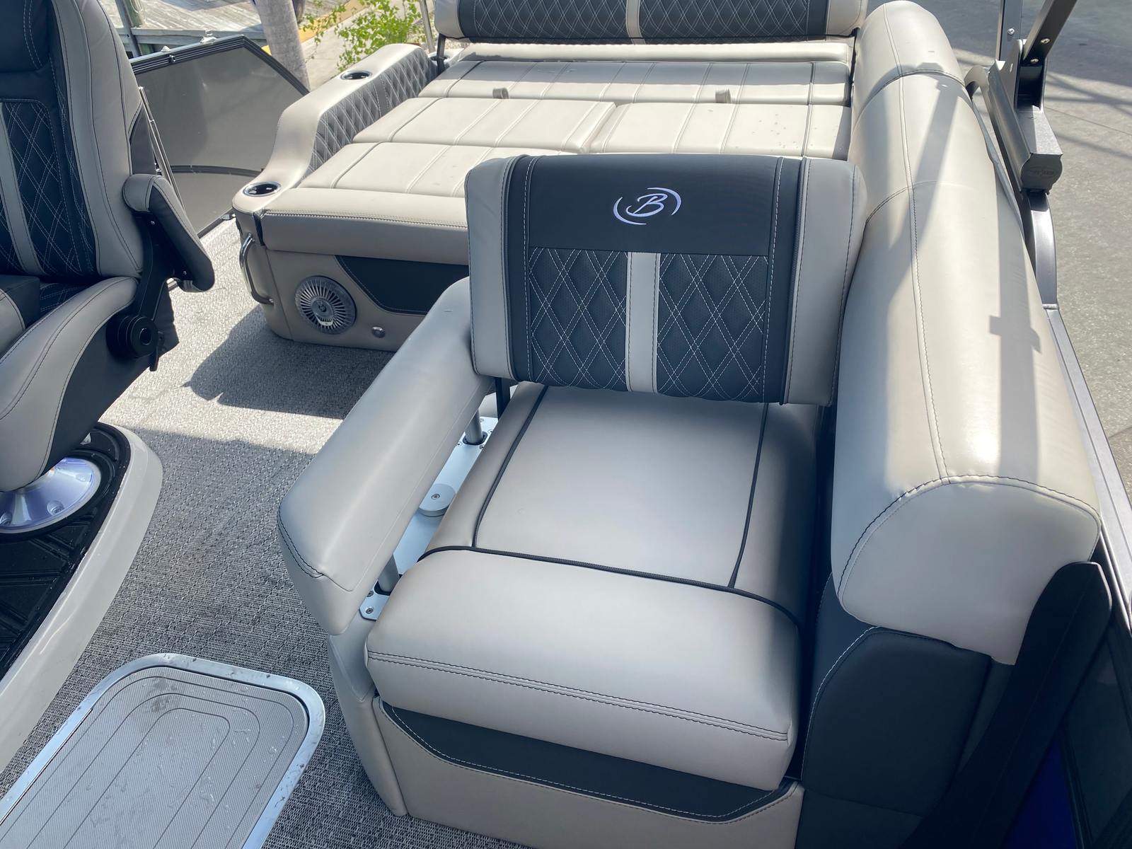 The Barletta Lusso L23U is packed with special features that elevate your boating experience. The exterior lighting, including white underdeck and underwater illumination, creates a striking visual effect during evening cruises and adds an extra layer of safety. The sweep color in Gray Moonstone and accent color in Bohemian Blue give the pontoon a sophisticated, coastal-inspired look, perfectly complemented by the Coastal Edition Lusso package. The Blackout Package on the railskin adds a bold, modern touch, while the Marquesan Gray furniture with Onyx accents provides plush seating and a refined atmosphere.Practicality is built into every aspect of the Lusso L23U. The on-board battery charger supports two batteries, ensuring you have reliable power for all your electronics and lighting. The rig engine with a stainless steel prop is designed for longevity and optimal performance, making maintenance straightforward and hassle-free. Every detail, from the construction to the furniture, reflects Barletta’s commitment to quality and comfort.