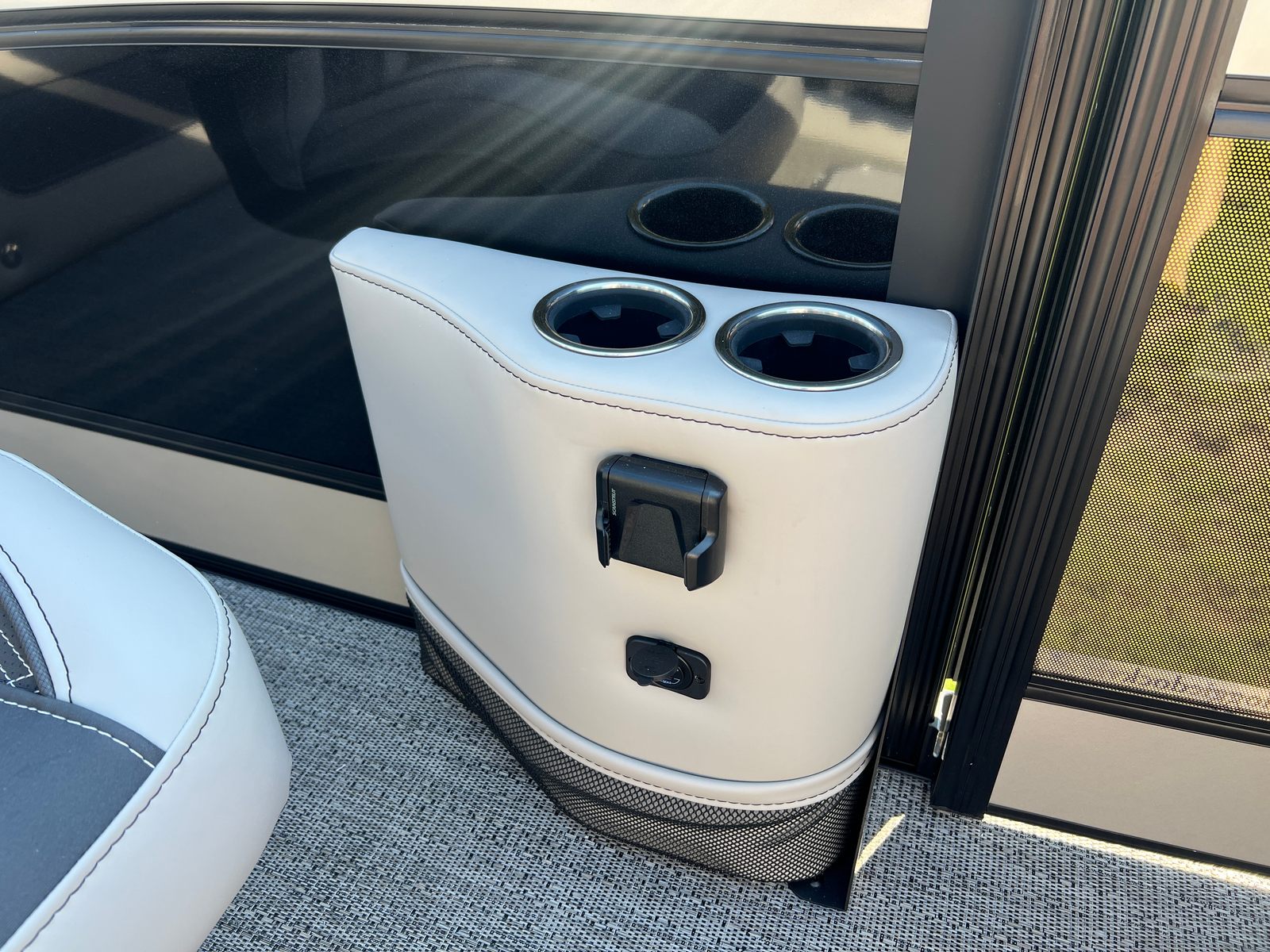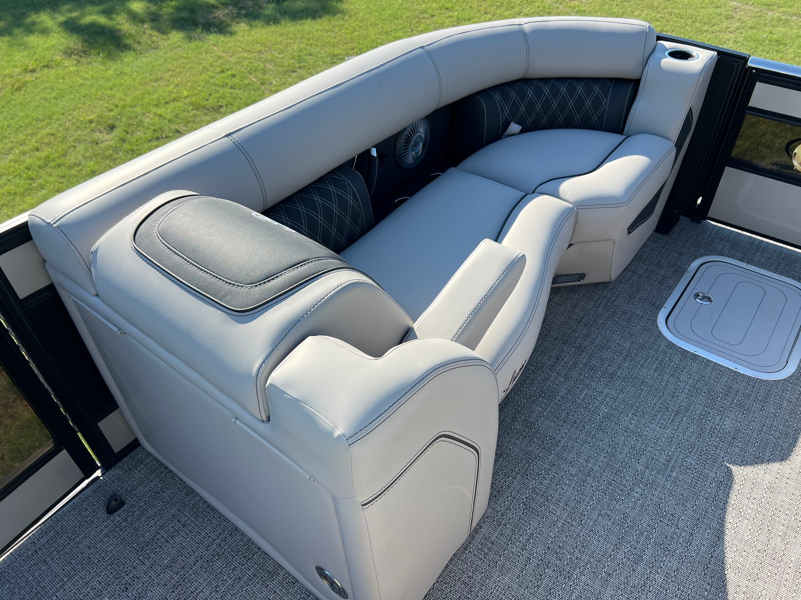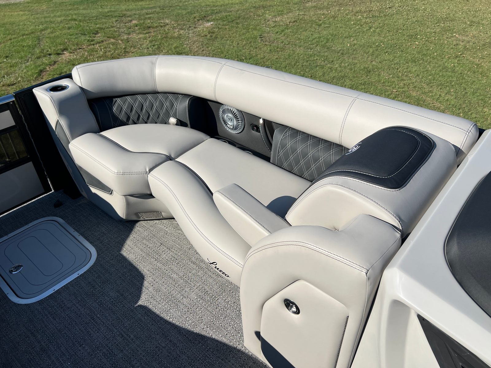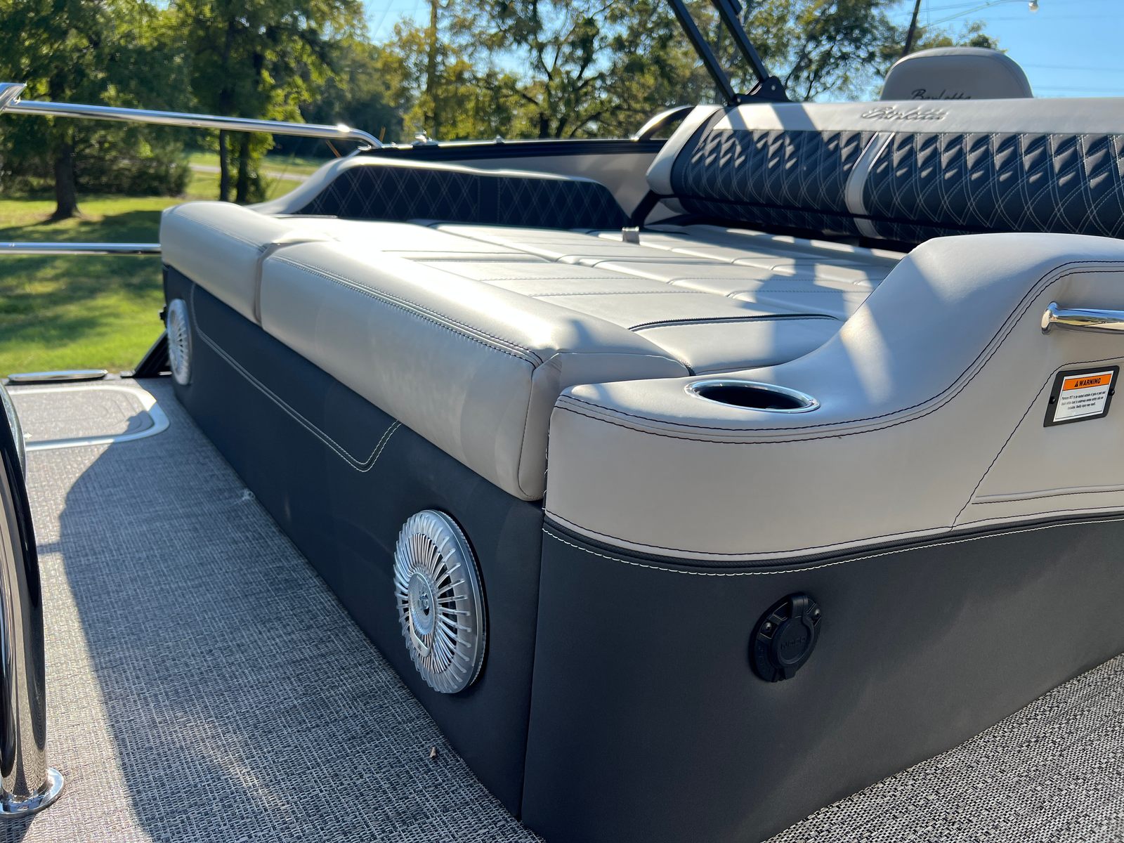 The Lusso L23UC is packed with features designed to enhance your time on the water. The onboard battery charger supports two batteries, ensuring you have plenty of power for extended outings. The Metal Jacket Protectant on the exterior adds durability and keeps your pontoon looking pristine season after season. The combination of Marquesan Gray furniture with Onyx accents and Amore Gray flooring creates a sophisticated lounge area, perfect for relaxing or entertaining. The Blackout Package Lusso railskin and the Champagne/Black Diamond color scheme set this pontoon apart from the rest, making it a true showpiece.