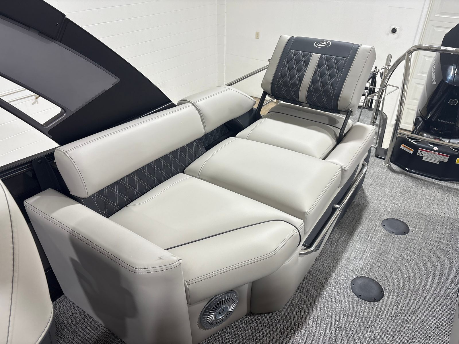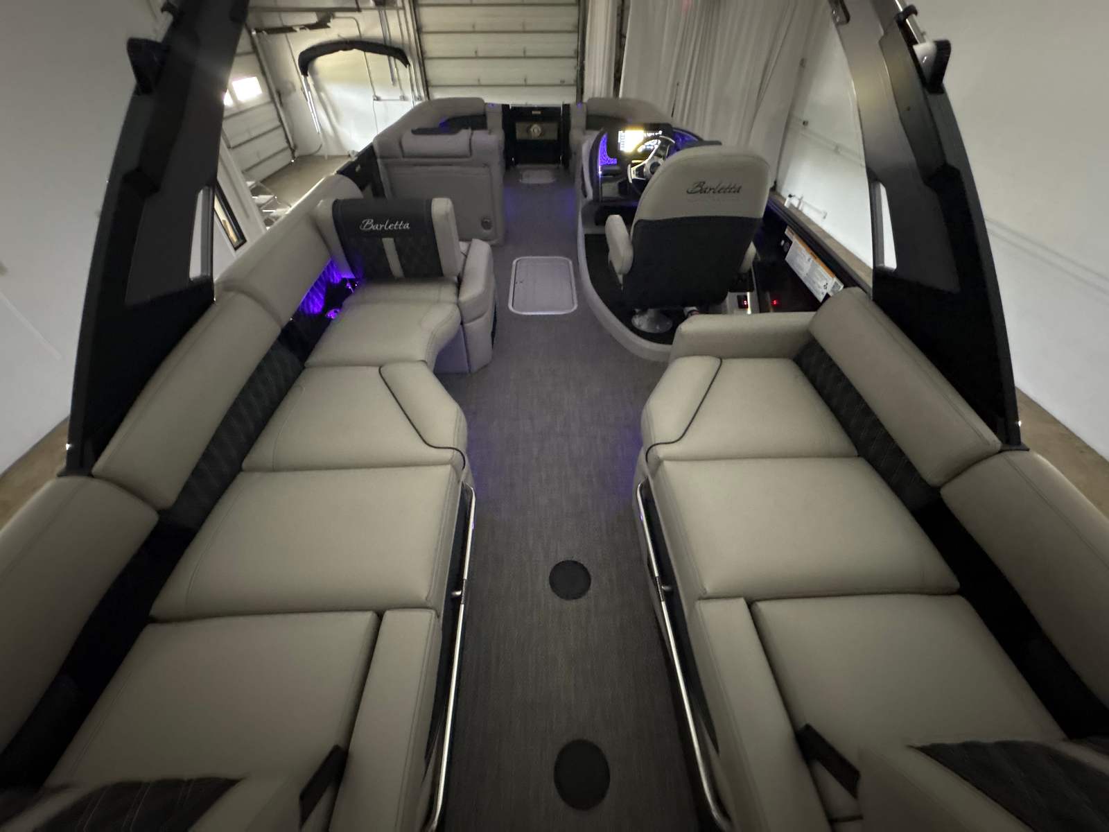 The Barletta Lusso L25MA is packed with premium features designed to elevate your boating experience. The exterior lighting, including white underdeck and underwater lights, creates a captivating ambiance for evening cruises and adds a touch of elegance to your pontoon. The Blackout Package Lusso railskin delivers a bold, modern look, while the Marquesan Gray/Onyx furniture provides plush comfort and sophisticated style. The flooring, finished in Amore Gray, is both durable and visually appealing, complementing the overall aesthetic of the boat. The accent color in Gray Moonstone and the sweep color in Black Diamond further enhance the Lusso L25MA’s striking appearance.