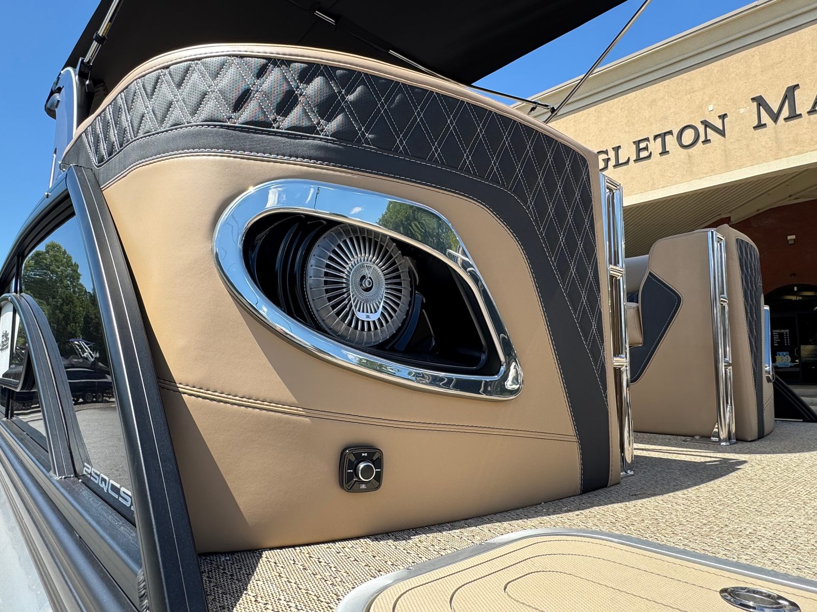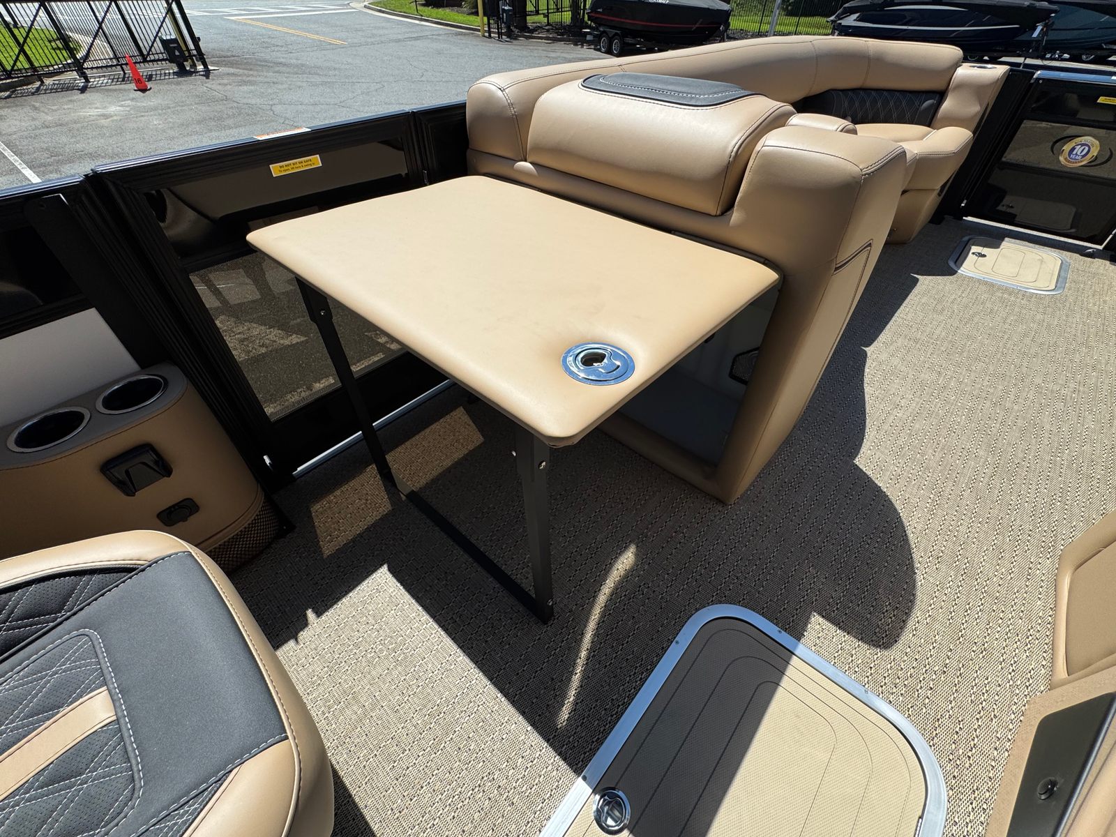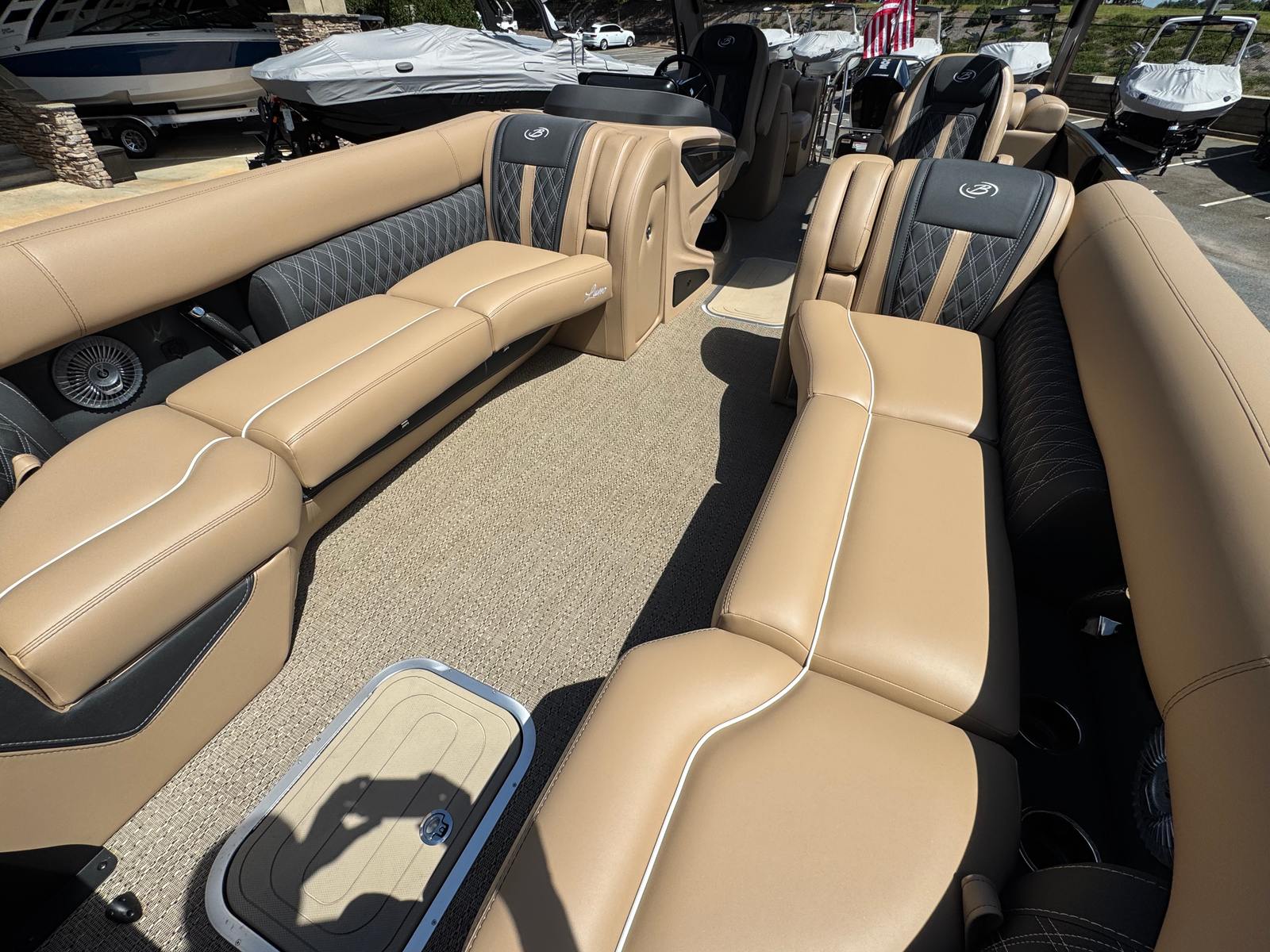 Step aboard and experience the thoughtful features that set the Barletta Lusso L25QCSSA apart. The flooring is finished in Amore Tan, offering both durability and a touch of elegance underfoot. The furniture, upholstered in Carmella Tan with Onyx accents, creates a warm and inviting atmosphere, perfect for relaxing or entertaining guests. The Black Diamond sweep color and Winter White accent color add a sophisticated flair to the boat’s overall aesthetic, while the Blackout Package Lusso railskin package enhances its modern appeal.For added protection and longevity, the Metal Jacket Protectant shields the boat’s exterior from the elements. Enjoy ambient evenings with white underdeck and underwater exterior lighting, creating a captivating glow that enhances nighttime outings. The boat is made water-ready with a stainless steel prop, ensuring optimal performance and reliability from day one. Digital gauges provide clear and accurate information at a glance, keeping you informed and in control throughout your journey.