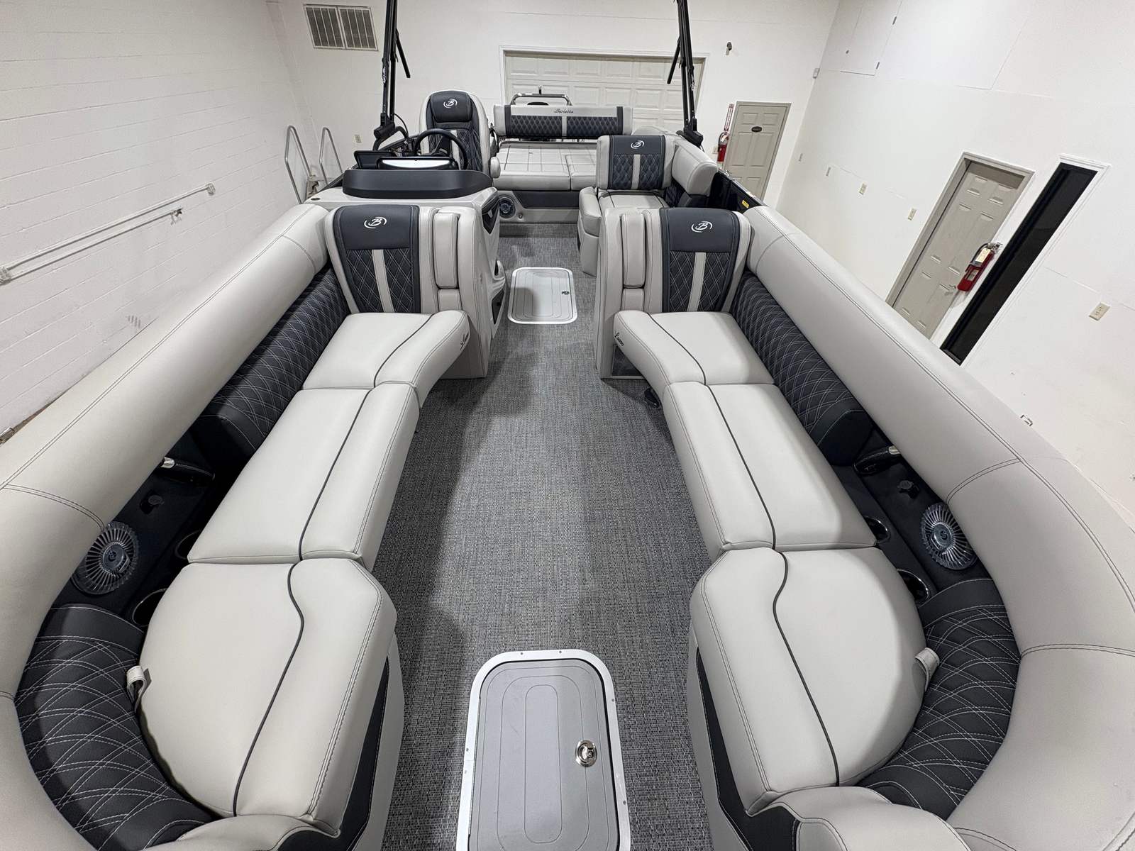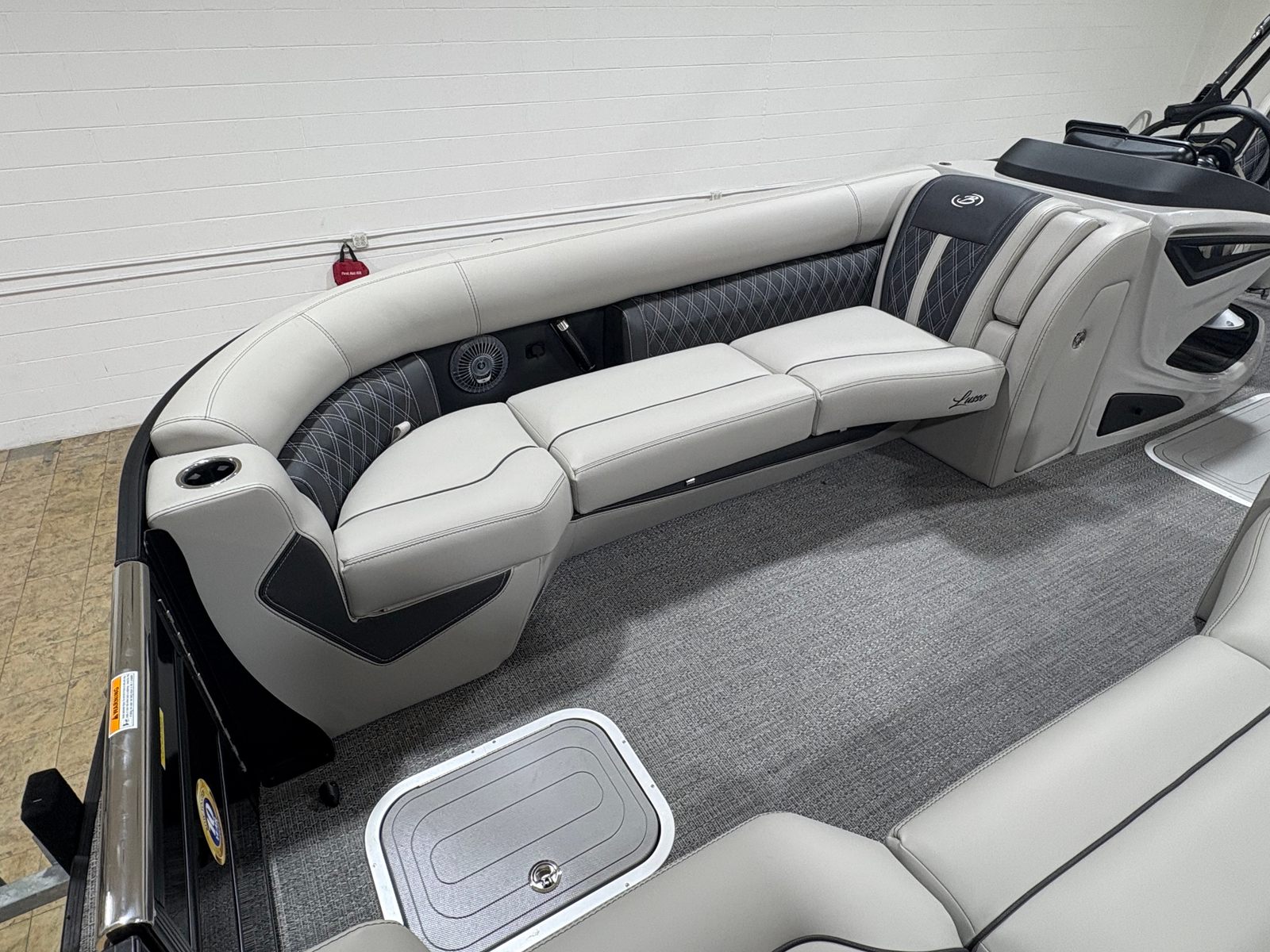 The Lusso L25U is packed with premium features that set it apart from other pontoon boats for sale. The Black Diamond sweep and accent colors, paired with the blackout package, create a striking visual impact. The Marquesan Gray with Onyx furniture offers plush seating and a sophisticated look, while the Amore Gray flooring provides both comfort and durability underfoot. Digital gauges keep you informed of all essential metrics, and the Mercury Digital DTS Pre-Rig ensures optimal engine performance. Exterior lighting, including white underdeck and underwater lights, adds a touch of elegance and enhances visibility during evening cruises. Hydraulic and power assist steering, along with digital controls, make operation smooth and intuitive, while the rigged engine with a stainless steel prop guarantees lasting reliability.