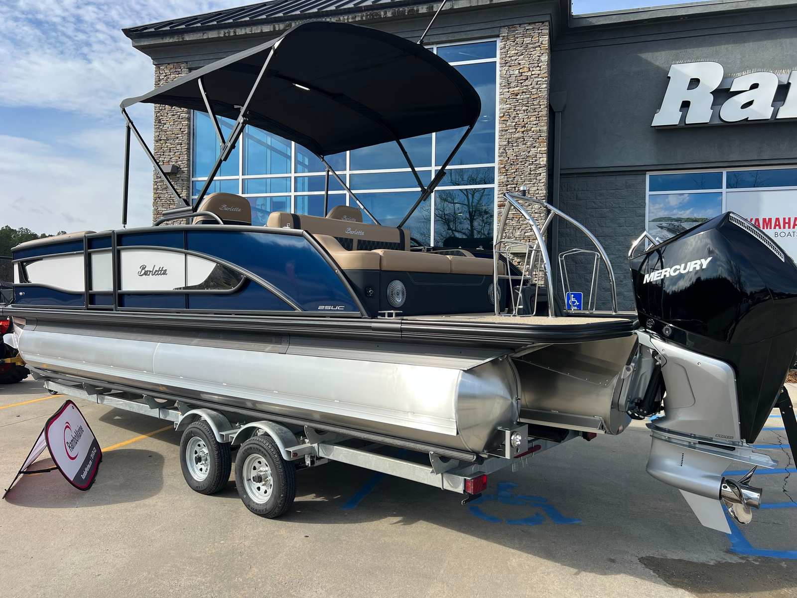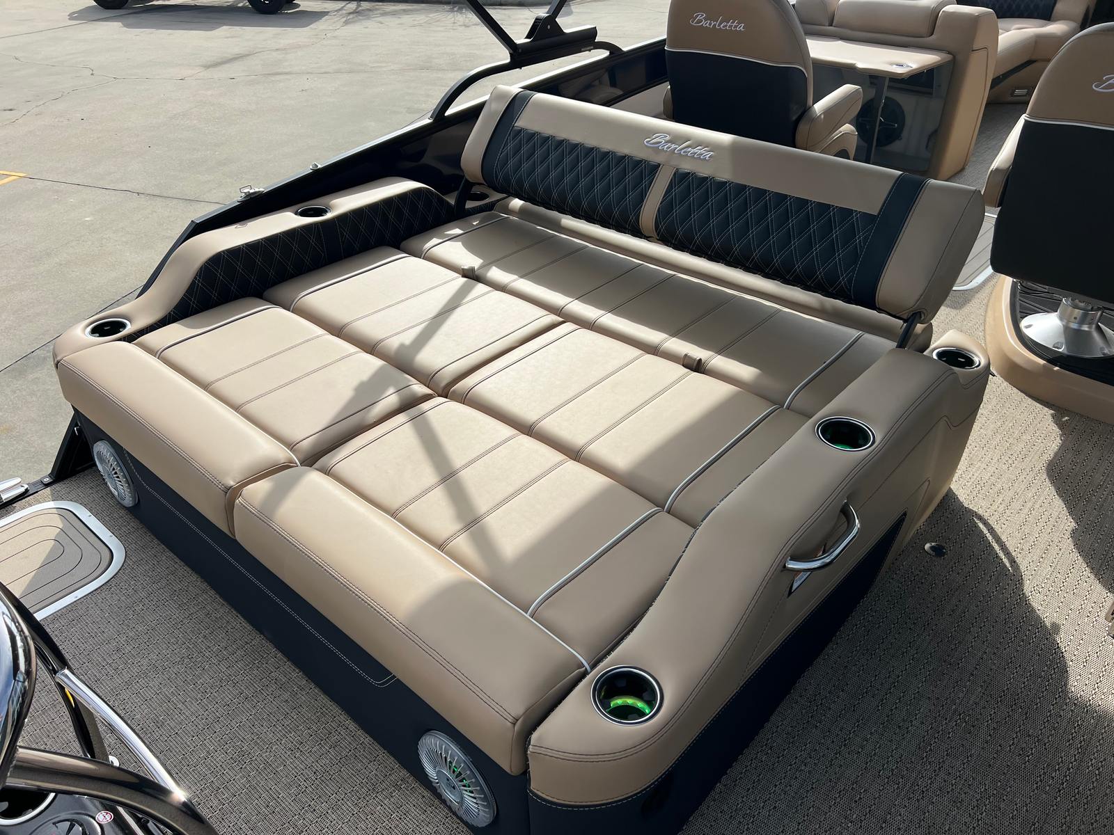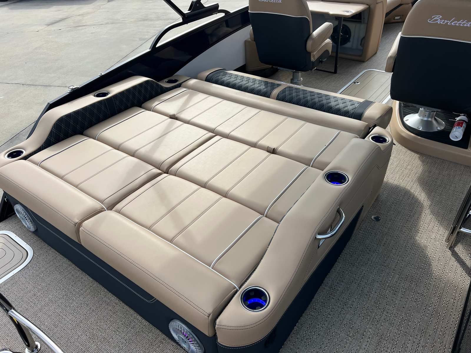 The 2026 Barletta Lusso L25UC is loaded with premium features designed to elevate your time on the water. The Blackout Package Lusso railskin adds a touch of modern sophistication, while the Blue Sapphire and Winter White color scheme ensures you stand out from the crowd. The Carmella Tan with Onyx furniture offers plush seating and ergonomic support, perfect for long days of relaxation or lively gatherings. Amore Tan flooring provides a soft, slip-resistant surface that is both stylish and practical.This pontoon boat is equipped with Mercury Digital DTS Pre-Rig for VERADO engines with Vessel Link, ensuring seamless integration and control of your engine systems. Hydraulic and power assist steering make handling effortless, while digital gauges provide real-time information at a glance. The rigged engine with a stainless steel prop ensures optimal performance and durability. For added convenience, the boat is pre-wired for an additional bimini, allowing you to customize your shade and comfort options. The onboard battery charger with two batteries ensures you have reliable power for all your electronic needs throughout the day.