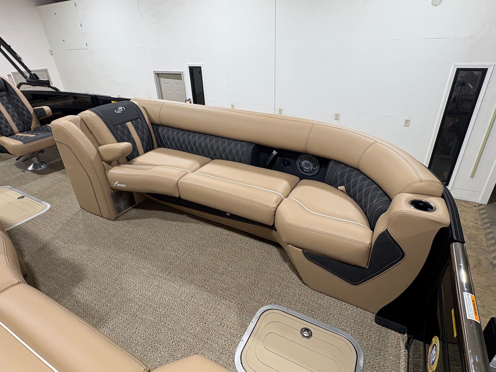 The Barletta Lusso L25UC is packed with premium features that set it apart from other pontoon boats for sale. The Blackout Package Lusso railskin adds a bold, sophisticated touch to the exterior, perfectly complemented by the Black Diamond sweep and accent colors. Inside, the Carmella Tan with Onyx furniture offers plush, ergonomic seating for ultimate comfort, while the Amore Tan flooring provides a stylish and durable foundation for all your onboard activities.Advanced digital gauges keep you informed at a glance, ensuring you have all the information you need for a safe and enjoyable outing. The exterior is protected by a Metal Jacket Protectant, helping to maintain the boat’s pristine appearance season after season. For those who love to entertain after sunset, the exterior lighting package includes white underdeck and underwater lights, creating a captivating ambiance that enhances every evening on the water.