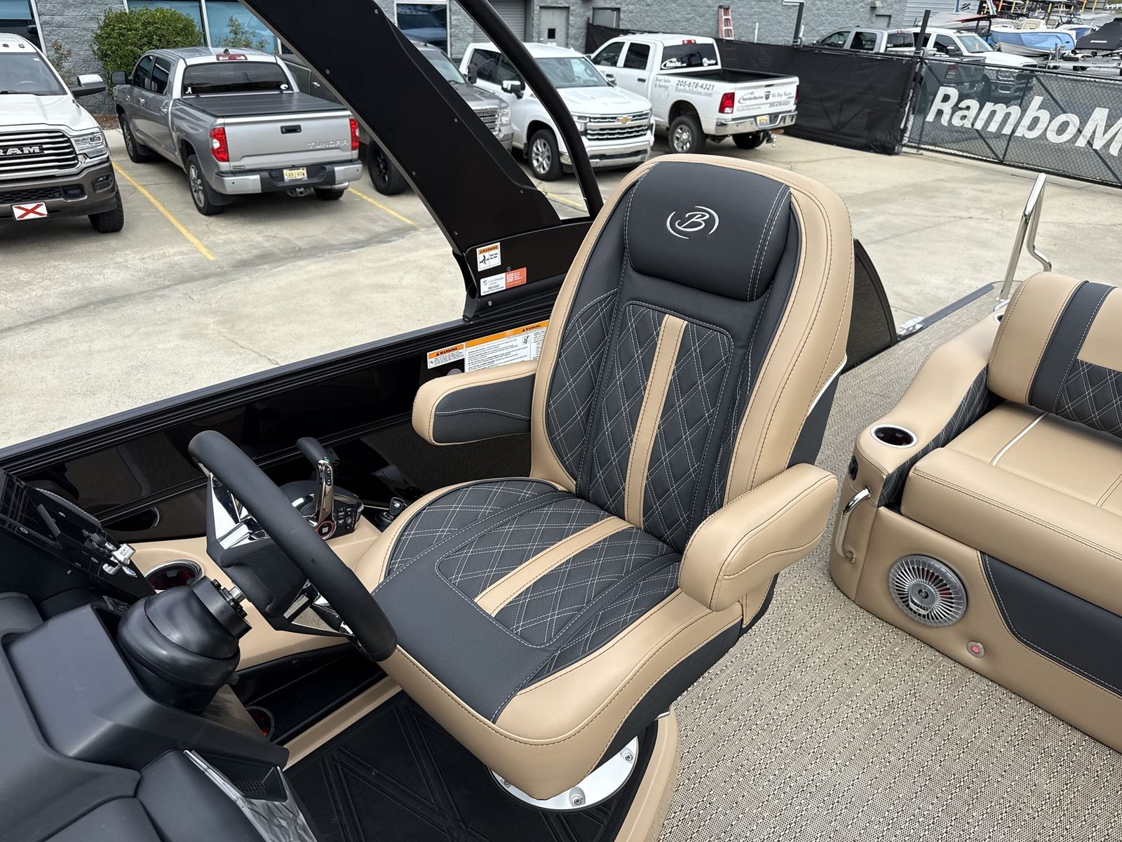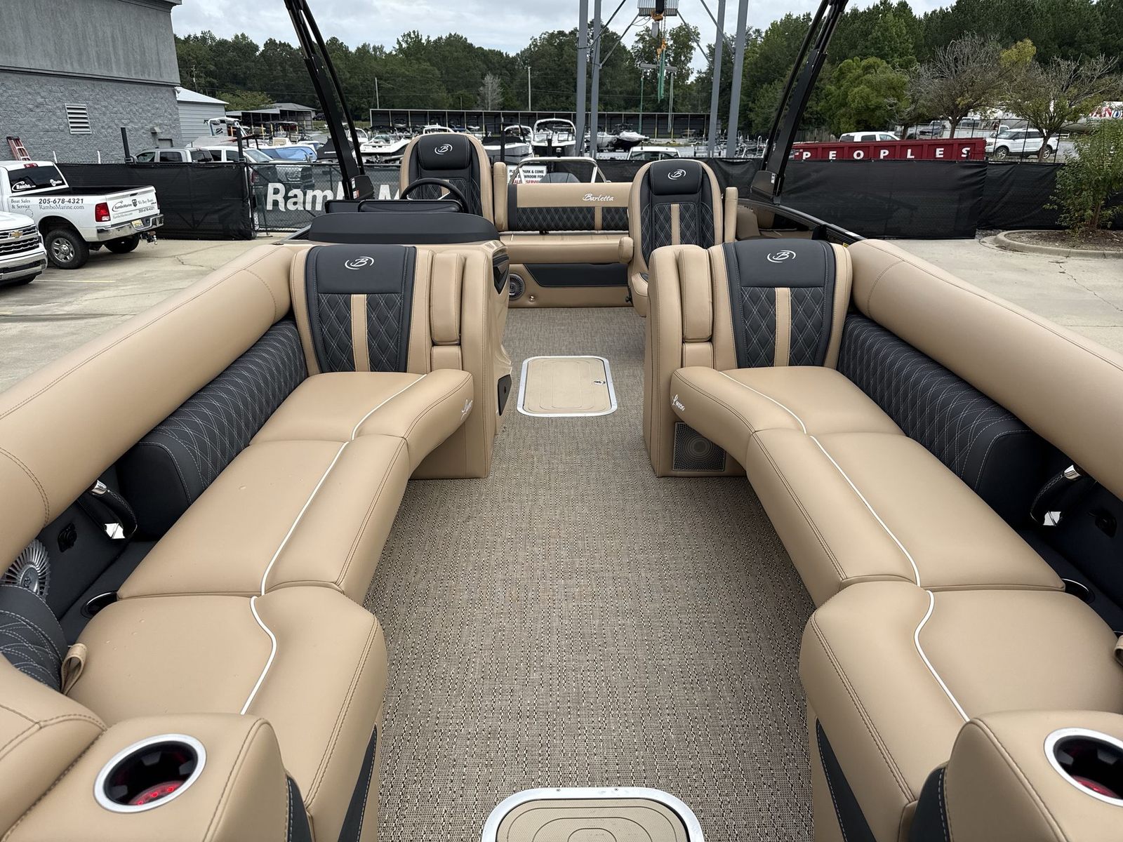 The 2026 Barletta Lusso L25UC stands out as a premier pontoon boat for sale, offering a perfect balance of style, comfort, and functionality. Measuring an impressive 27.5 feet in length, this new pontoon provides ample space for family gatherings, social events, or peaceful escapes on the water. The Lusso L25UC’s modern design is accentuated by its Black Diamond sweep and accent colors, complemented by the Blackout Package Lusso railskin, creating a bold and sophisticated presence wherever you cruise. The Carmella Tan with Onyx furniture and Amore Tan flooring add a touch of elegance and warmth, ensuring every moment onboard feels like a first-class experience.