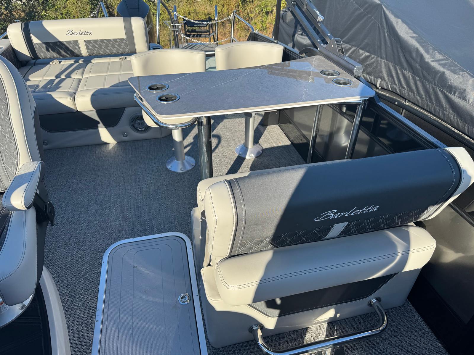 Owning the Barletta Lusso L25UE means embracing a lifestyle of fun, relaxation, and social connection. The spacious deck layout encourages gatherings with family and friends, whether you are hosting a sunset cruise, enjoying a picnic on the water, or celebrating special occasions. The plush Marquesan Gray with Onyx furniture offers exceptional comfort, inviting you to lounge in style as you take in the scenery. The double bimini setup ensures that everyone stays cool and protected from the sun, making long days on the water even more enjoyable. With its striking design and advanced features, this pontoon boat is sure to become the centerpiece of your recreational activities.