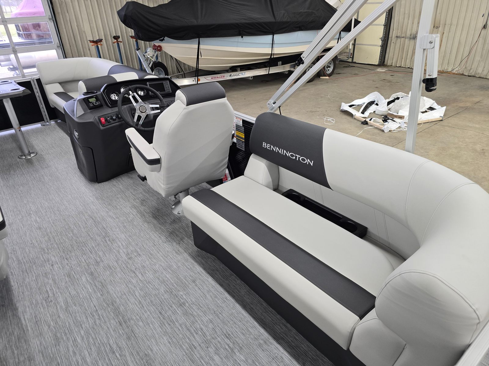 Step aboard and discover a world of comfort and convenience, highlighted by a suite of special features that set the Bennington 20 SSR 2T apart from other pontoon boats for sale. The striking Canvas in Midnight Black creates a sophisticated look, complemented by the No Accent - Textured finish and Ironwood Dash Accent for a touch of elegance. The wireless charger keeps your devices powered up, so you can stay connected and capture every moment on the water.Dimensional Brushed Silver Logos add a premium feel, while the Panel in Gemini Black and Leon Light Silver provide a modern aesthetic that’s both stylish and functional. The interior accent in Slate Simtex enhances the boat’s inviting atmosphere, making it a comfortable retreat for you and your guests. Enjoy the luxury of the Captain’s Recliner Mid Snap and Co-Captain’s Recliner Mid Snap, designed for maximum relaxation during your journey.