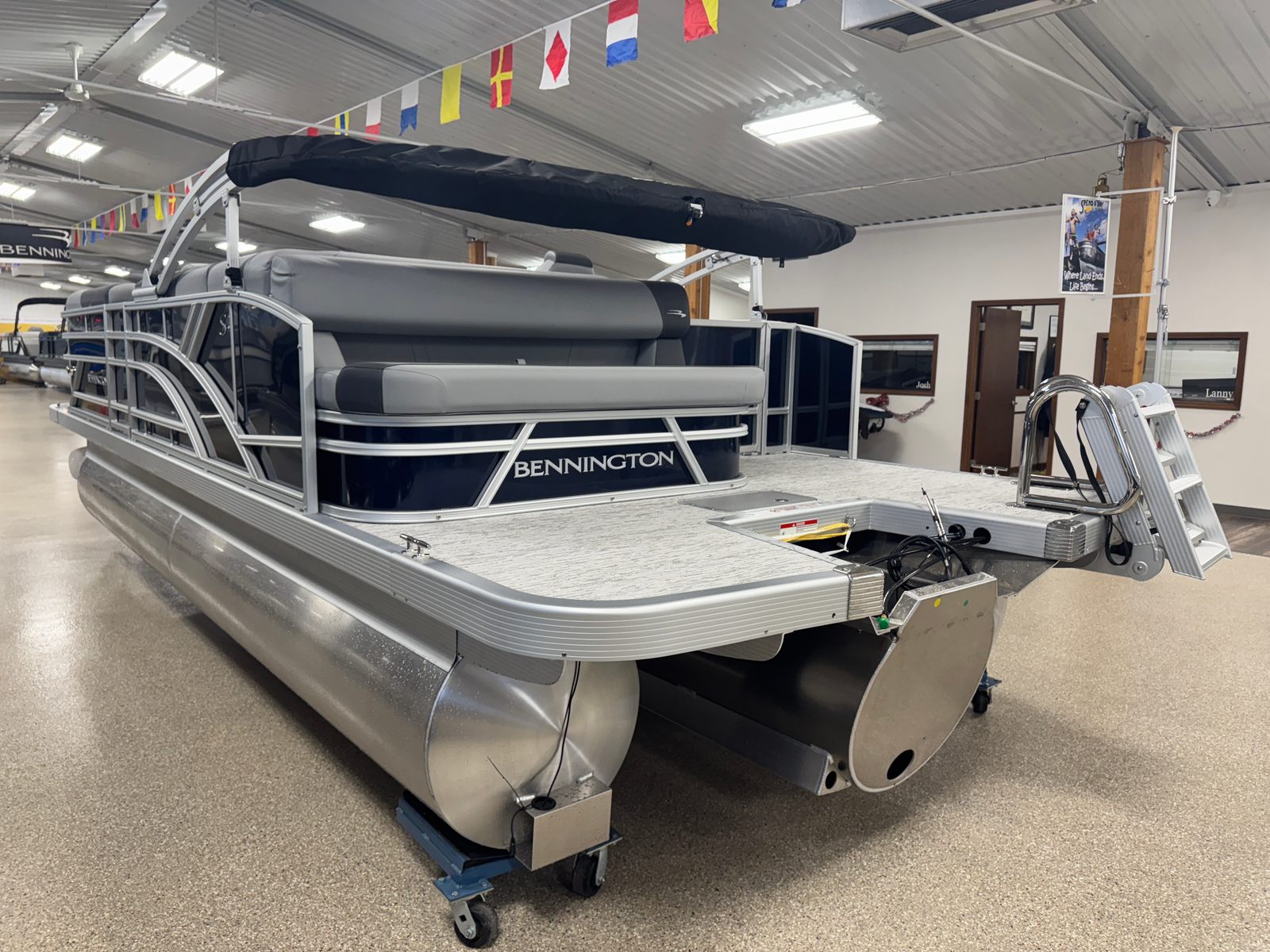 Step aboard the Bennington 21 SLJ SPS and discover a host of premium features designed to maximize your enjoyment and convenience. The single switch battery system provides reliable power management, while the electric power top curved Bimini offers effortless shade adjustment with a sleek, modern look. The midnight black canvas paired with shadow grey accents creates a sophisticated aesthetic, complemented by the ironwood dash accent for a touch of elegance at the helm. Stay connected and powered up with the integrated wireless charger, ensuring your devices are always ready for action. The Valencia grey upholstery adds a refined touch to the spacious seating areas, inviting you to relax in comfort as you cruise. The SPS Performance Package, featuring a 33-gallon transom direct fill, further enhances the boat’s stability and fuel capacity, supporting longer journeys and more time on the water.