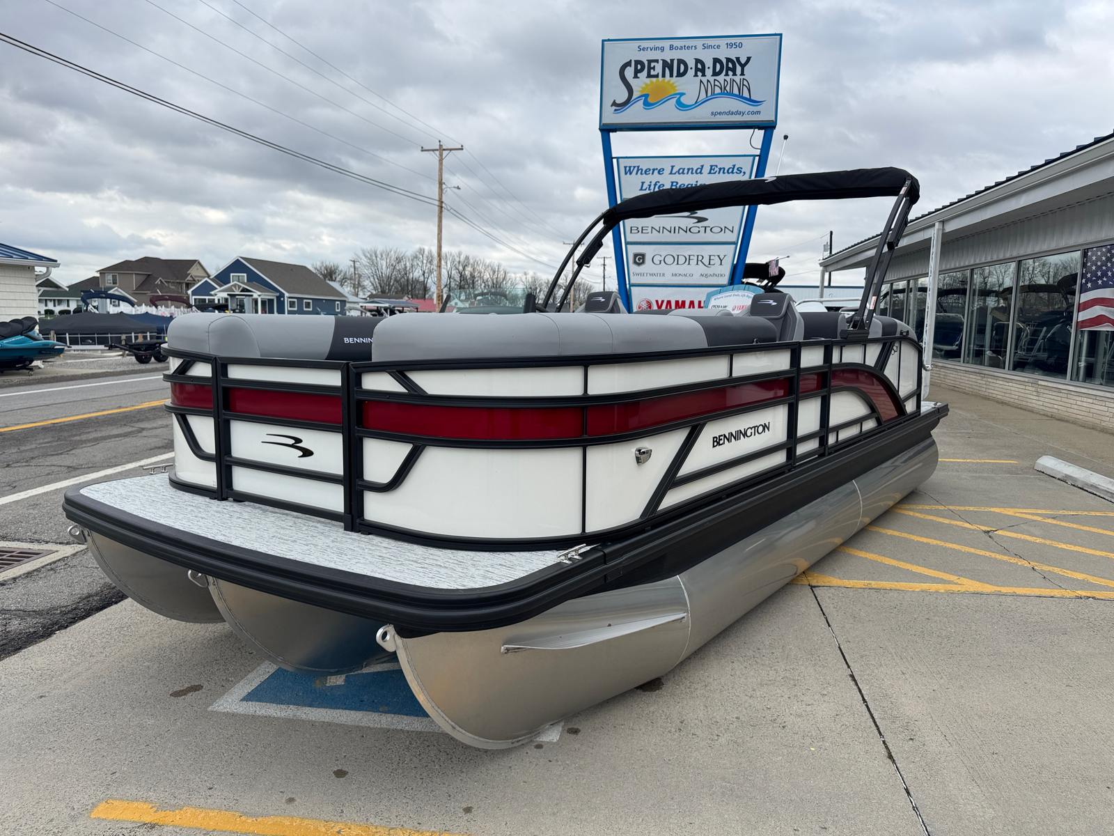 The 2026 Bennington 21 SSB SPS Pontoon stands out as a new model in the world of recreational boating. Measuring an impressive 21.92 feet in length, this pontoon offers ample space for relaxation, entertainment, and fun. Its modern silhouette, highlighted by smooth metallic white panels and blackout logos, gives it a sophisticated look that’s sure to turn heads at any marina or lake. The combination of canvas in midnight black, shadow grey accents, and the ironwood dash accent creates a striking visual appeal, making this Bennington pontoon boat for sale a true showpiece on the water.
