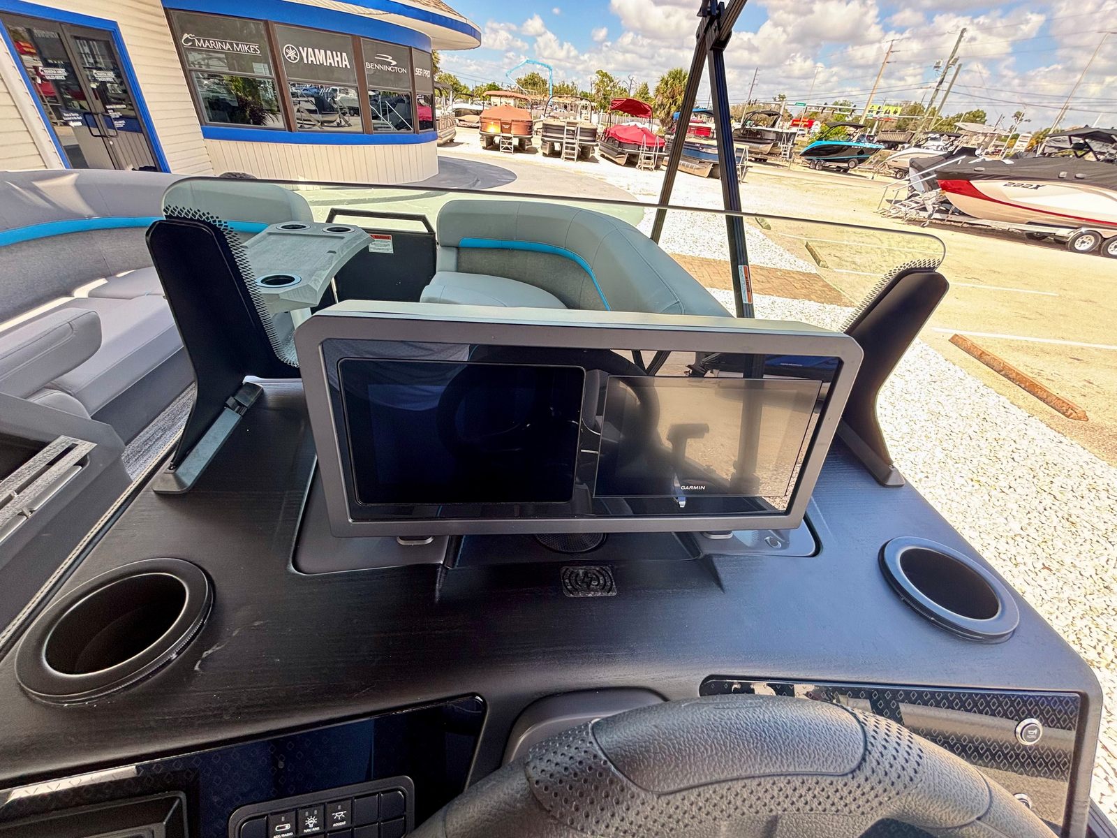 The Bennington 22 MFB SPS is loaded with special features that elevate your boating experience. The Sunshine Package brings an inviting atmosphere to the deck, perfect for basking in the sun or enjoying a cool breeze. The Elevated Console with Pocket Mythos provides enhanced visibility and a modern command center, allowing you to navigate with confidence and style. The Base Furniture M Series ensures plush seating and ergonomic comfort, making long days on the water feel effortless.Aesthetically, the Zebrawood Matte Slate accents and Canvas in Midnight Black create a sophisticated and contemporary look, while the Shoreline Grey exterior adds a touch of elegance. The Wavetamer to Bow 3 Tube Upgrade enhances stability and ride quality, ensuring a smooth journey even in choppier conditions. For those who love shade and protection from the elements, the Double 15.5' Bimini with Ball Socket in black offers generous coverage, allowing you to relax in comfort no matter the weather.