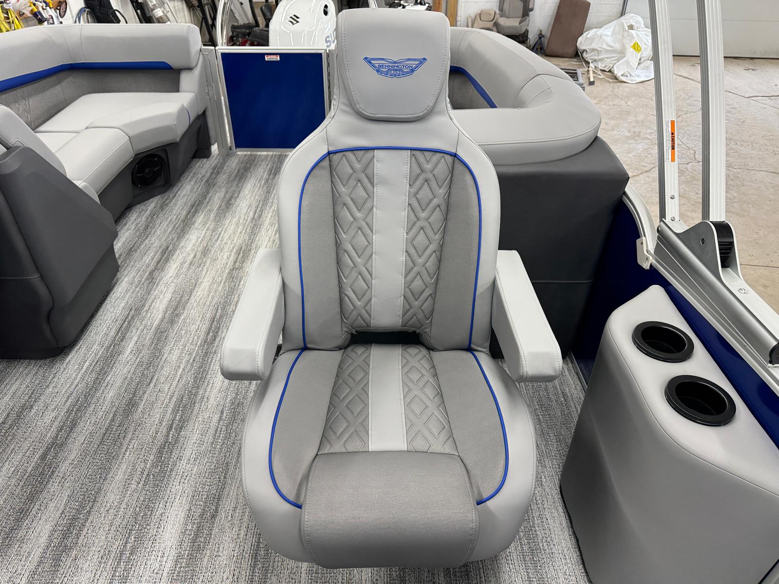 The 2026 Bennington 22 MFB SPS pontoon stands out with its impressive 24.25-foot length, offering ample space for relaxation and socializing. As a new Bennington boat for sale, this model showcases the brand’s commitment to craftsmanship, comfort, and cutting-edge design. The sleek exterior features a Smooth Metallic Luminous Blue panel with Smooth Metallic White accents, complemented by a sophisticated Shoreline Grey finish. Inside, the Luminous Blue Simtex interior accent adds a touch of elegance and modern flair, creating a welcoming atmosphere for every adventure.