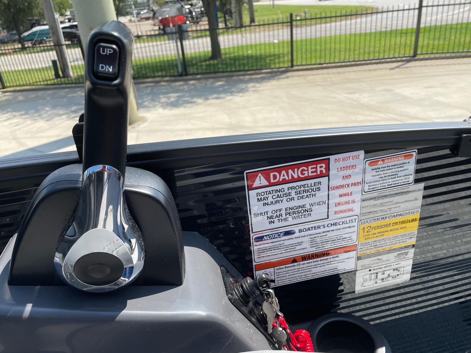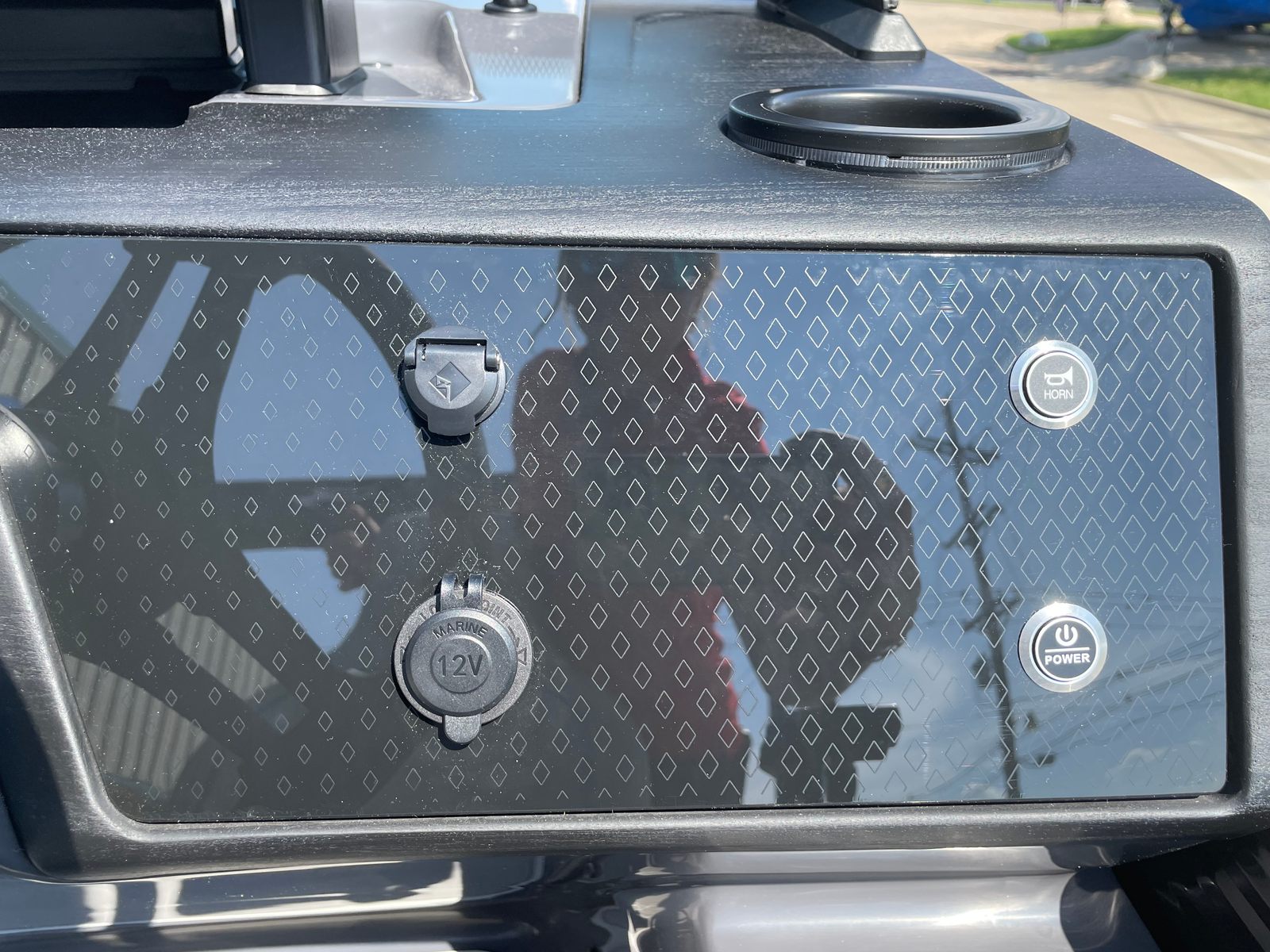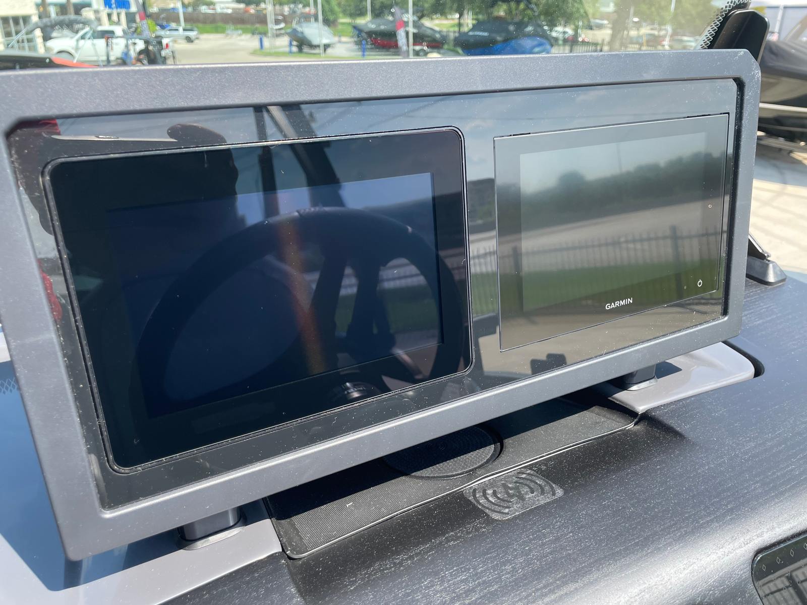 Step aboard and discover a world of premium features designed to elevate your boating experience. The dual battery switch with fuse offers enhanced reliability and peace of mind, ensuring your electronics and accessories stay powered throughout your journey. Ambient toekick lights (1-37" and 1-41") create a welcoming atmosphere, perfect for evening cruises or entertaining guests. The elevated console with pocket Mythos adds a touch of sophistication and convenience, placing controls and storage right at your fingertips.Luxury Furniture M Series seating invites you to relax in style, with plush cushions and ergonomic design that make every trip comfortable. The Zebrawood Matte Slate accents provide a refined, contemporary look, while the Canvas in Midnight Black adds a sleek finishing touch. Lumbar lighting enhances the ambiance, making nighttime outings both safe and visually stunning. The curved Bimini top (M/LXS No Light Blk) offers shade and protection from the elements, ensuring you and your guests stay cool and comfortable on sunny days.