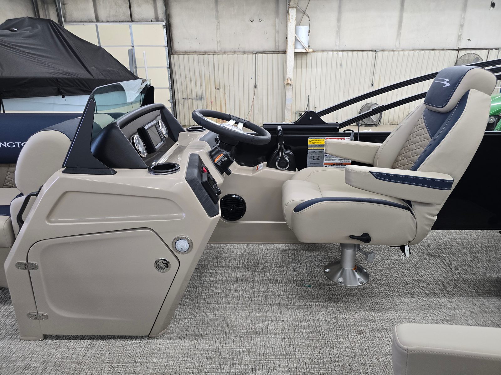 The Bennington 22 SSB SPS is packed with special features designed to enhance your time on the water. The single switch battery system offers straightforward operation, while the blackout logos and Ironwood Dash Accent add a touch of sophistication to the boat’s aesthetic. The Bimini – Electric Power Top Curved Analog S Blk provides effortless shade and protection from the sun, and the Canvas – Midnight Black and Dolce materials ensure durability and style. These features not only elevate the look of your pontoon but also contribute to a comfortable and enjoyable boating experience.