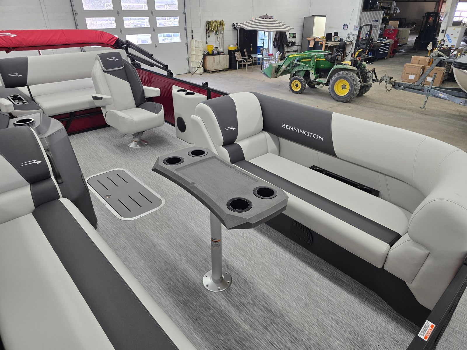 The 2026 Bennington 22 SSB SPS is a new pontoon boat that measures just under 23 feet in length, offering ample space for family and friends to relax and enjoy the water. As part of Bennington’s renowned S Series, this model is crafted with attention to detail and a focus on comfort, making it a top choice for those seeking a Bennington boat for sale that stands out in both aesthetics and functionality. The sleek lines, modern accents, and thoughtful layout make this pontoon a true head-turner at any marina or lake.