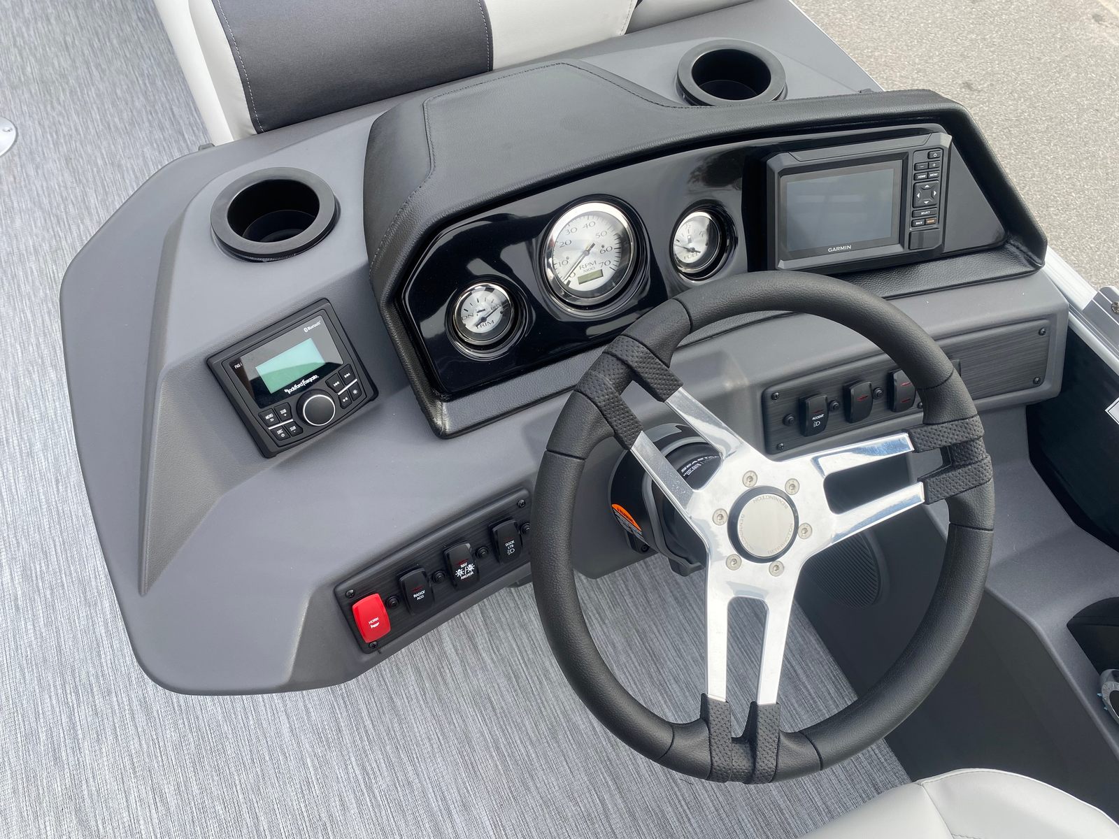 The Bennington 22 SSB SPS is loaded with special features that elevate both comfort and convenience. The Gemini Black paneling and Midnight Black canvas give the boat a bold, contemporary look that turns heads at every dock. Inside, the Leon Light Silver and Slate Simtex accents create a refined and relaxing environment, while the Ironwood dash accent adds a touch of elegance to the helm. The wireless charger ensures your devices stay powered throughout your adventures, keeping you connected and entertained on the water. The ski tow bar, specifically designed for the SPS package, makes it easy to enjoy watersports with family and friends.