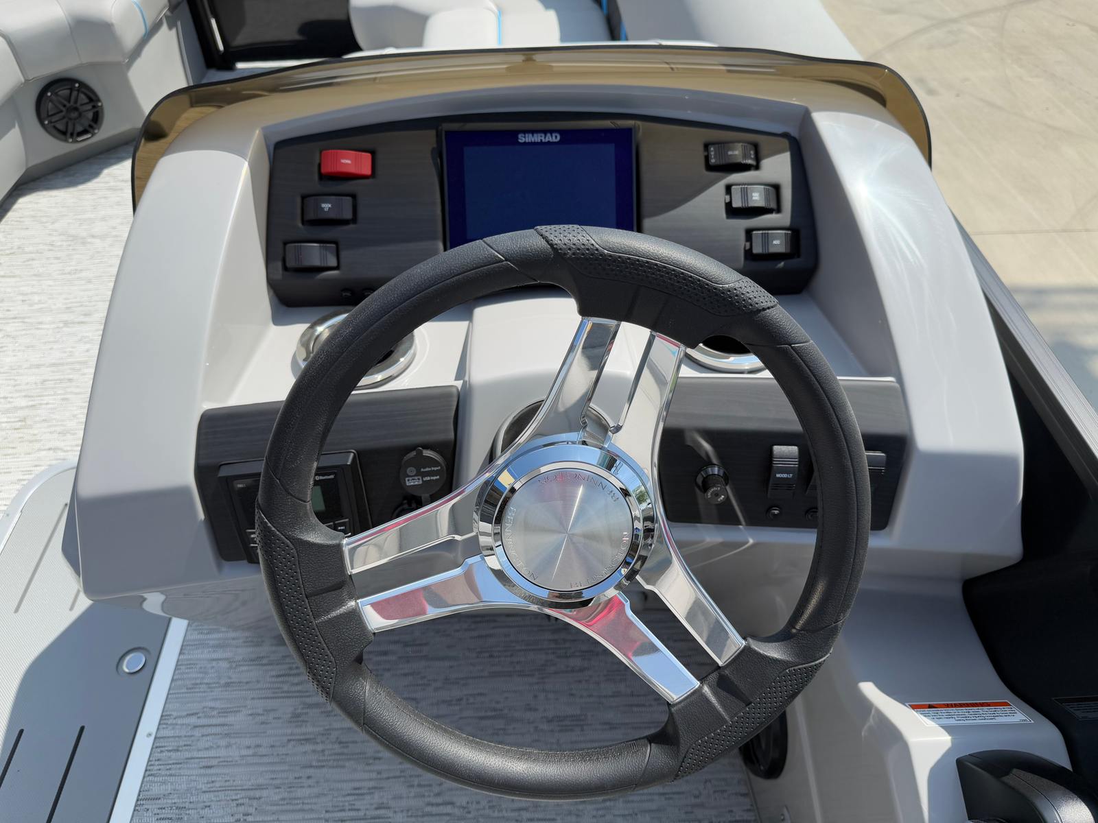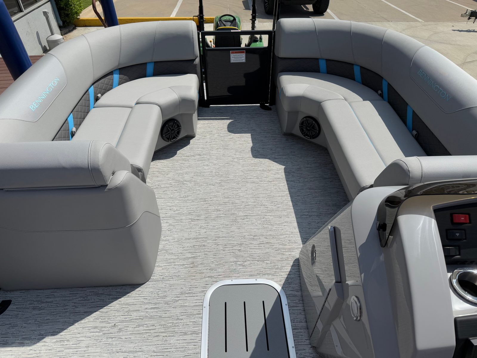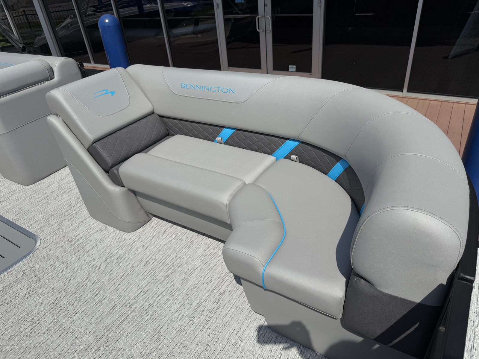 The Bennington 22 Sxsb SPS is loaded with premium features that elevate your boating experience. The portable armrest with stainless steel cup holders adds a touch of convenience and luxury, ensuring that your favorite beverages are always within reach. Rub rail protectors safeguard your pontoon’s exterior, maintaining its pristine appearance even after frequent docking. The RGB toe kick lighting and RGB controller SX allow you to customize the ambiance on board, creating a vibrant and inviting atmosphere for evening cruises or celebrations.For music lovers, the Rockford Fosgate M1 lighted speakers deliver crystal-clear sound and dynamic lighting effects, transforming your pontoon into a floating entertainment hub. The zebrawood matte slate accents and canvas in midnight black provide a sophisticated and modern aesthetic, while the blackout logos add a bold finishing touch. Every detail of the Bennington 22 Sxsb SPS is thoughtfully designed to enhance both style and functionality, making it a top choice among pontoon boats for sale.