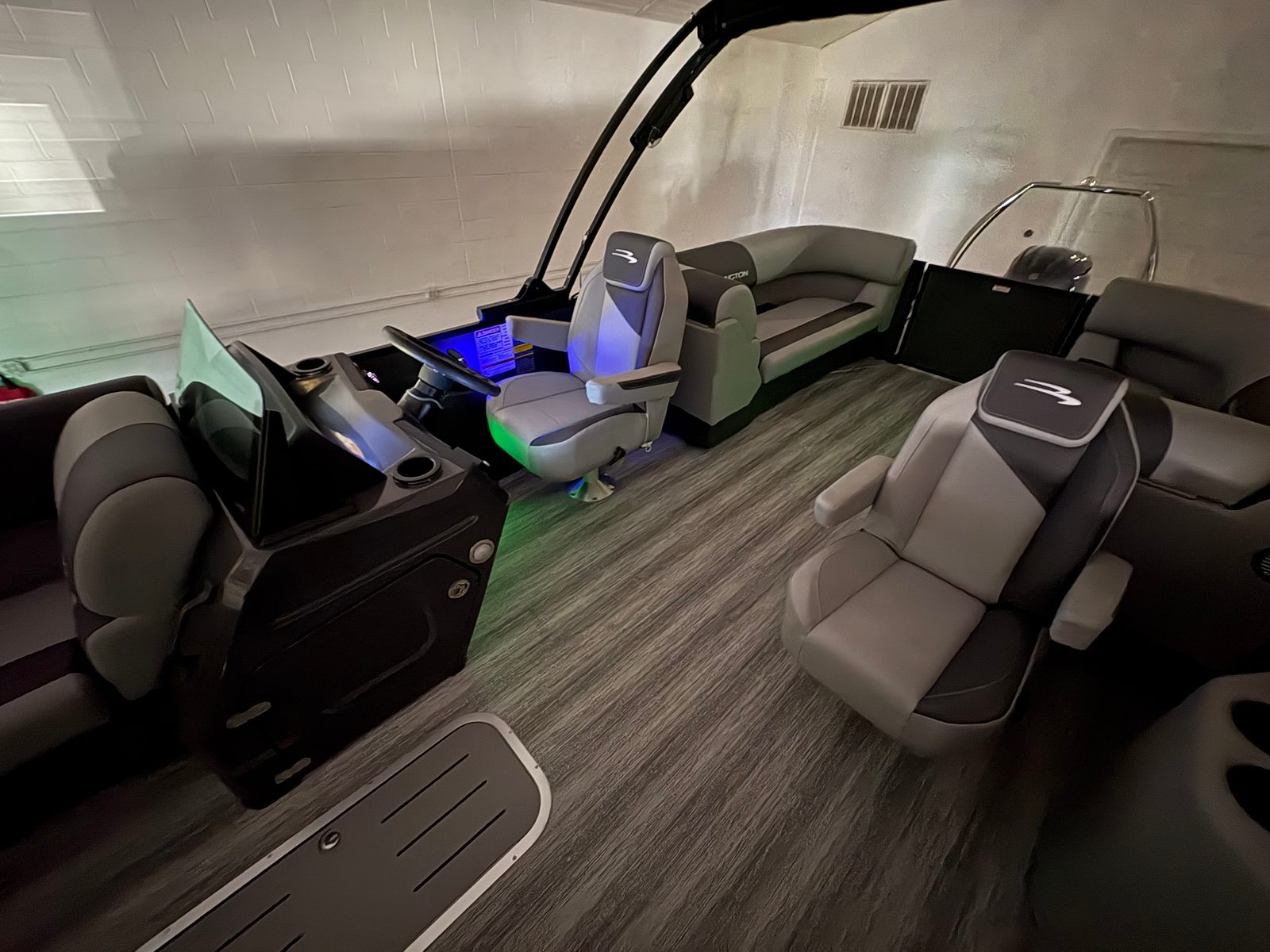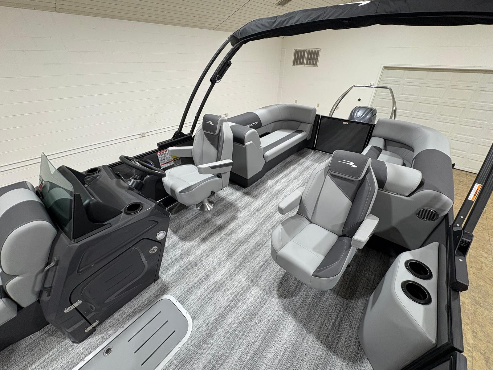 The Bennington 23 SSR SPS is packed with premium features that elevate your boating experience. The electric power top curved Bimini in black offers convenient shade and protection from the sun, allowing you to enjoy long afternoons on the water in comfort. The Serene Soft Touch Vinyl with Simtex accents creates a plush, inviting seating environment, while the Ironwood dash accent adds a touch of elegance to the helm. The Blackout Luxe Package (S) and blackout logos contribute to the boat’s striking visual appeal, ensuring it stands out in any marina.The Midnight Black canvas and Shadow Gray details not only enhance the boat’s aesthetics but also provide durability and resistance to the elements. The dual switch battery system with fuse ensures reliable power management, so you can focus on enjoying your time on the water without worry. Every detail of this pontoon boat has been thoughtfully designed to maximize comfort, style, and functionality.