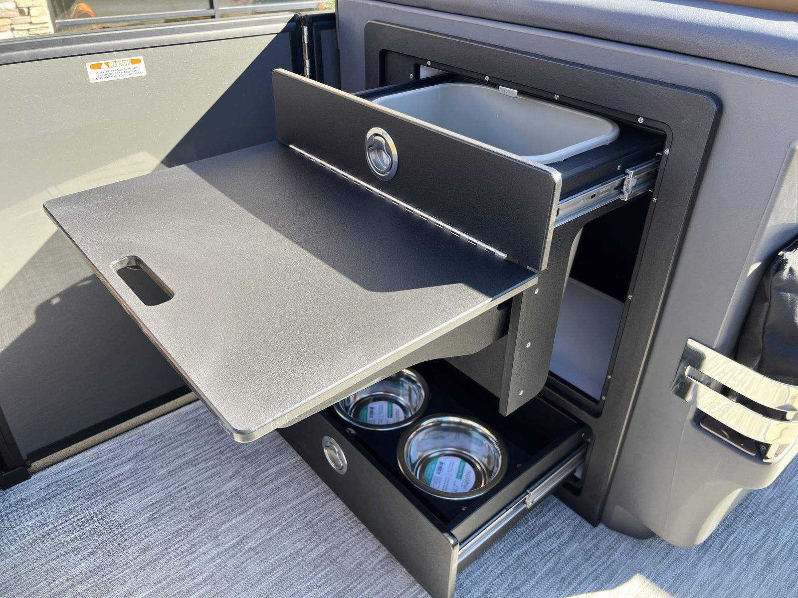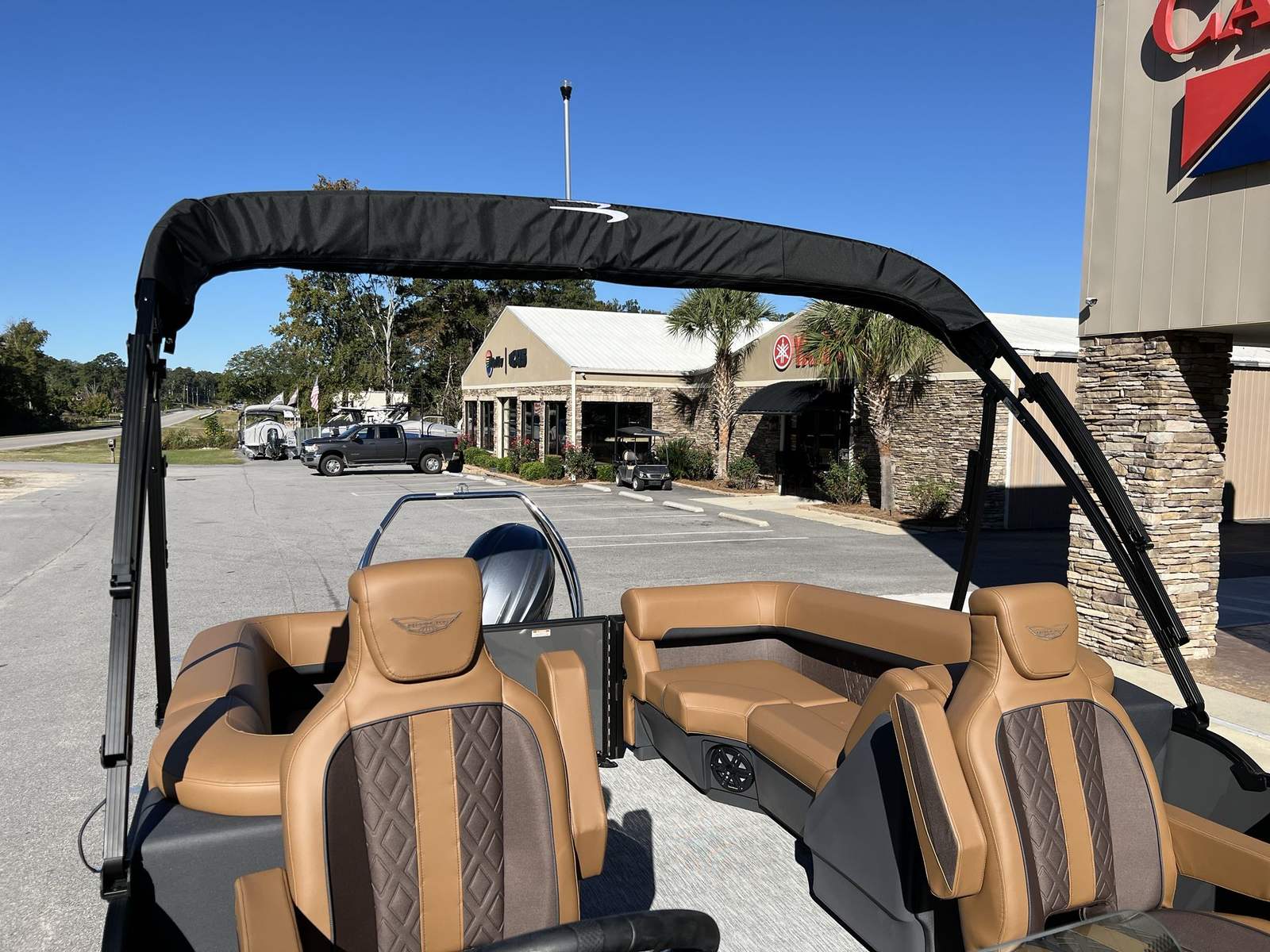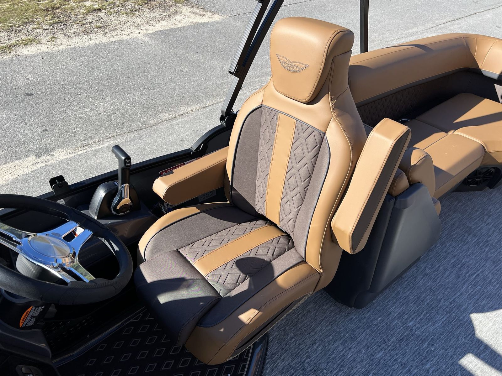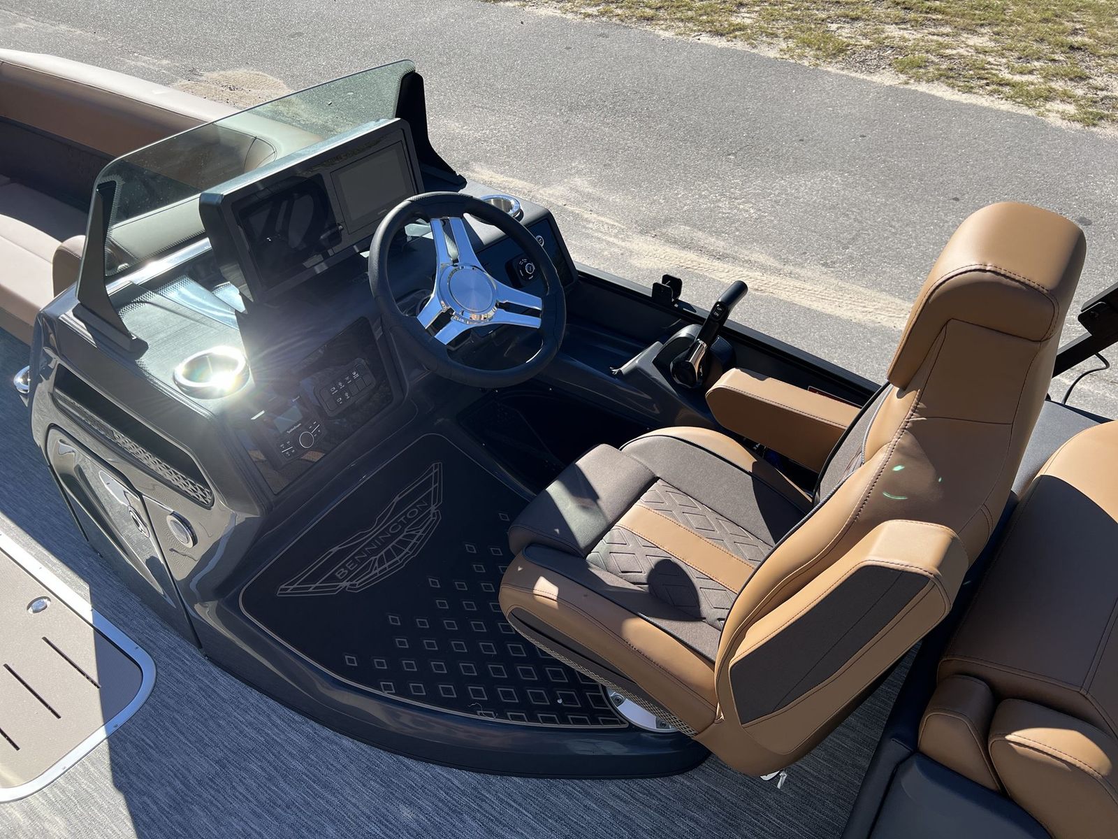 Step aboard and discover a world of premium features designed to enhance your boating experience. The Bennington 24 MFB SPS is equipped with RGB Control M Series lighting, allowing you to set the perfect ambiance for any occasion. Exterior side lighting and toekick lights (2-41" and 2-62") add a sophisticated touch, illuminating the deck for evening cruises and gatherings. The Rockford Fosgate Ml lighted speakers (six in total) deliver crystal-clear audio, transforming your pontoon into a floating entertainment hub.The elevated console with Pocket Mythos offers ergonomic controls and convenient storage, while the base furniture M Series ensures plush seating and relaxation. The interior is adorned with Zebrawood Matte Beige accents, creating a warm and inviting atmosphere. For protection from the sun, the canvas is finished in Midnight Black, complemented by a curved M/LXS No Light Black bimini for shade and style.