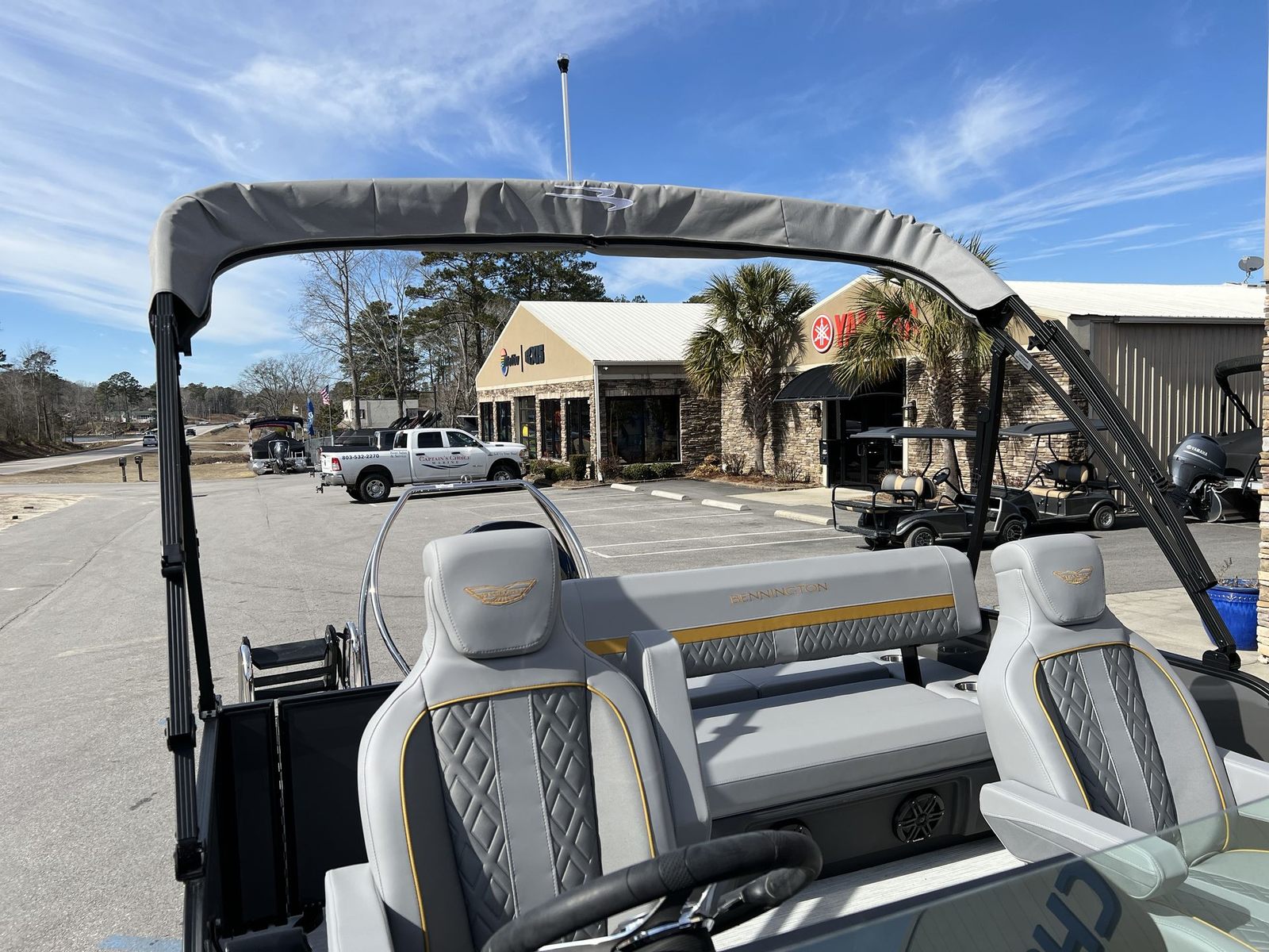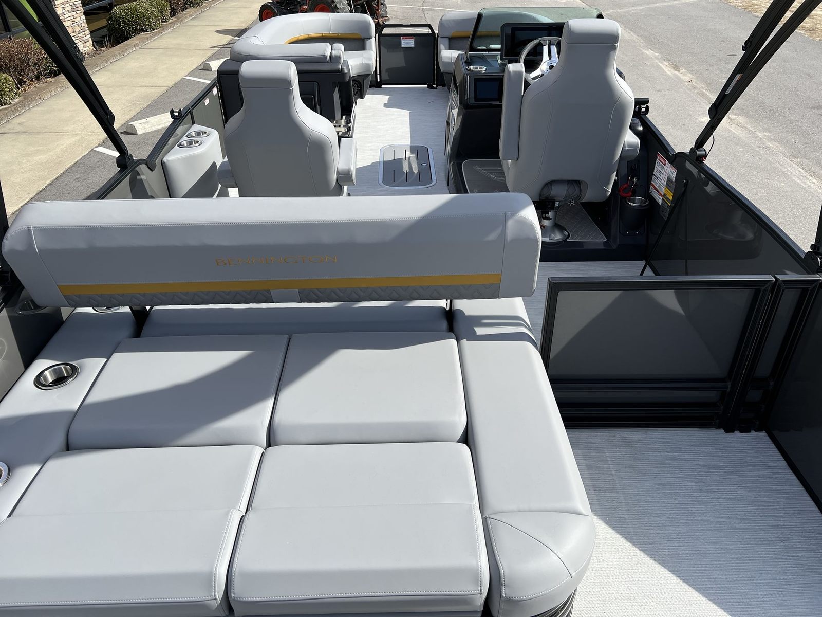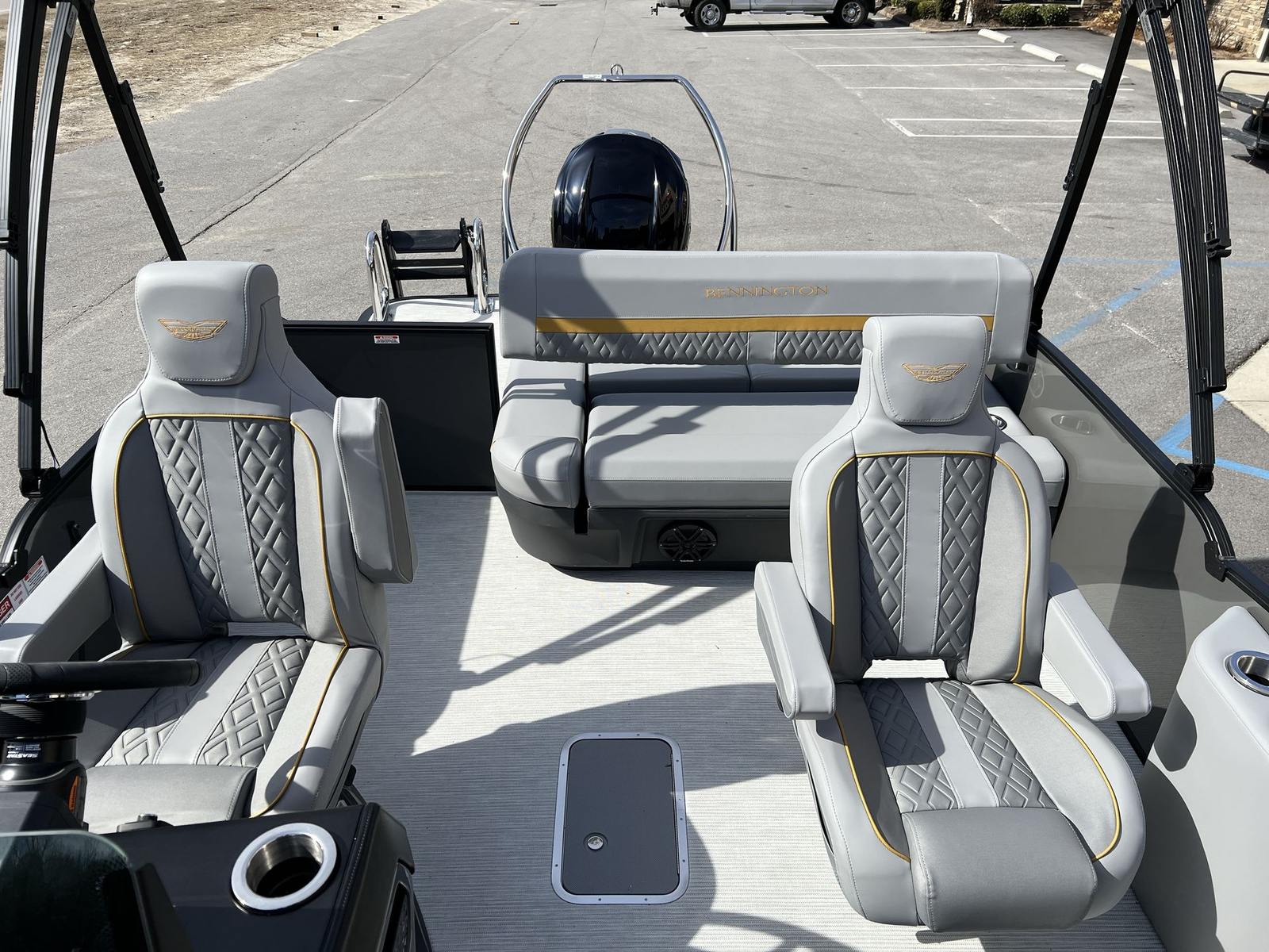 Step aboard the Bennington 24 MSB ESP and you will immediately notice the attention to detail in every aspect of its design. The accent in Smooth Olaedo Gold and the Zebrawood Matte Slate finish create a sophisticated and contemporary atmosphere, while the Smooth Anthracite paneling adds a touch of elegance. The interior accent in Olaedo Gold Simtex not only enhances the visual appeal but also provides a luxurious and comfortable seating experience for everyone on board.For those who love to entertain, the Rockford Fosgate M1 lighted speakers set the mood with high-quality sound and customizable lighting, ensuring your gatherings are always lively and memorable. The toekick lights (2-62") add a subtle yet striking ambiance, perfect for evening cruises or late-night dockside relaxation. Practical features such as aft pop-up cleats make docking and securing your pontoon a breeze, while the black rumb rail insert and black logos complete the boat’s modern, cohesive look. The steering is enhanced with power hydraulic assist, offering effortless control and maneuverability, even in tight spaces or challenging conditions.