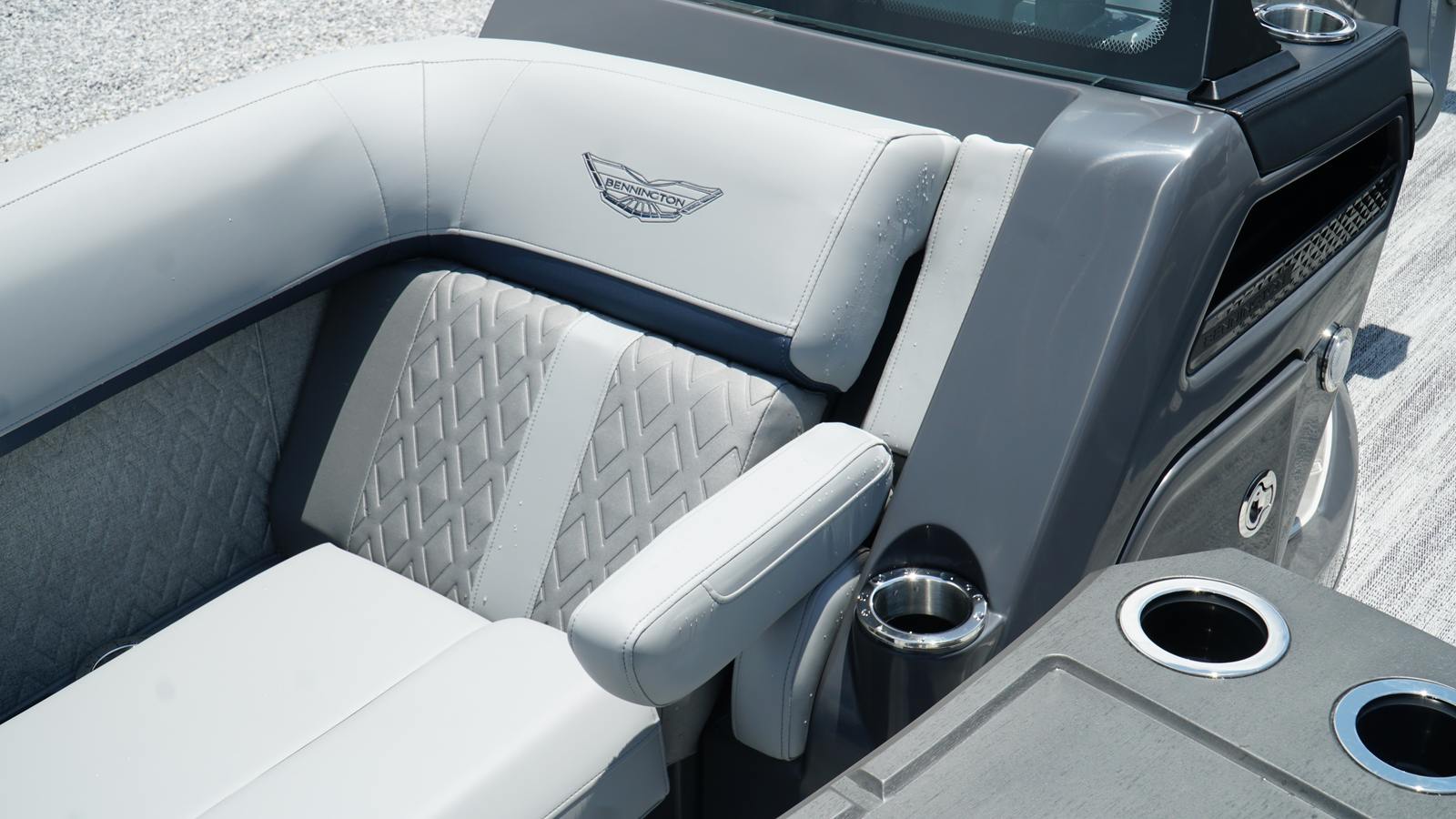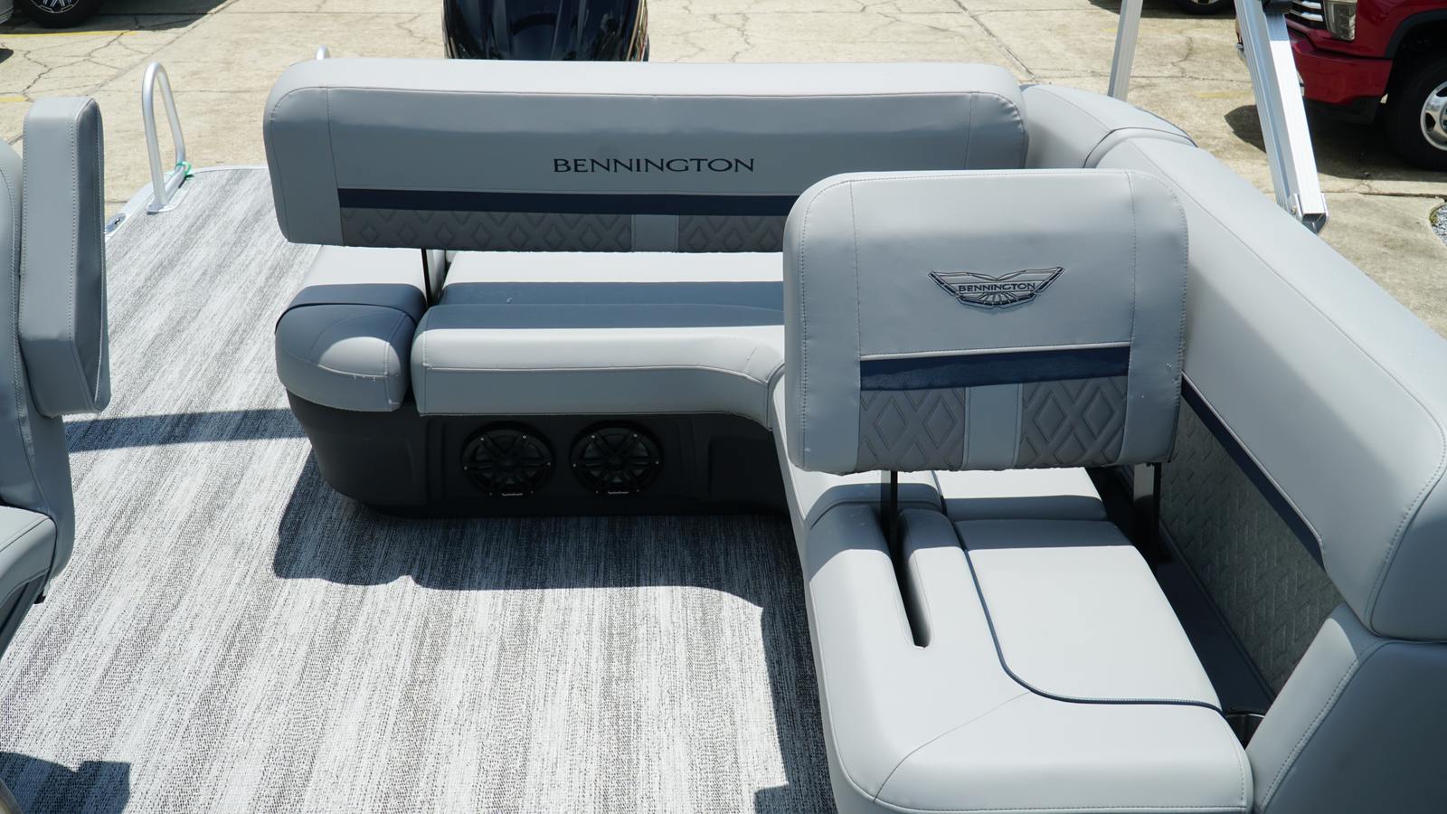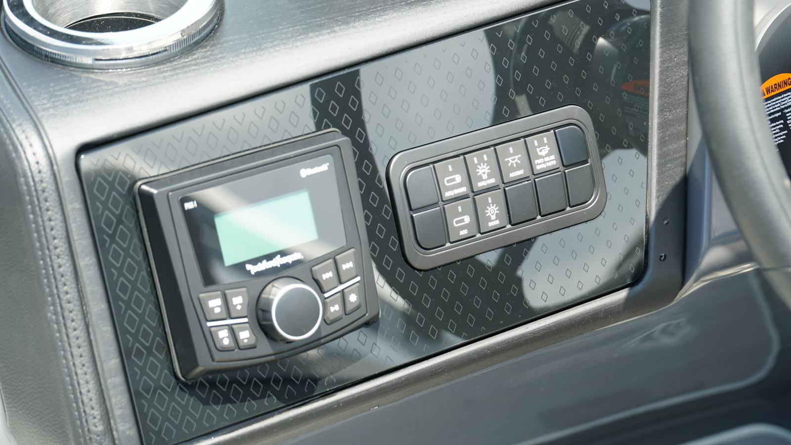 The Bennington 24 MSB SPS is packed with special features designed to enhance your boating experience. The dual switch battery system with fuse ensures reliable power management, while the RGB Control M Series allows you to customize the ambiance with vibrant lighting options. Toekick lights (2-62") add a stylish touch and improve visibility during evening cruises. Entertainment is elevated with six Rockford Fosgate M1 lighted speakers, delivering crystal-clear sound and immersive audio for your favorite playlists. The elevated console with pocket Mythos provides convenient storage and easy access to controls, while the interior accent in Ocean Blue Simtex creates a sophisticated and inviting atmosphere. Every detail has been thoughtfully considered to maximize comfort, convenience, and enjoyment.