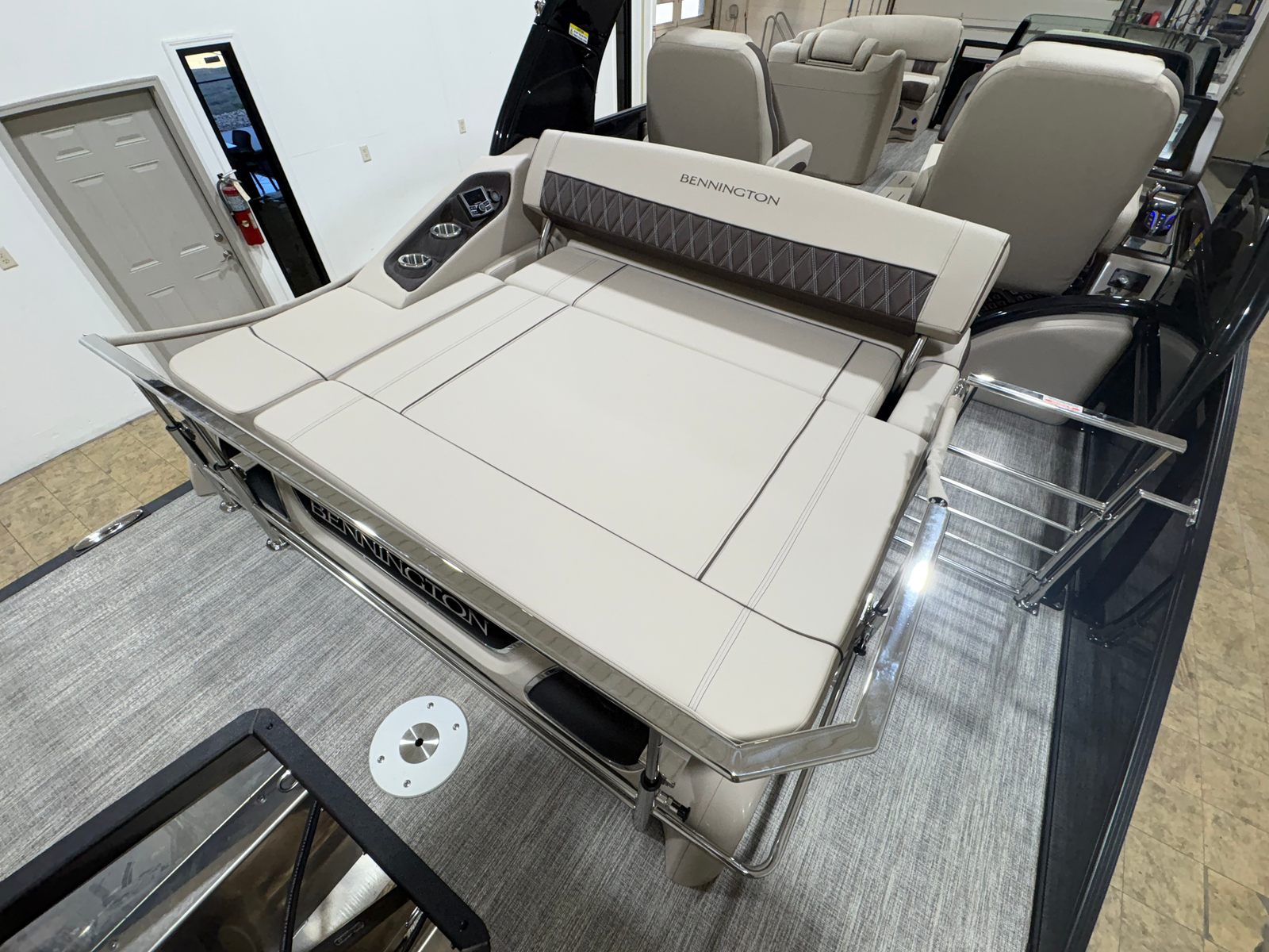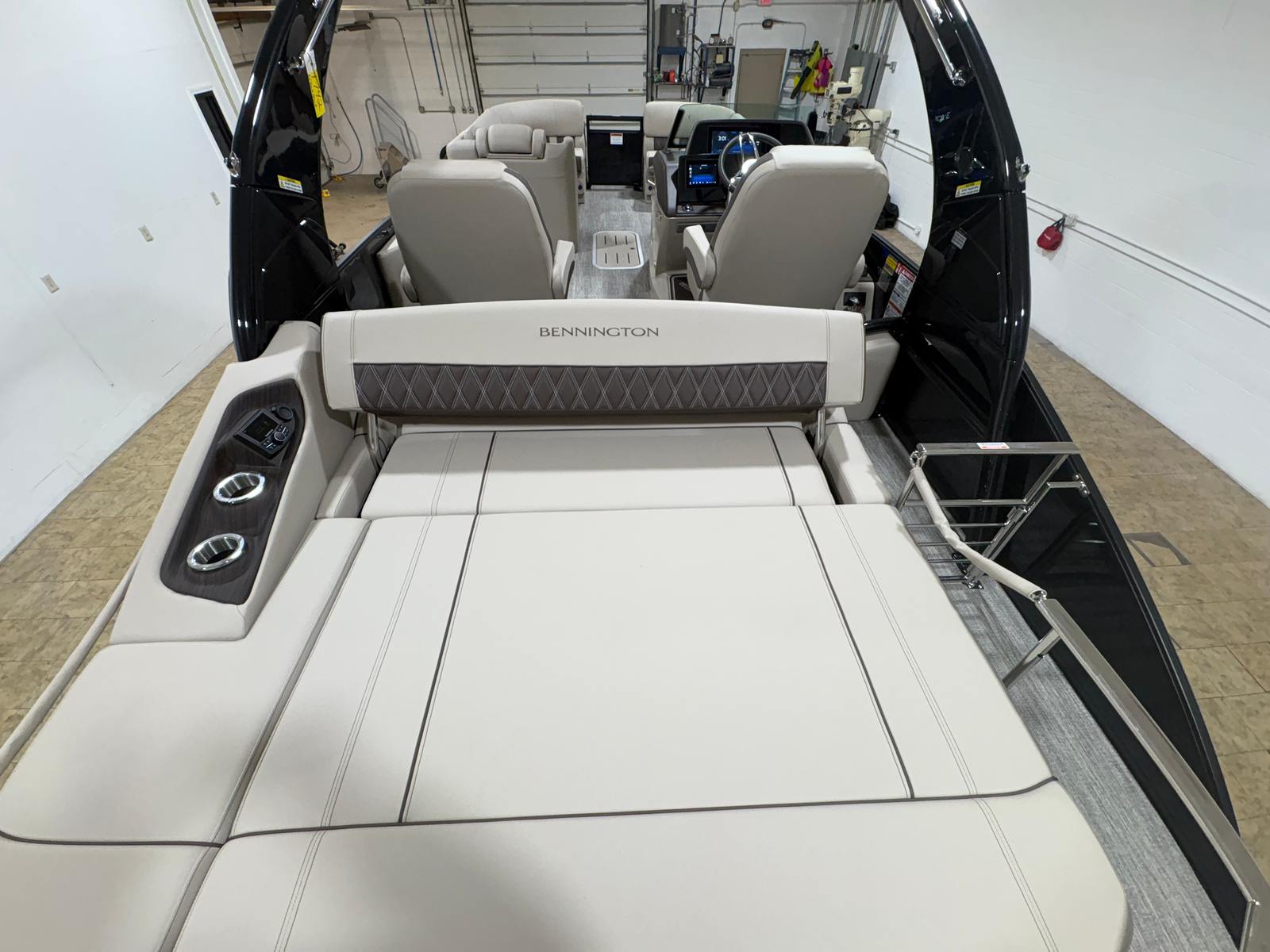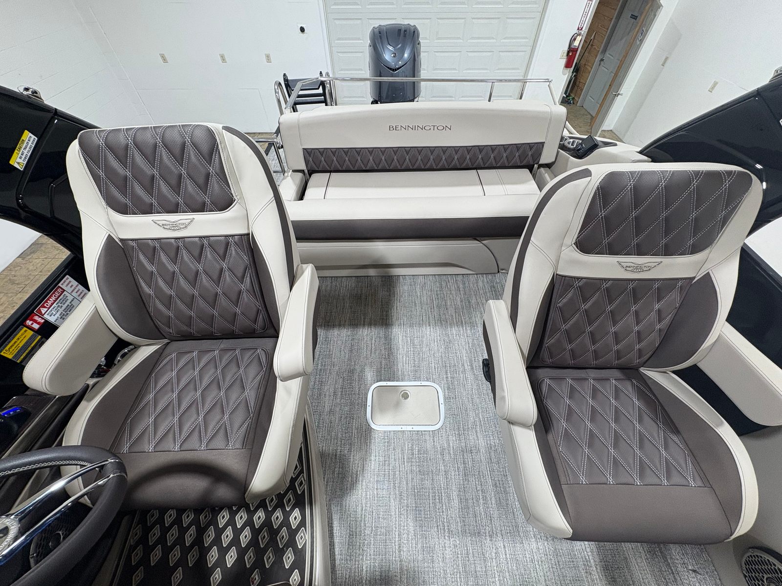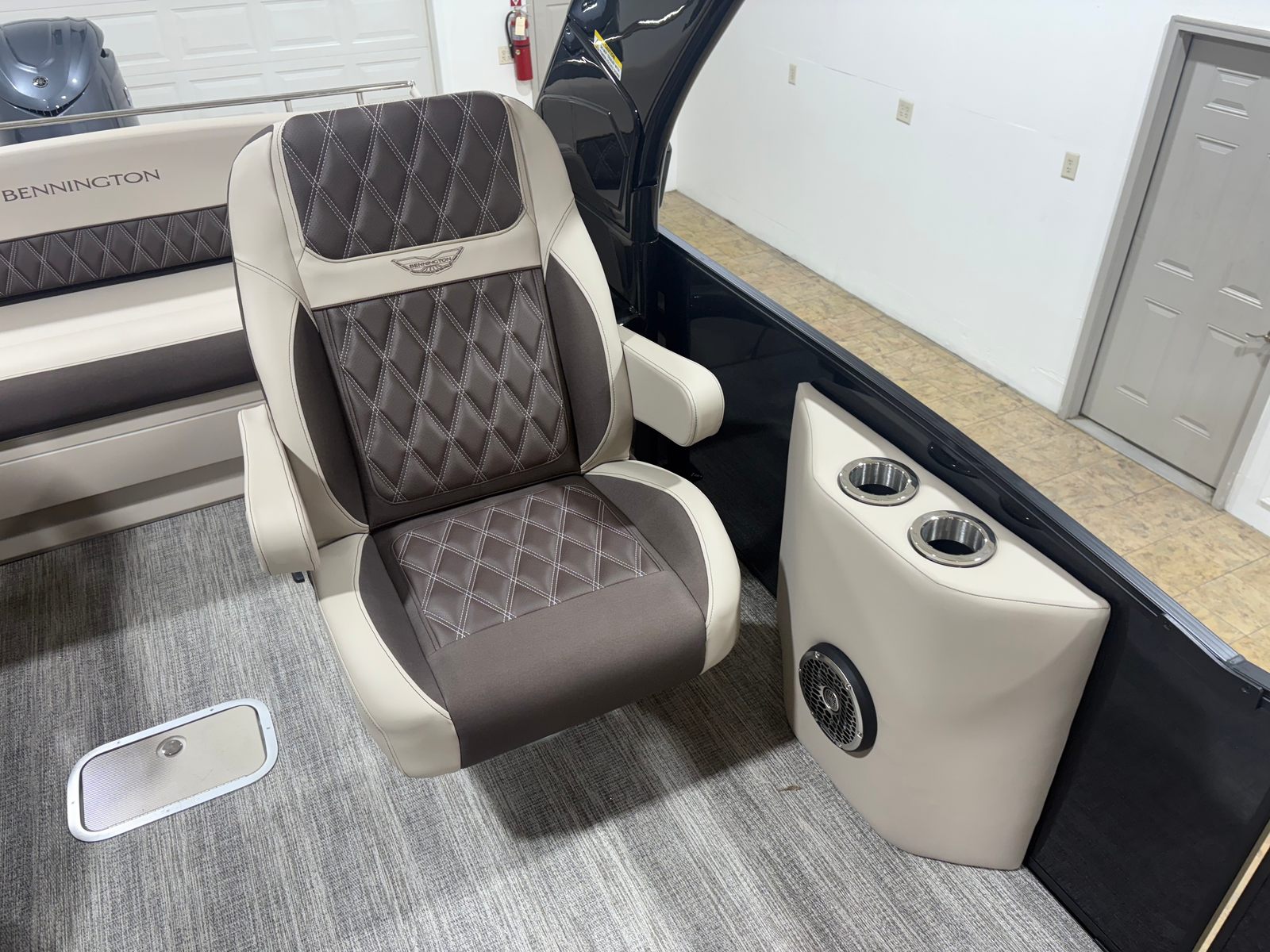 Step aboard and immerse yourself in a world of comfort and entertainment. The Bennington 25 Qsba ESP is equipped with a host of special features that set it apart from other pontoon boats for sale. Enjoy the ambiance created by illuminated cupholders (six in total), underwater lighting, and strategically placed toekick lights in varying lengths (1-41", 1-62", and 2-72"). These lighting elements not only enhance the boat’s aesthetic appeal but also provide practical illumination for evening cruises and social gatherings.The interior is a showcase of luxury, featuring Zebrawood Matte Beige accents and base pillowtop diamond-stitched upholstery (Q) for superior comfort and style. The interior accent in perforated espresso adds a touch of sophistication, creating an inviting atmosphere for passengers. Blackout logos give the boat a modern, sleek look that complements its overall design.For music lovers, the Bennington 25 Qsba ESP boasts a premium audio system with Rockford Fosgate 6.5" M2 speakers (six on the boat and two on the arch), a powerful 10" M2 subwoofer, and a PM Punch amplifier upgrade. Whether you’re hosting a party or enjoying a quiet sunset cruise, the sound quality ensures every moment on board is accompanied by your favorite tunes in crystal-clear detail.
