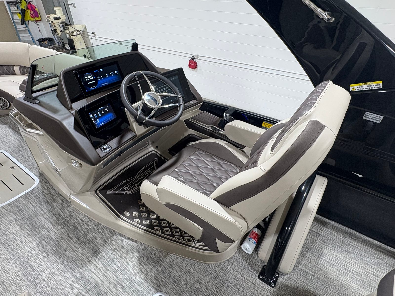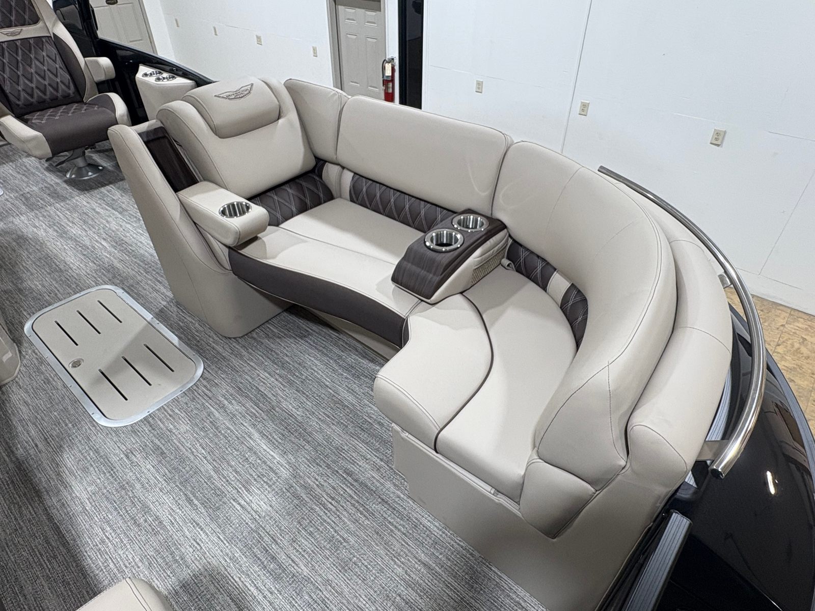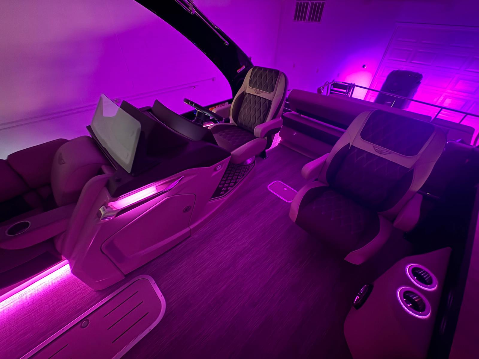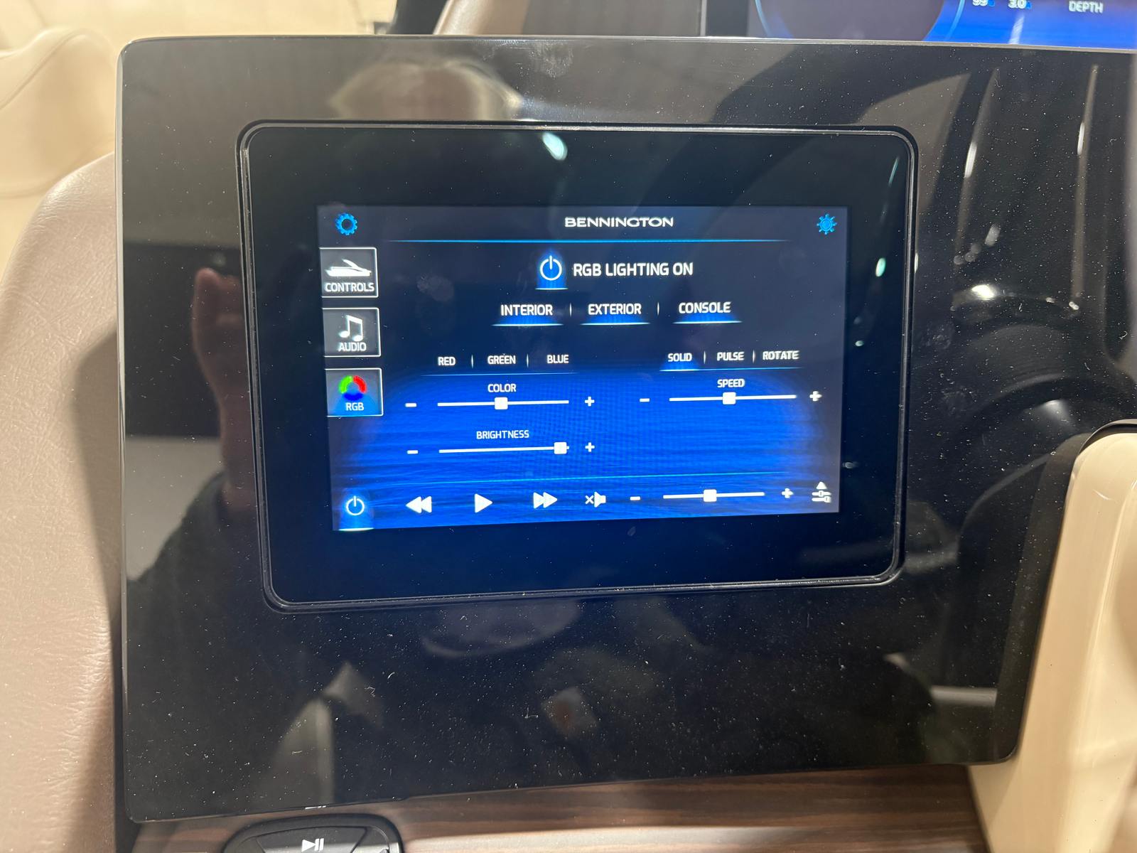 Step aboard and immerse yourself in a world of comfort and entertainment. The Bennington 25 Qsba ESP is equipped with a host of special features that set it apart from other pontoon boats for sale. Enjoy the ambiance created by illuminated cupholders (six in total), underwater lighting, and strategically placed toekick lights in varying lengths (1-41", 1-62", and 2-72"). These lighting elements not only enhance the boat’s aesthetic appeal but also provide practical illumination for evening cruises and social gatherings.The interior is a showcase of luxury, featuring Zebrawood Matte Beige accents and base pillowtop diamond-stitched upholstery (Q) for superior comfort and style. The interior accent in perforated espresso adds a touch of sophistication, creating an inviting atmosphere for passengers. Blackout logos give the boat a modern, sleek look that complements its overall design.For music lovers, the Bennington 25 Qsba ESP boasts a premium audio system with Rockford Fosgate 6.5" M2 speakers (six on the boat and two on the arch), a powerful 10" M2 subwoofer, and a PM Punch amplifier upgrade. Whether you’re hosting a party or enjoying a quiet sunset cruise, the sound quality ensures every moment on board is accompanied by your favorite tunes in crystal-clear detail.