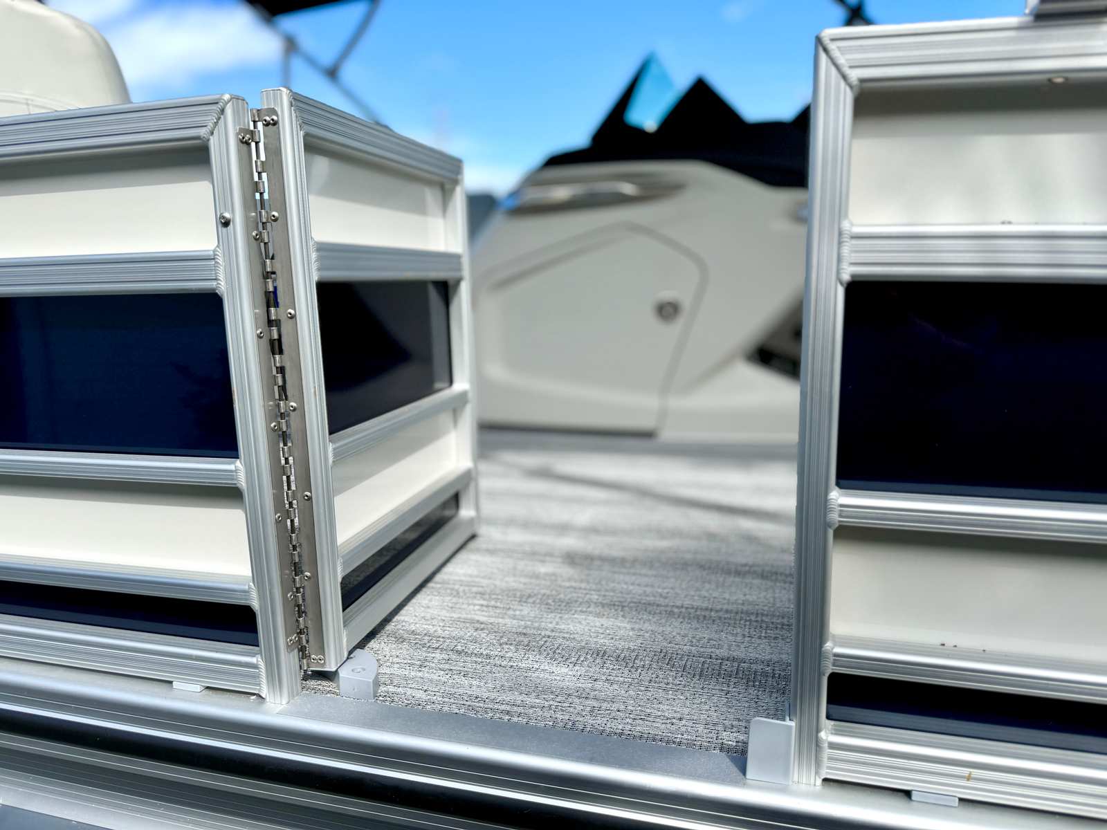 Beyond its impressive aesthetics and performance, the Bennington 25 RFB ESP is designed with practicality in mind. The generous length provides ample storage for gear, water toys, and refreshments, keeping the deck clutter-free and organized. The power hydraulic assist steering makes docking and maneuvering a breeze, even for less experienced boaters, while the efficient 4-stroke V6 engine delivers reliable power with optimal fuel efficiency.The Benny Quick Fender Latch Kit streamlines the process of protecting your boat when docking, saving time and effort so you can focus on enjoying your day. The integrated lighting enhances safety and visibility during evening outings, allowing you to extend your adventures well into the night.