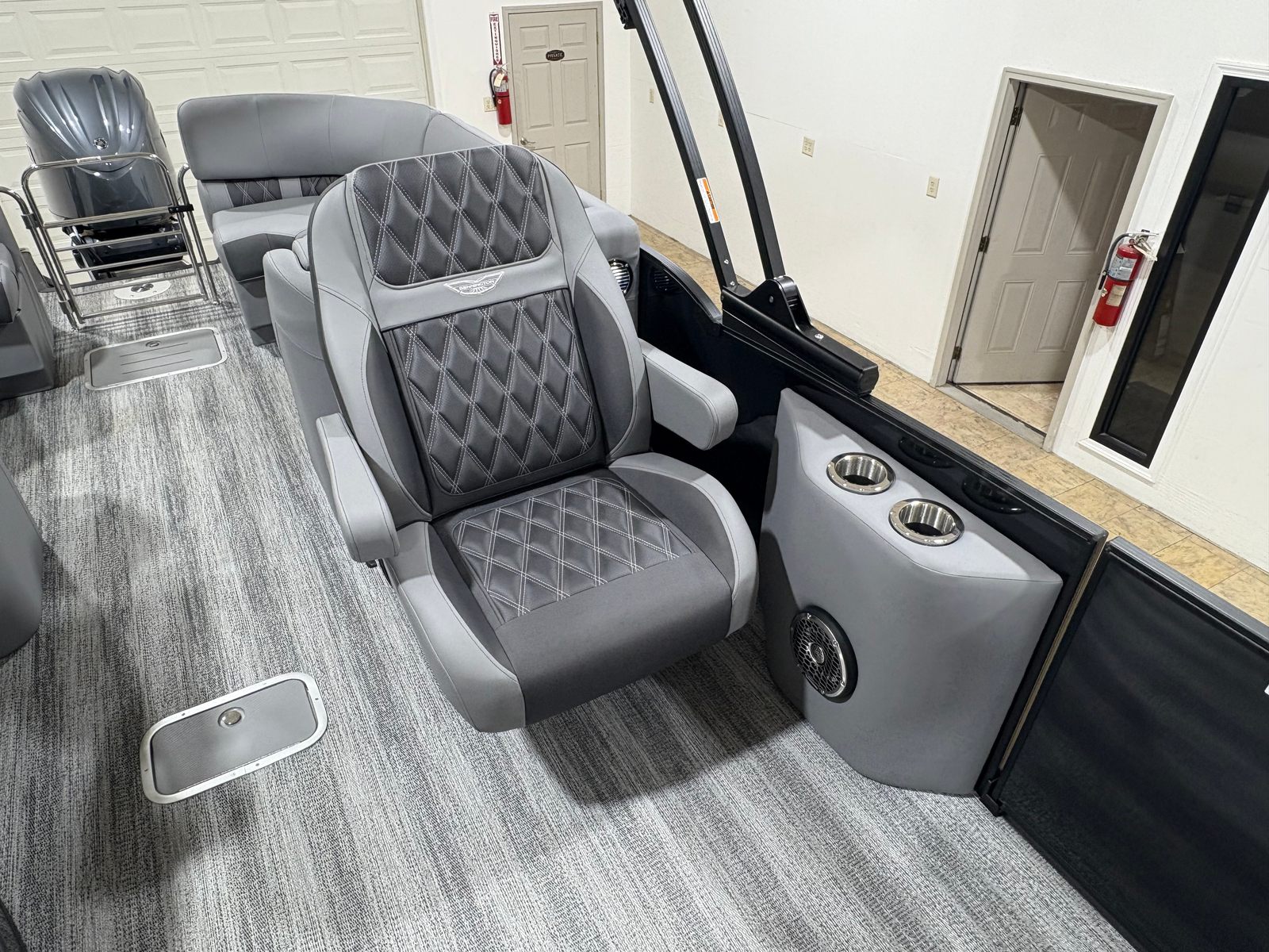 Step aboard and discover a world of luxury and innovation. The Bennington 25 RFB ESP is equipped with a suite of special features designed to elevate your on-water experience. Eight illuminated cupholders ensure your favorite beverages are always within reach, even during evening cruises. Exterior side lighting and underwater lighting create a captivating ambiance, transforming your pontoon into a floating oasis after sunset. Toekick lights, including two 37-inch and two 62-inch strips, add a touch of elegance and safety, illuminating pathways for guests.The electric power top Bimini, finished in a sleek curved R black design, provides effortless shade and protection from the elements at the touch of a button. The audio system is a true standout, featuring Rockford Fosgate 6.5-inch M2 speakers, two 8-inch M2 speakers in the fastback, a powerful 10-inch M2 subwoofer, and a dual 901826 PM Punch amplifier upgrade. This premium sound setup ensures your favorite playlists sound crisp and immersive, whether you’re anchored at your favorite cove or cruising along the shoreline.