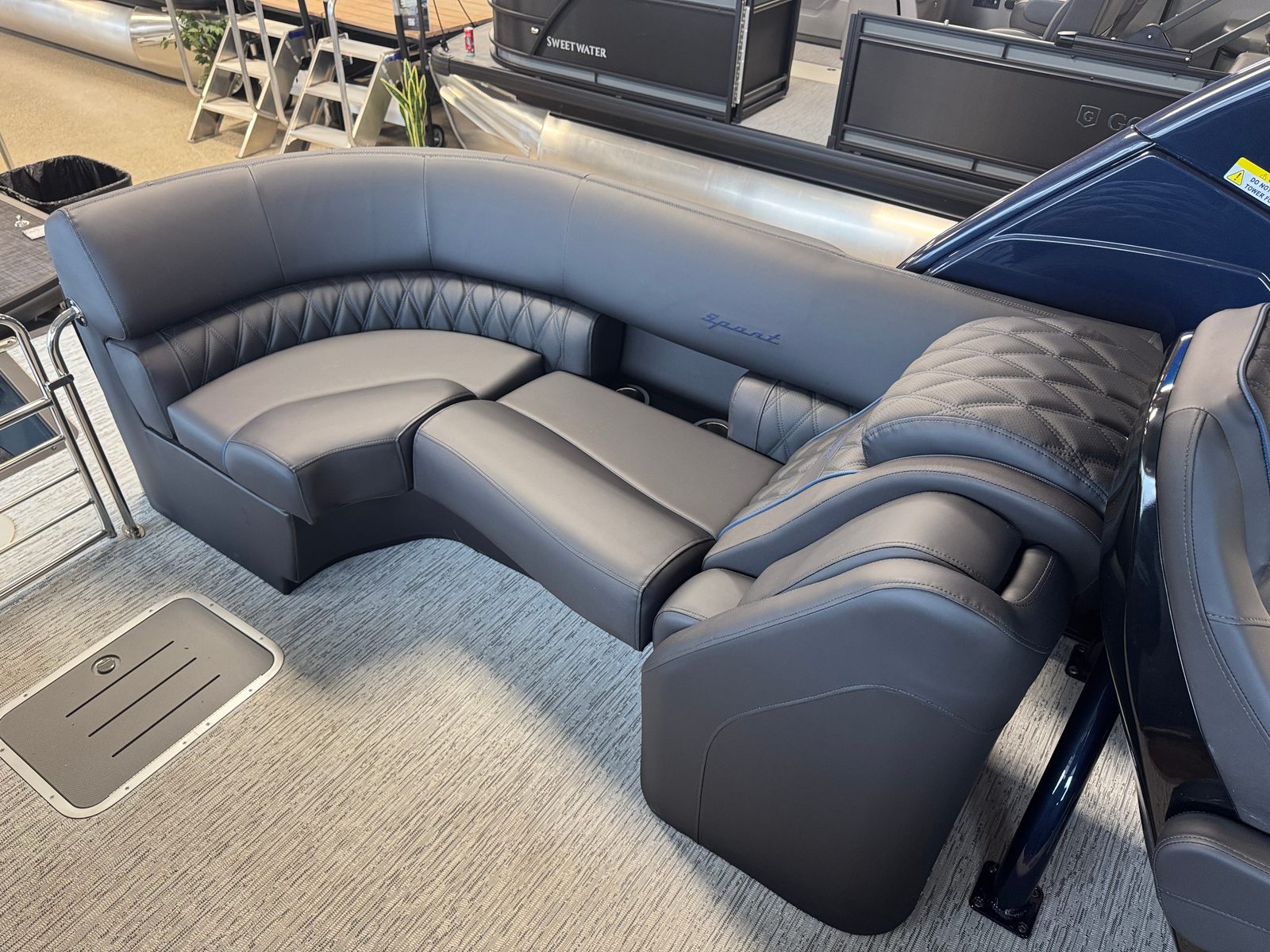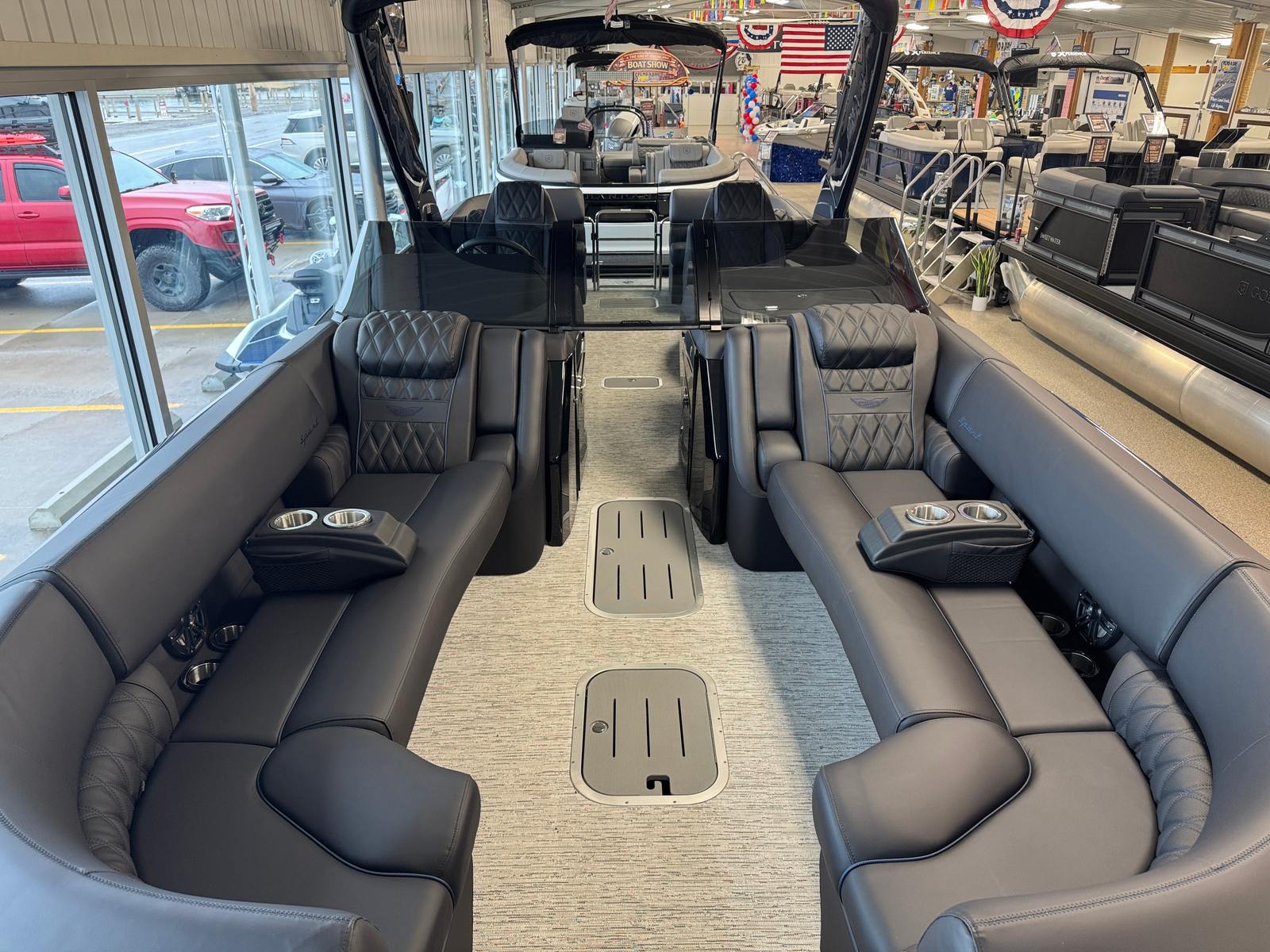 The 2026 Bennington 25 Rxfbwa ESP is loaded with special features that enhance both aesthetics and functionality. The removable flag pole with an American flag adds a patriotic touch, perfect for holiday weekends and special occasions. Exterior side lighting and toekick lights (2-37" and 2-62") create a captivating ambiance for evening cruises, making your boat stand out on the water and ensuring safe movement around the deck after sunset. The Rockford Fosgate 6.5" M1 Arch Speakers deliver premium sound quality, transforming your pontoon into a floating entertainment hub. Every detail, from the Gemini Black panel to the Phantom/Phantom interior accents, is thoughtfully chosen to provide a luxurious and comfortable environment.