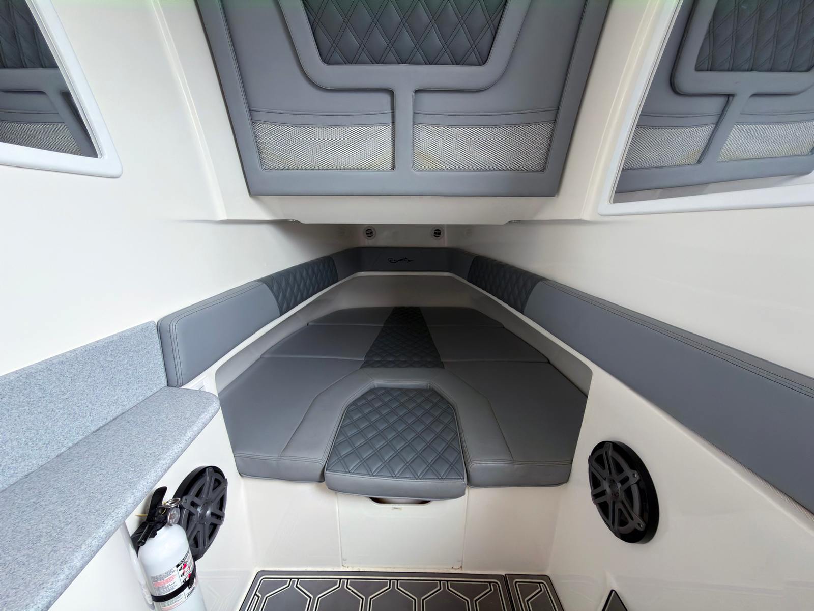 At the helm, the boat presents exactly as a premium offshore machine should, with a clean dash layout, large Garmin displays, Mercury controls, and excellent visibility. The forward seating area adds comfort for guests, and the interior cabin space offers a practical retreat with berth seating, cabinetry, countertop space, and the amenities expected in a boat of this caliber.